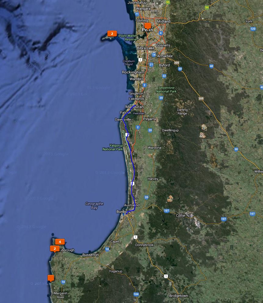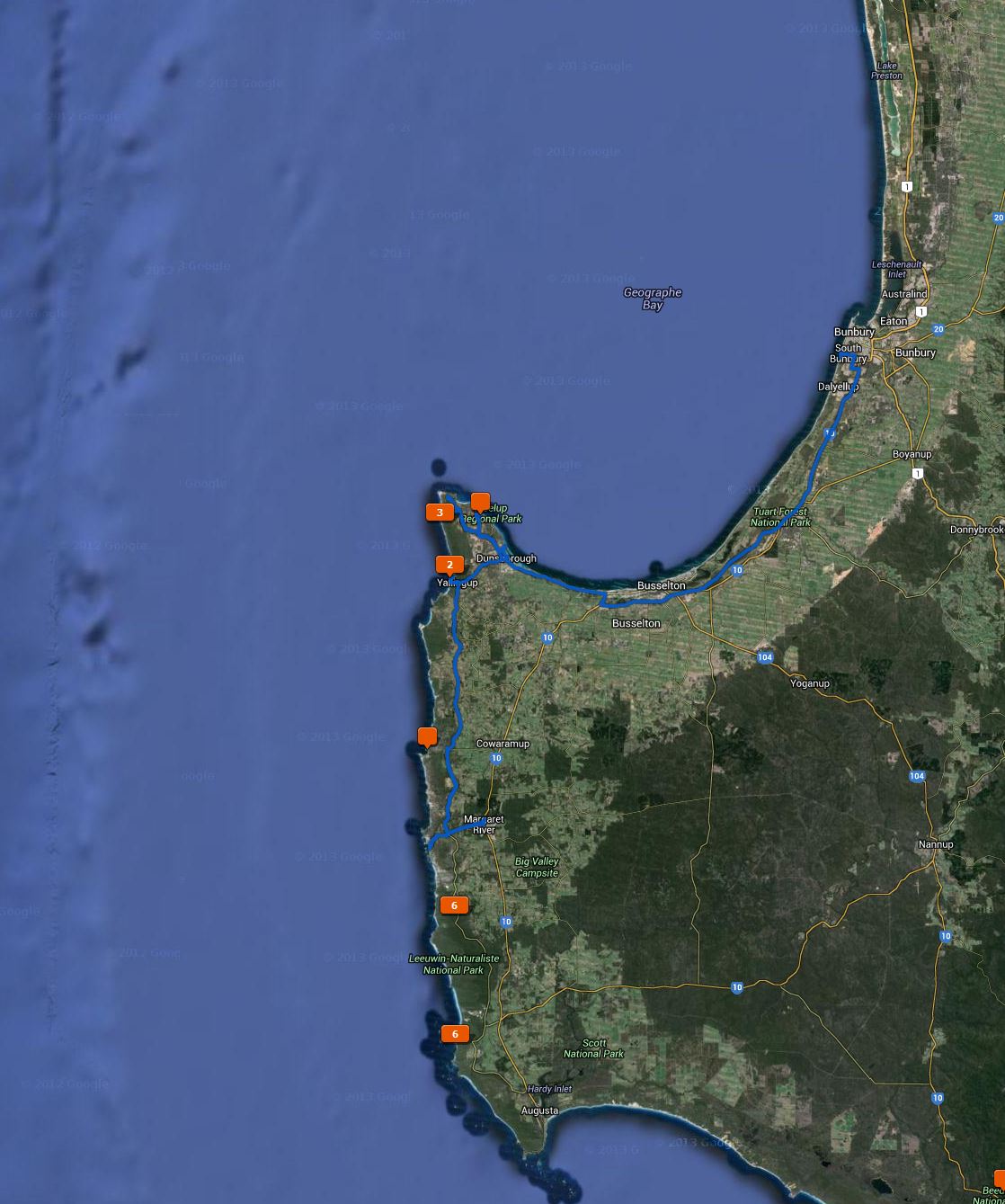 Die vielfältigen, weissen und paradiesischen Strände an der westlichen Geographe Bay sind durch das Cape Naturaliste von den strengen SW-Winden geschützt und daher ein Paradies zum Baden. Dunsburough, Eagle Bay und Co. sind ein verführerischer Platz für perfekte Strandferien. Für die Taucher hat man vor der Küste ein künstliches Riff erzeugt, indem man (mindestens) ein Schiff versenkt hat. Die 40 ’natürlich‘ gesunkenen Schiffe reichten wohl nicht.