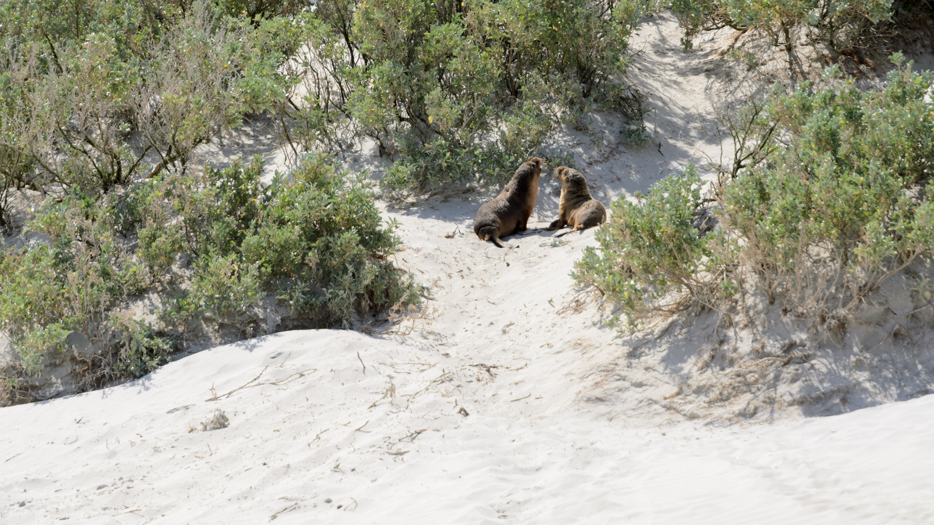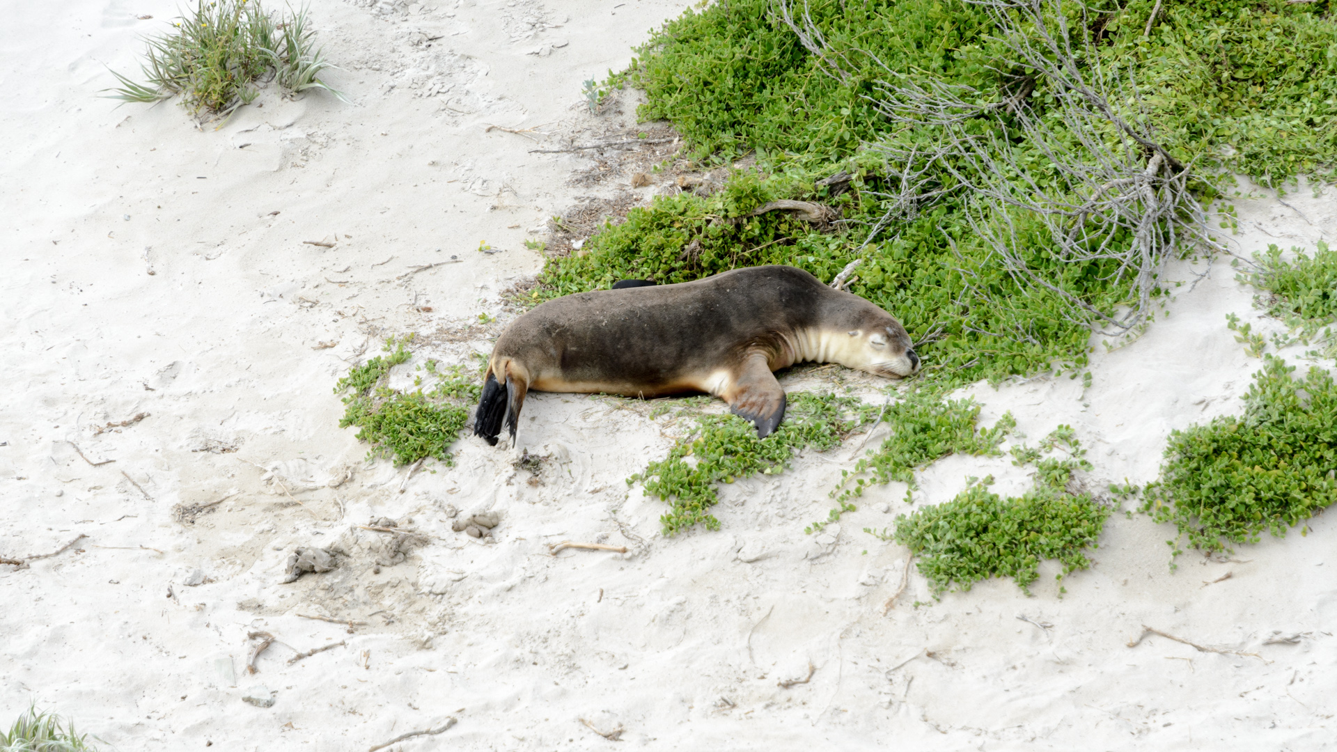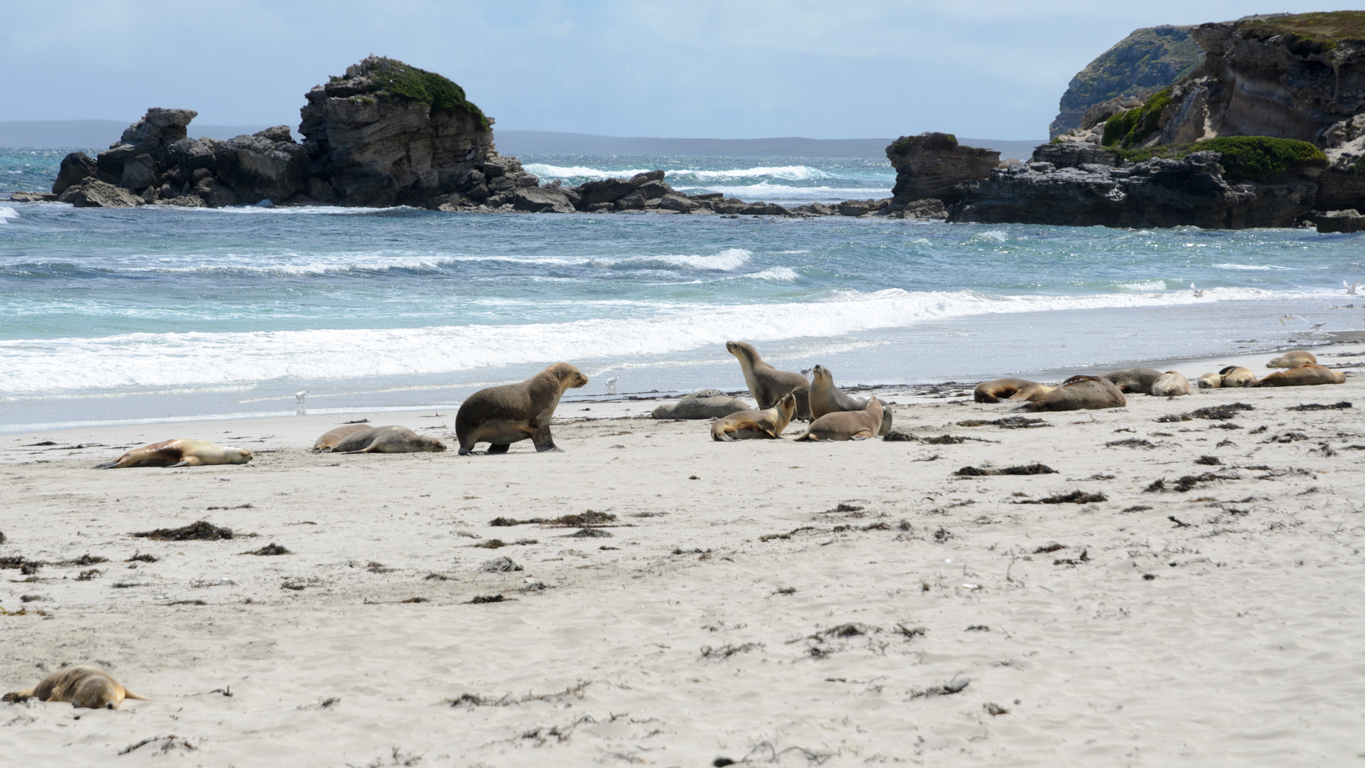 Auf Kangaroo Island kann man die drittgrösste Kolonie von australischen Seelöwen hautnah (10m Abstand) in Seal Bay erleben. Die Seelöwen haben sich an die von Rangern geführten Menschengruppen gewöhnt, sodass sie nur dann auf schauen, wenn sich das Muster der Menschengruppenbewegung vom Üblichen abweicht.