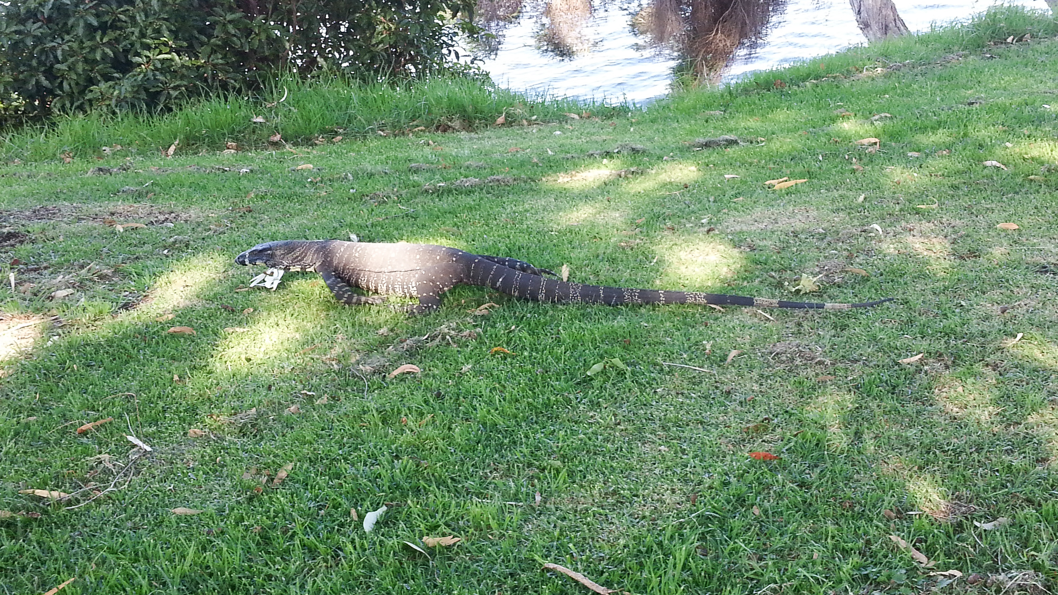 Ich war beim Camp Kitchen (mit WiFi Antenne) am sehr gemütlichen Download der Apps für die Wiederinbetriebnahme meines Tablets, da tauchte ein Goanna (Waran) auf. Der war etwa 1m lang und ich konnte gerade noch ein paar Bilder mit der Smartphone-Kamera machen.
