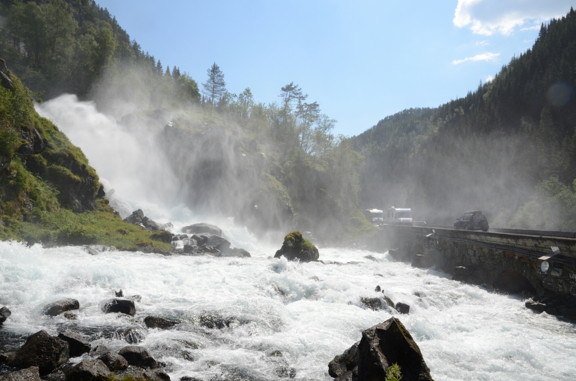 Am beeindruckenden Låtefossen kommen alle Fahrzeuge gratis durch die Waschanlage!
