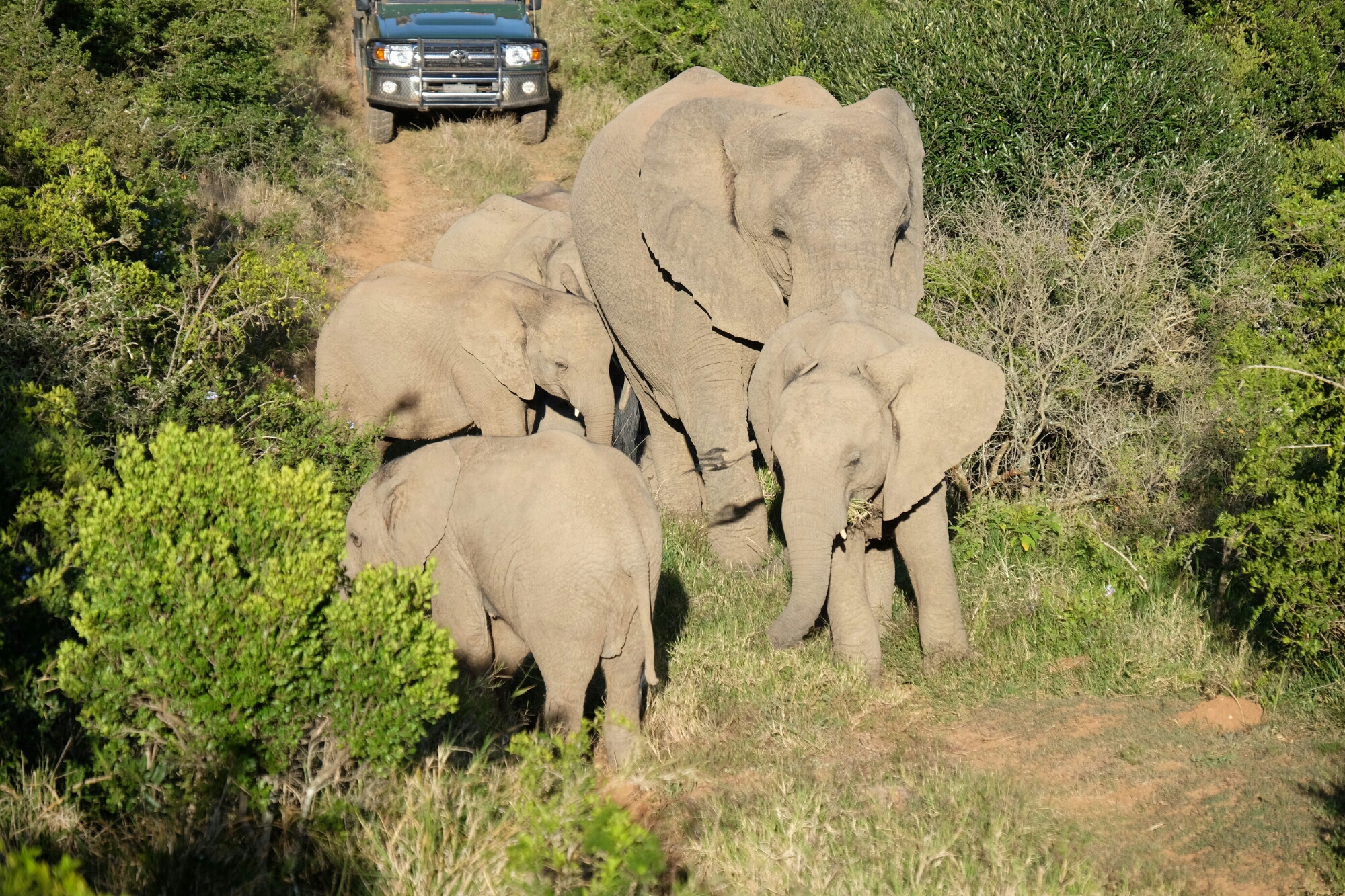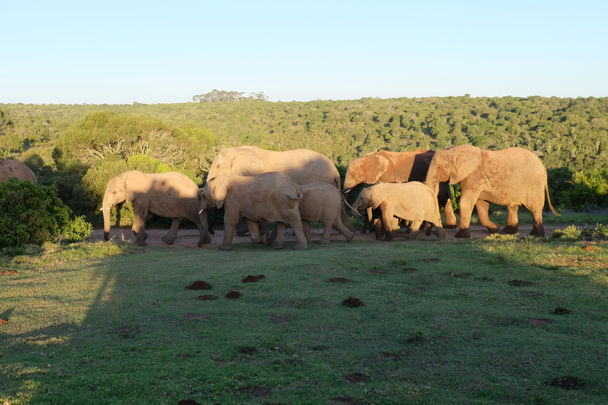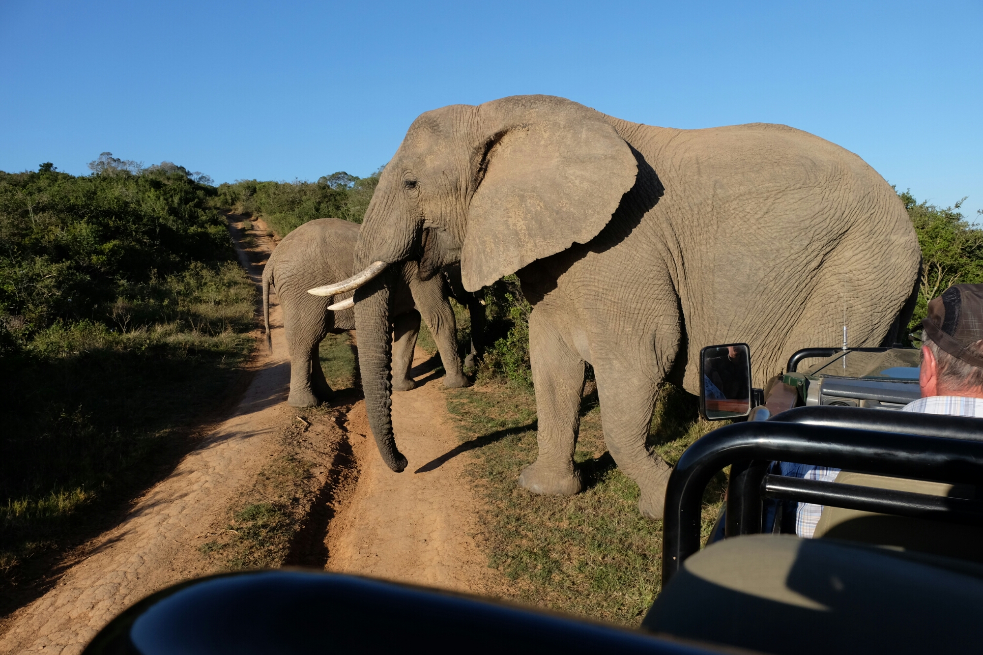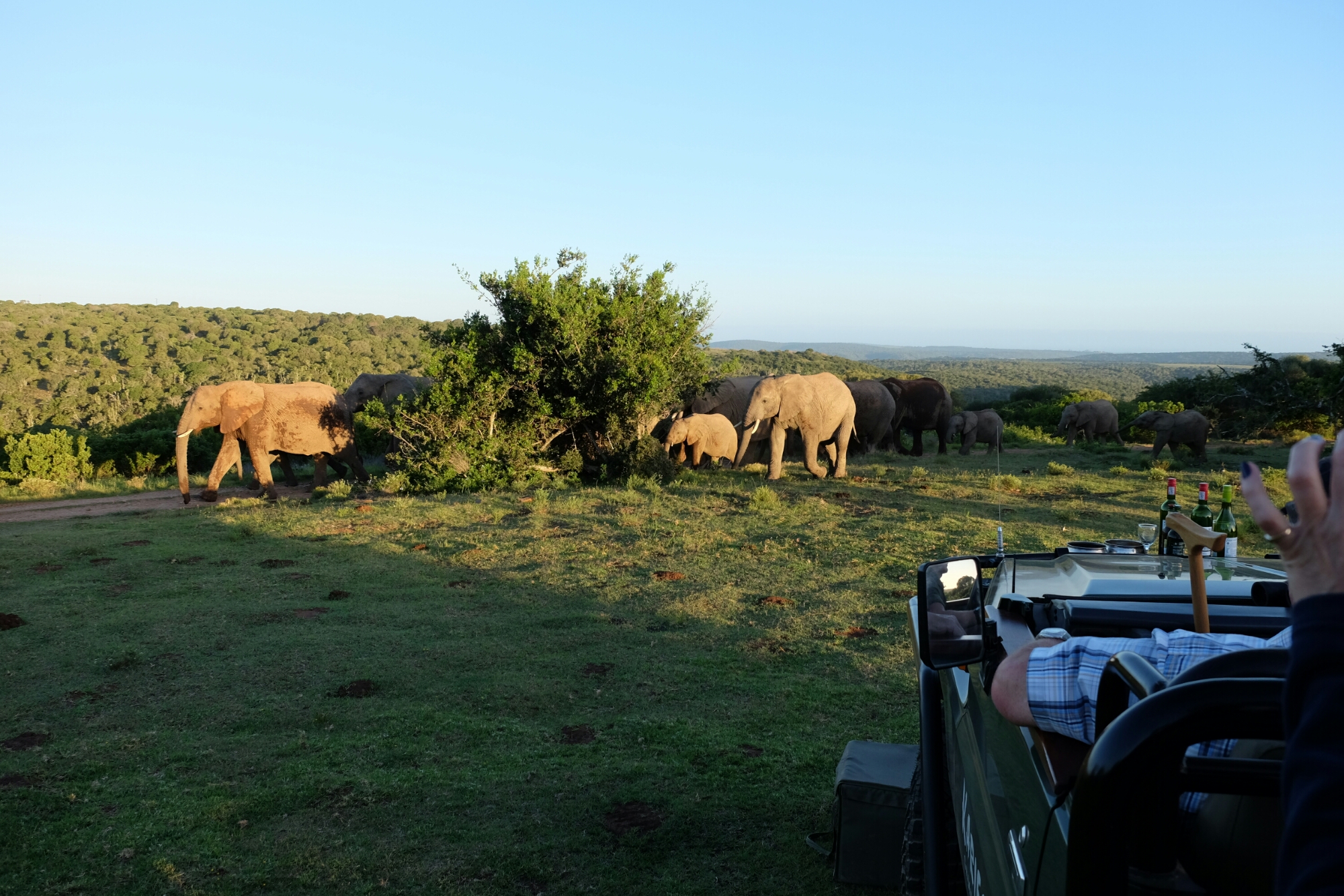 Die Weinflaschen stehen immer noch vorne auf dem Auto… Als einzelne Menschen hätten uns die Elefanten kaum so ignoriert.