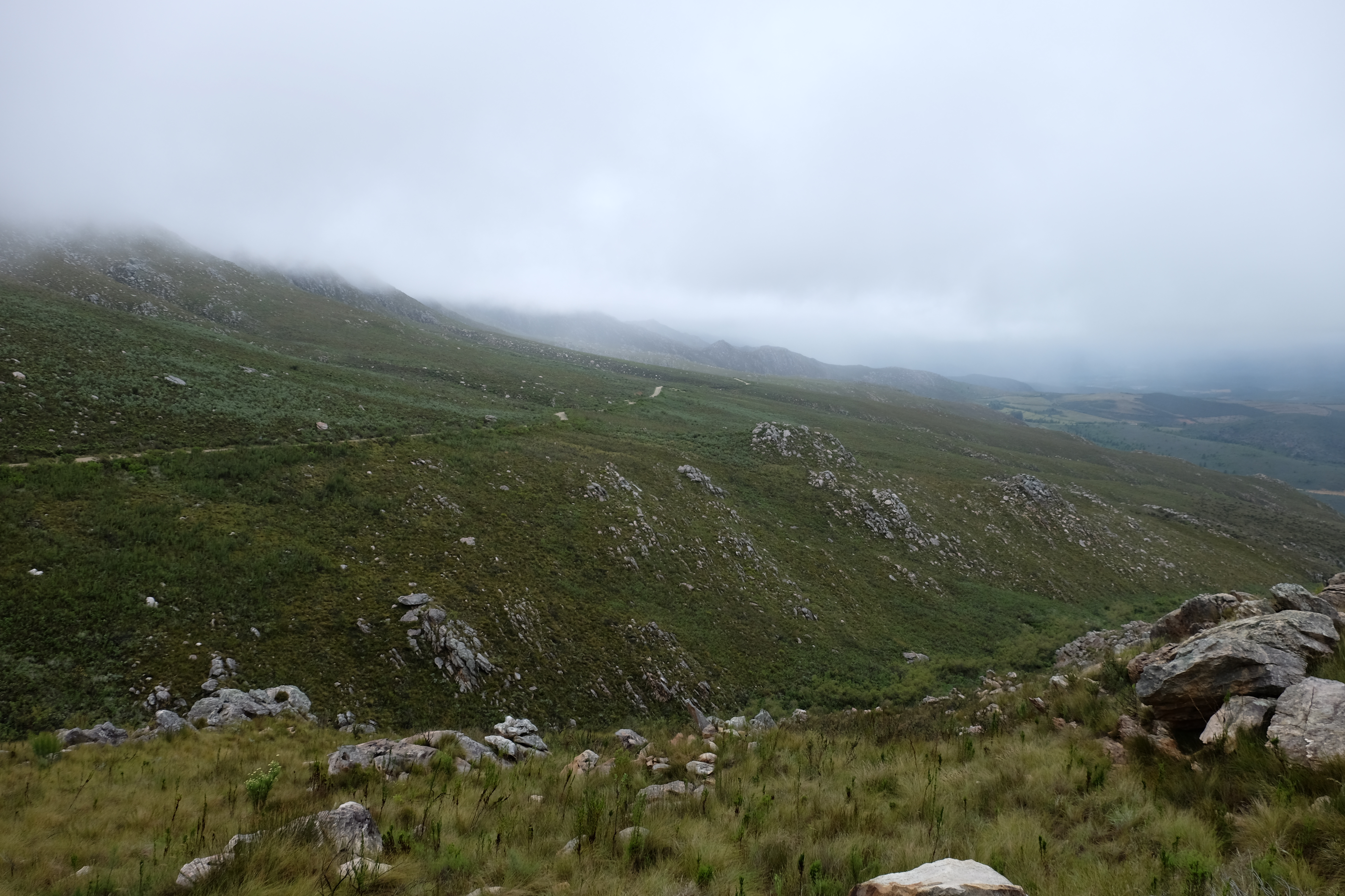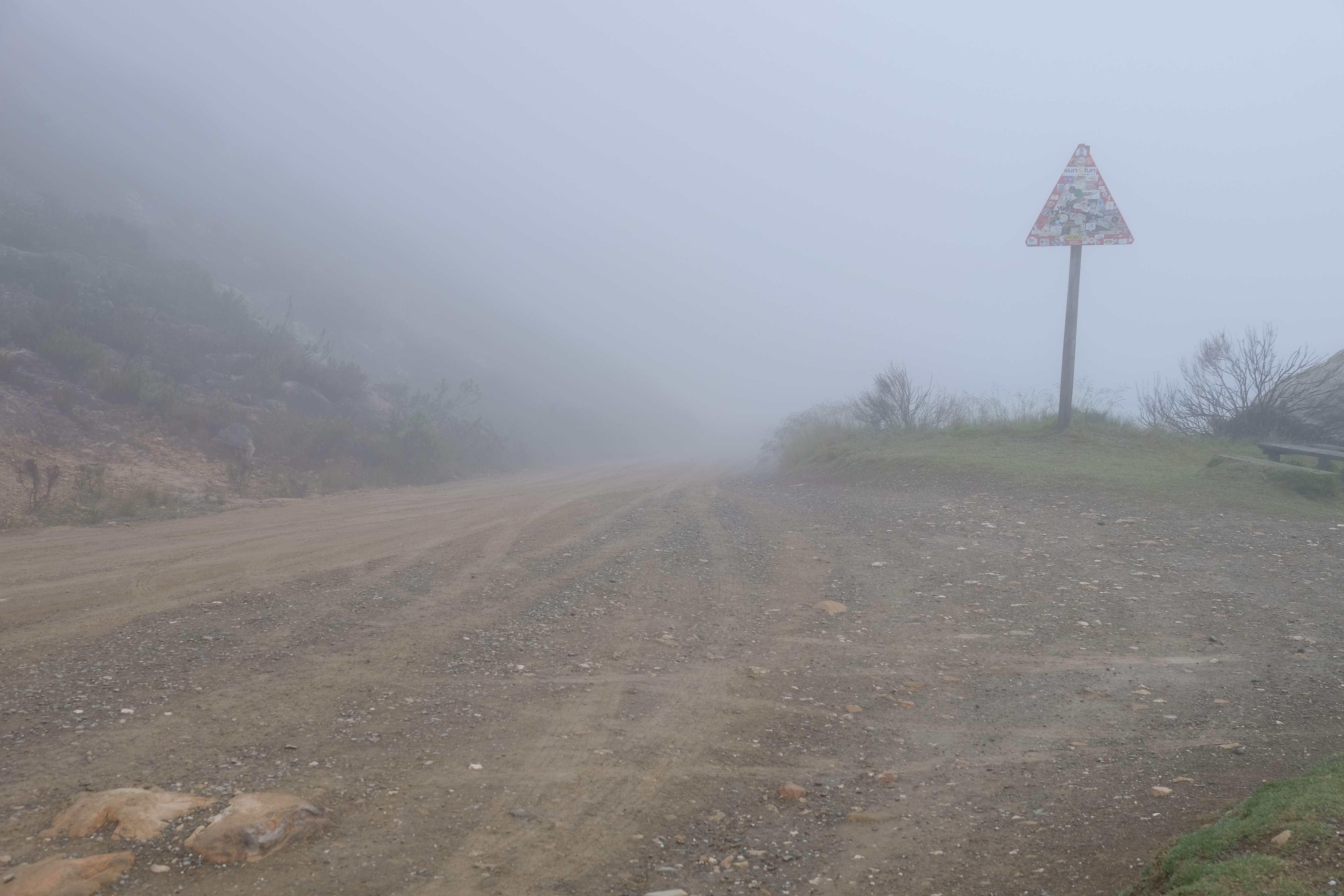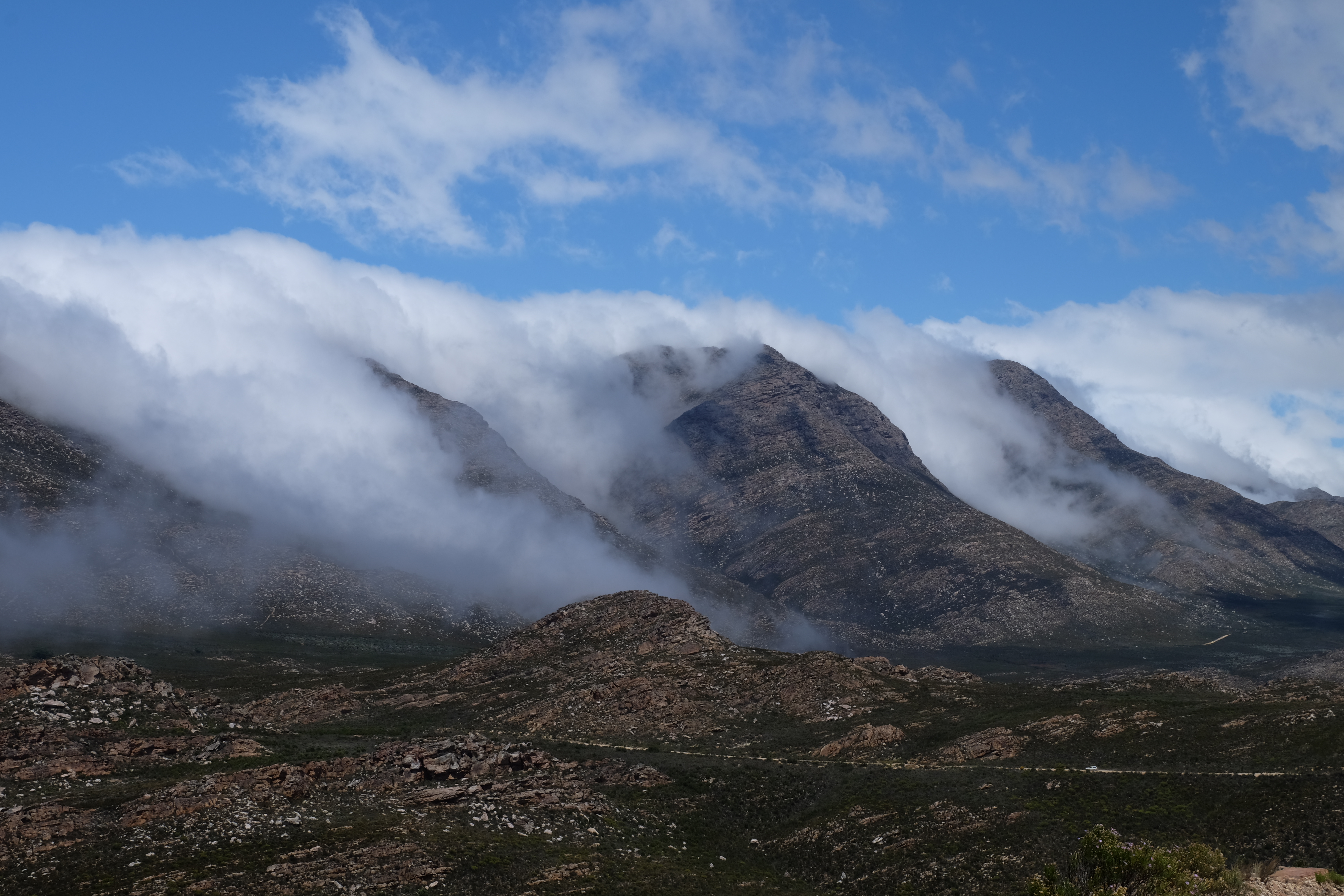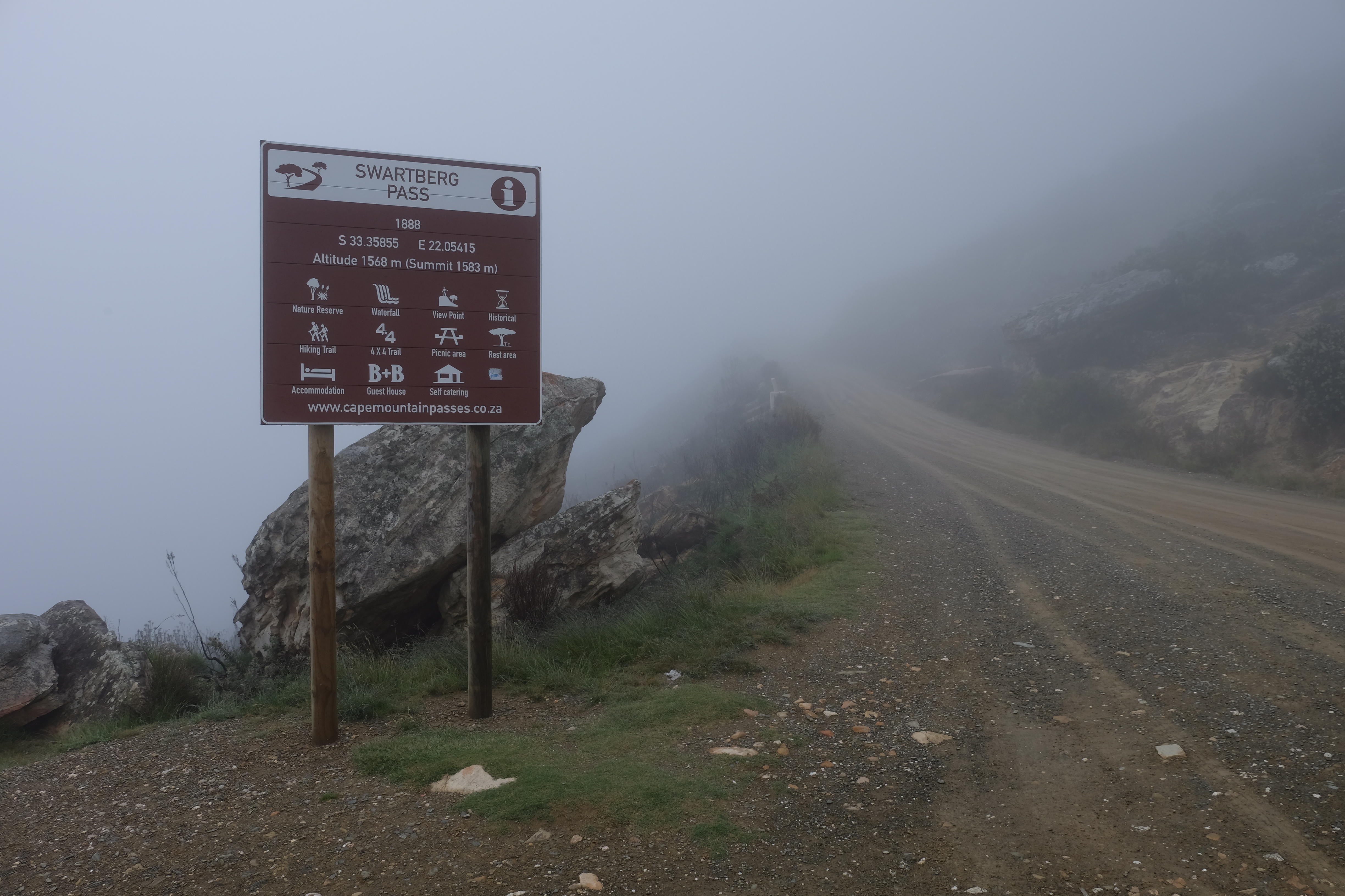 Da es heute über der Klein Karoo bedeckt ist, durfte ich auf der Südseite in die Wolken hineinfahren. Mein Auto hat dabei eine schöne Dreckschicht von der leicht matschigen Strecke erhalten…