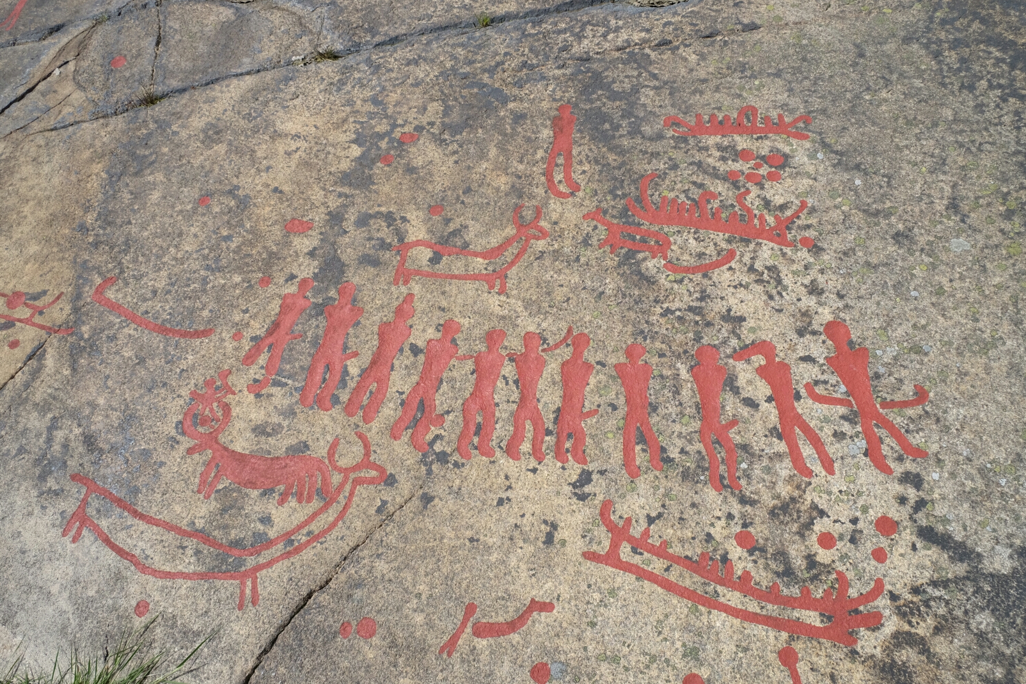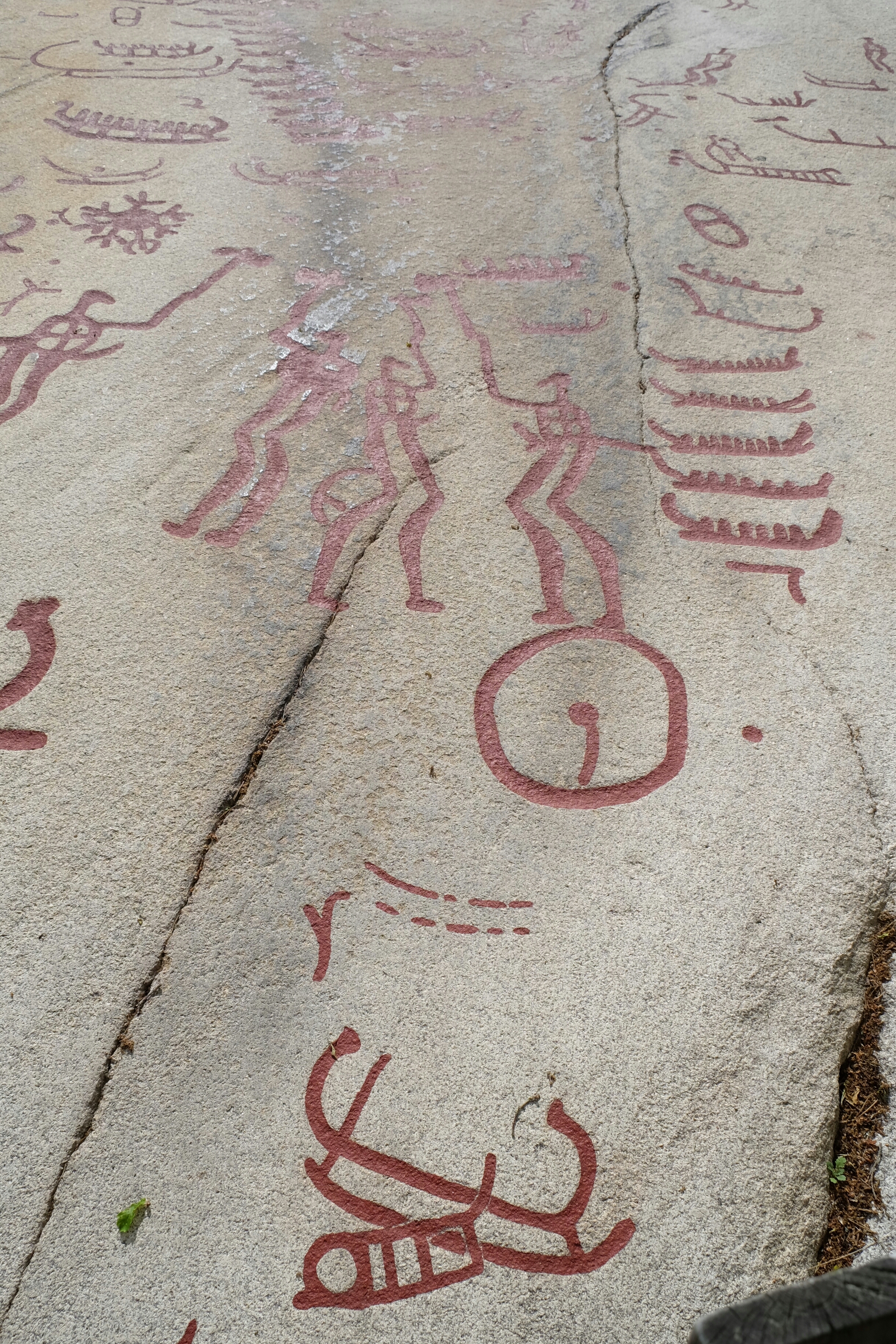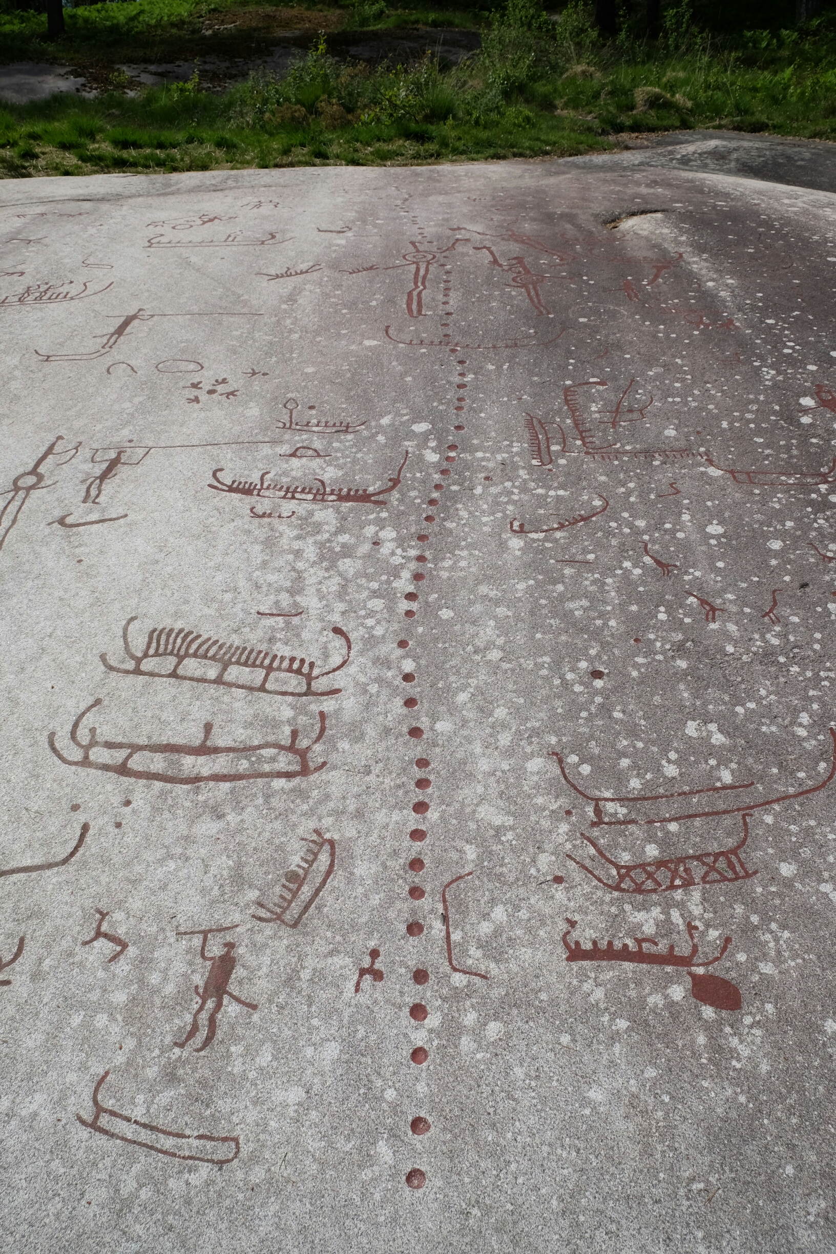 Die Bronzezeitmenschen haben sich in diesem Gebiet eindrücklich verwirklicht. Das ist so etwas wie eine riesige Freiluftgallerie. Die Felszeichnungen entstanden alle an der Küste. Schweden hebt sich seit dem Wegschmelzen der Eislast der Gletscher der letzten Eiszeit immer noch weiter an. Daher sind die Zeichnungen nun nach 2500-3000 Jahren ziemlich weit im Landesinneren.