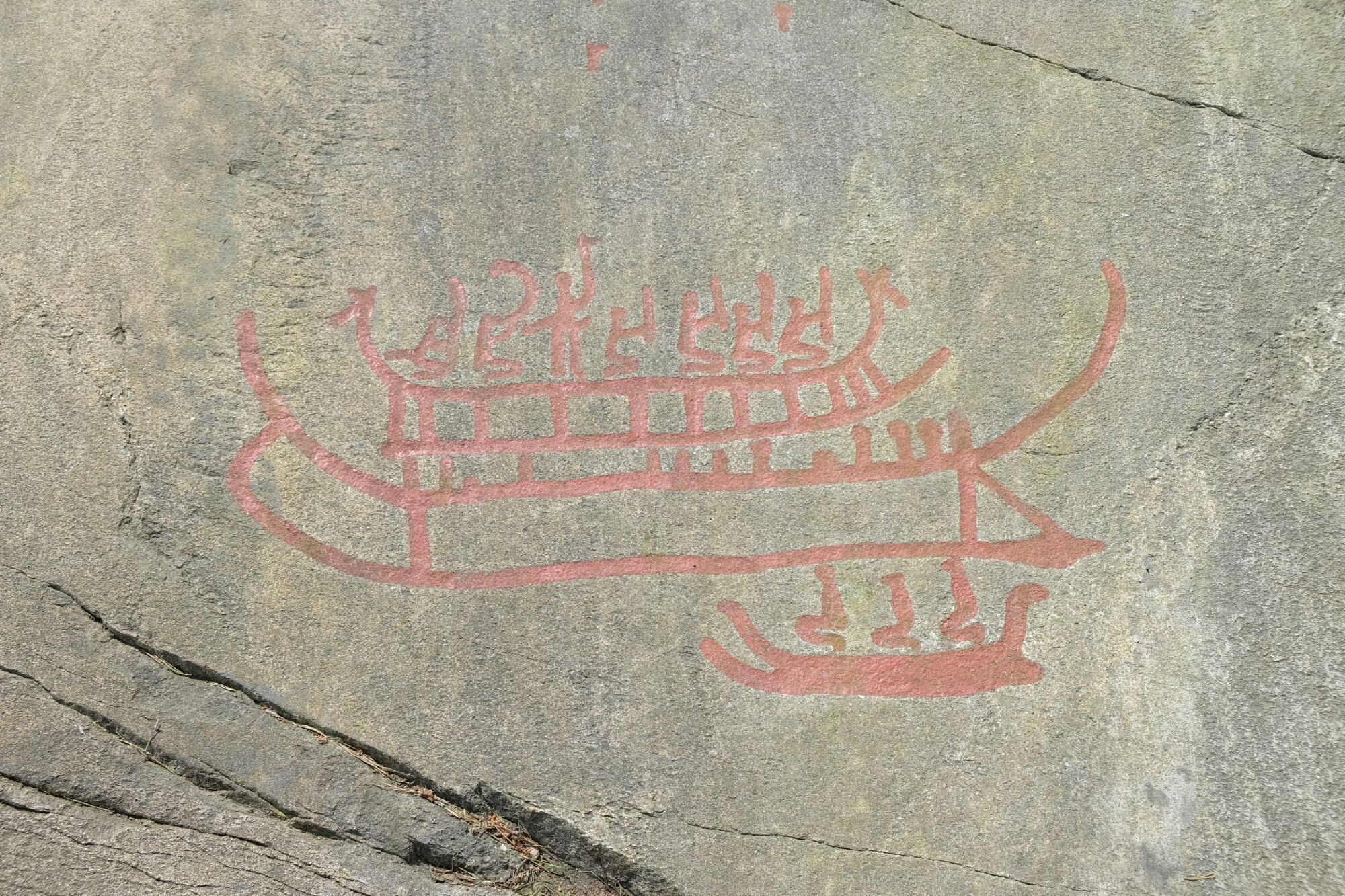 Litsleby: Über eine grosse Komposition mit Schiffen, Tieren und Menschengestalten wurde eine speerschwingende Riesenfigur darüber geritzt. Ein Gott, ein Superkrieger?