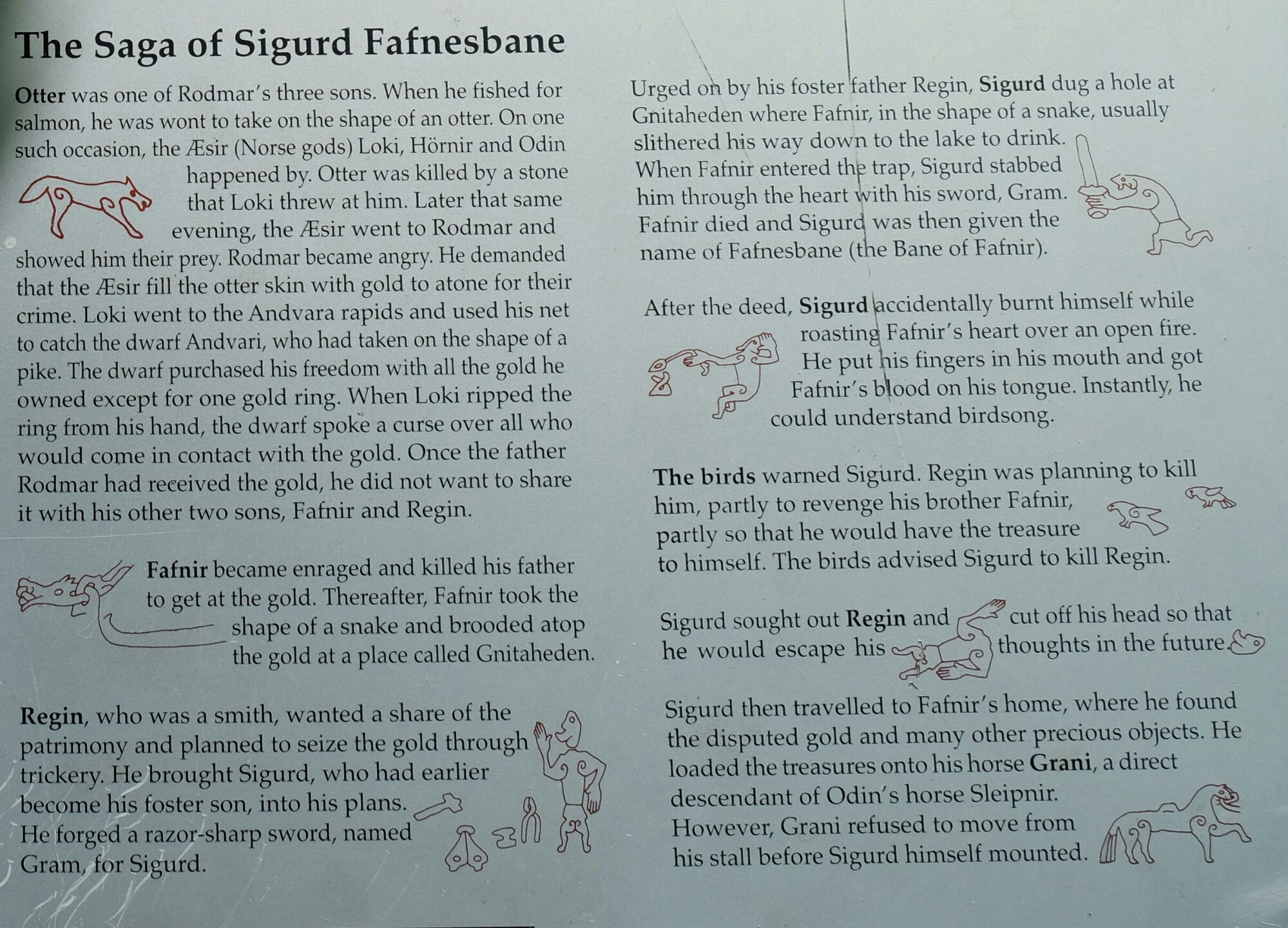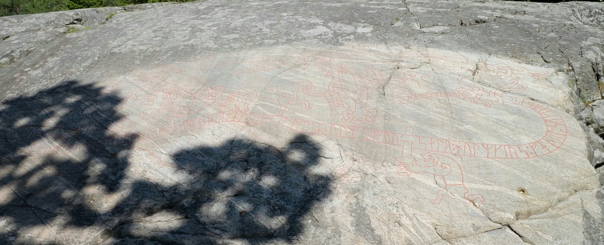Die Erzählung von Sigurd (in der Niebelungensage ist es Siegfried) wurde hier vor etwa 1000 Jahren zur Wikingerzeit auf einer geneigten Granitplatte mit Runen in einer Form einer Schlange und dazugehörenden Bildern an einem schon damals viel genutzten Weg dargestellt. Runen wurden in Schweden teilweise bis 1800 verwendet! Die Saga von Sigurd/Siegfried ist in ganz Europa verbreitet.