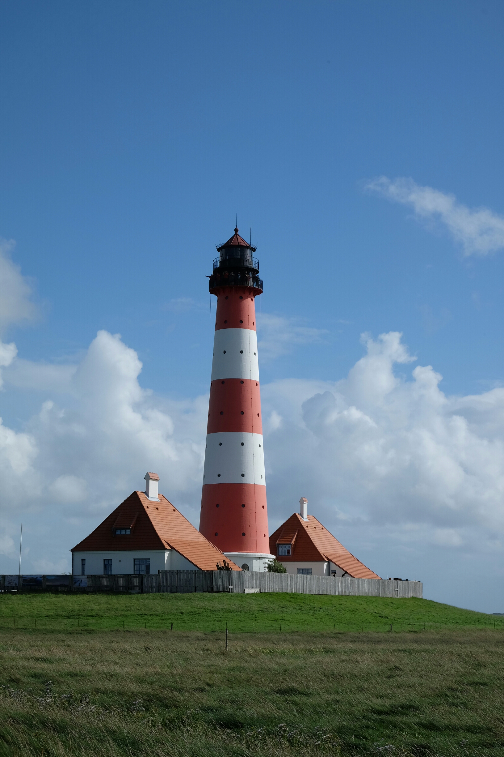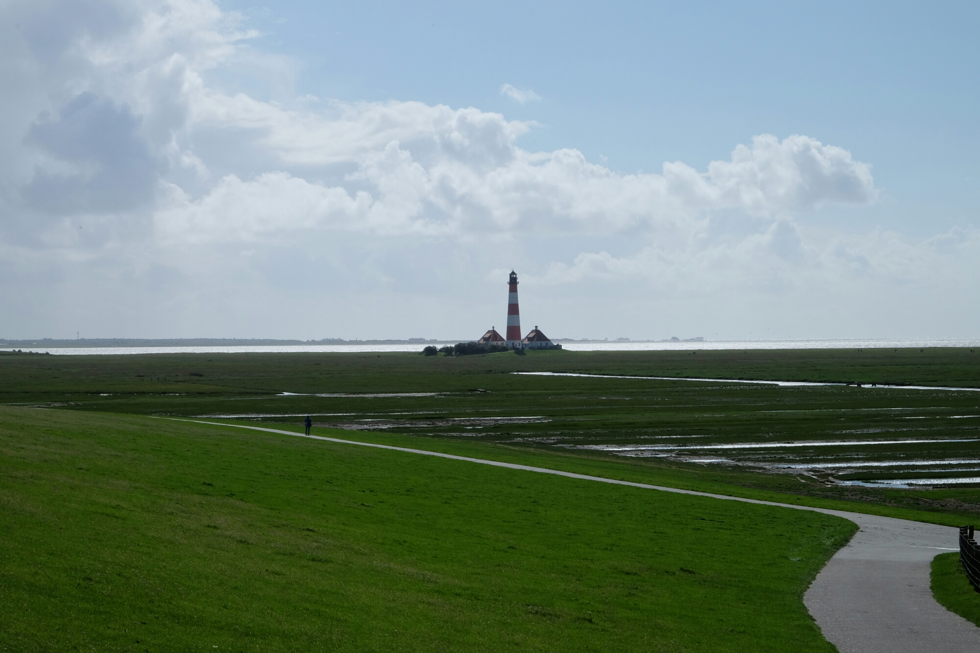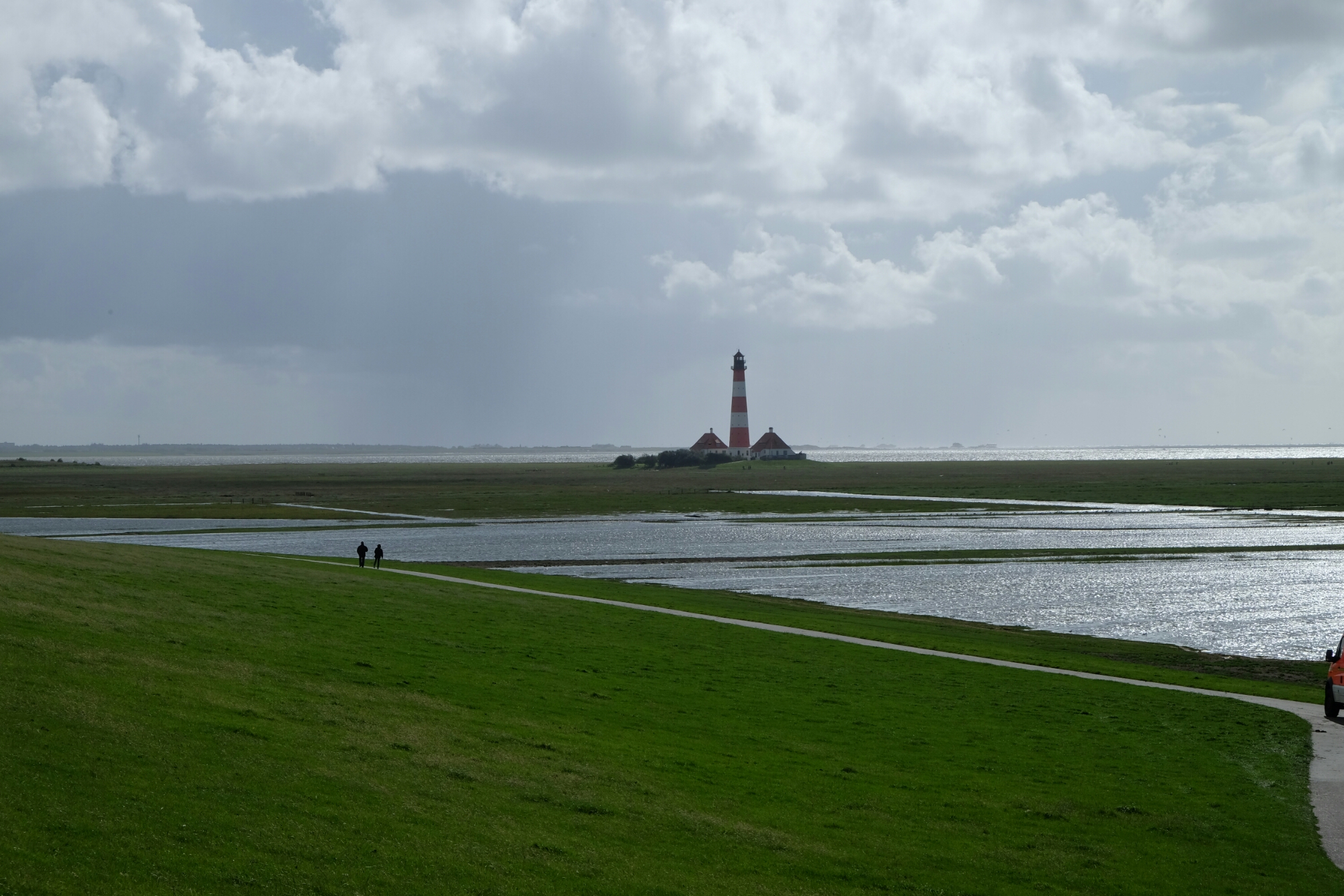 Der Leuchtturm von Westerhever steht hinter dem Deich mitten in der ausgedehnten Salzwiese am Rande des Wattenmeers. Der Leuchtturm wird auf unzähligen Prospekten und Postkarten (gute alte Zeit) abgebildet. Daher wollen ihn natürlich auch viele Touristen sehen. Man parkt vor dem Deich und nimmt den rund (2x) 2.2km langen Weg zu Fuss oder mit dem Velo in Angriff.