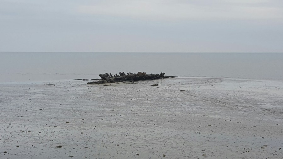 Die zweite Überraschung sieht man nur bei Niedrigwasser: Nicht weit vom Strand entfernt liegt das hölzerne Schiffswrack des schwedischen Dreimastschoners „Mariann“. Das mit dem Niedrigwasser hat heute perfekt gepasst.