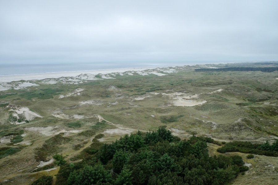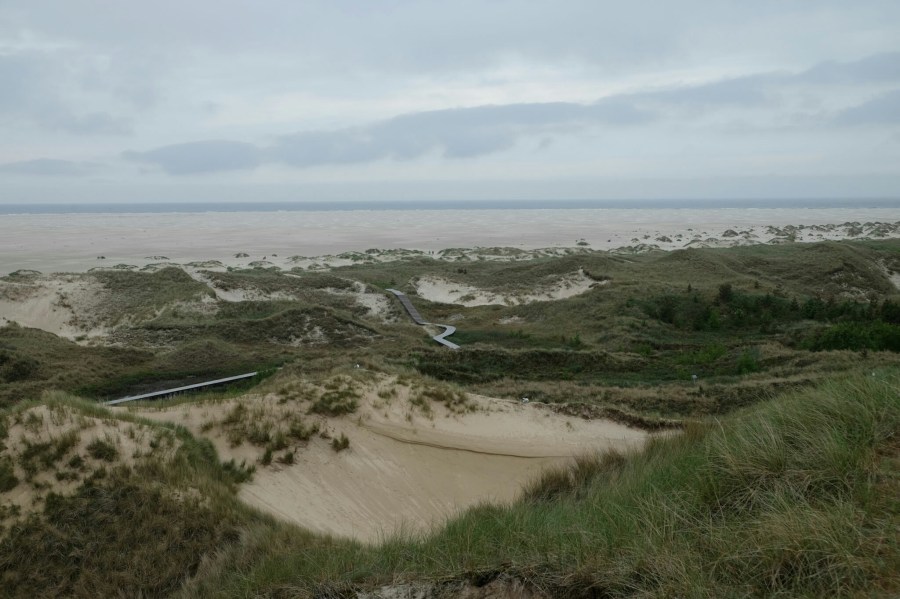 Dann geht’s schon wieder in die Nähe von Wittdün. Auf einer der Plattformen einer Aussichtsdüne kann man den bis zu 1.5km breiten Sandstrand im Westen und Süden von Amrum bewundern. Der Strand ist eigentlich die sich extrem langsam bewegende Seesandbank Kniepsand, welche sich immer mehr an die Insel anschmiegt. Der Kniepsand schützt Amrum sehr gut vor den Naturgewalten. Es muss im Sommer schon etwas komisch sein, wenn man zum Strand mehrere 100m über den Strand gehen muss. Es werden dafür im Sommer extra zwei Bohlenwege gelegt.