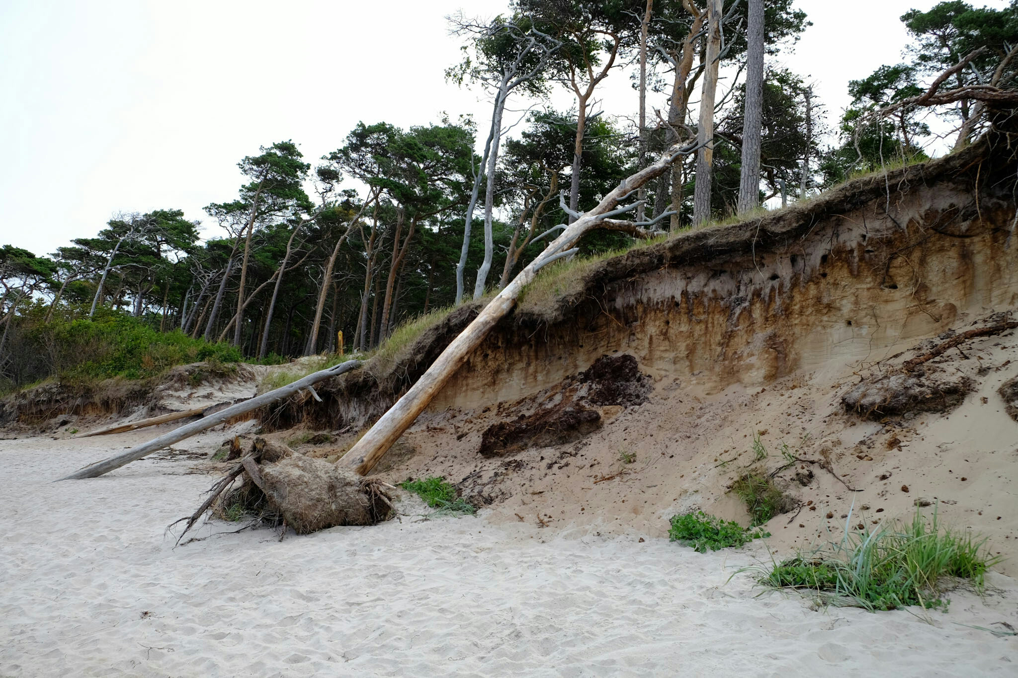 Der Weststrand wird durch die Westwinde und die Strömung gegen Norden Jahr um Jahr ein Stück weit abgetragen. Der abgetragene Sand wird dann im Norden wieder angelandet. Somit ist der Darss zu einem Drittel im Süden (Alt-Darss) die ehemalige Landmasse und die zwei Drittel im Norden (Neu-Darss) sind angelandete Dünenkämme (in West-Ost Richtung) mit ehemaligen Dünenseen, die jetzt aber alle mit Bäumen überwachsen sind. Die Grenze zwischen Neu- und Alt-Darss kann man im Wald als 7m hohe Klippe erkennen. Die Reste der Seen zwischen den Dünenkämmen kann man als Moore auch noch gut im Wald erkennen. Die rund 60km2 Darsser Urwald sind vom Baumbestand sehr vielfältig!