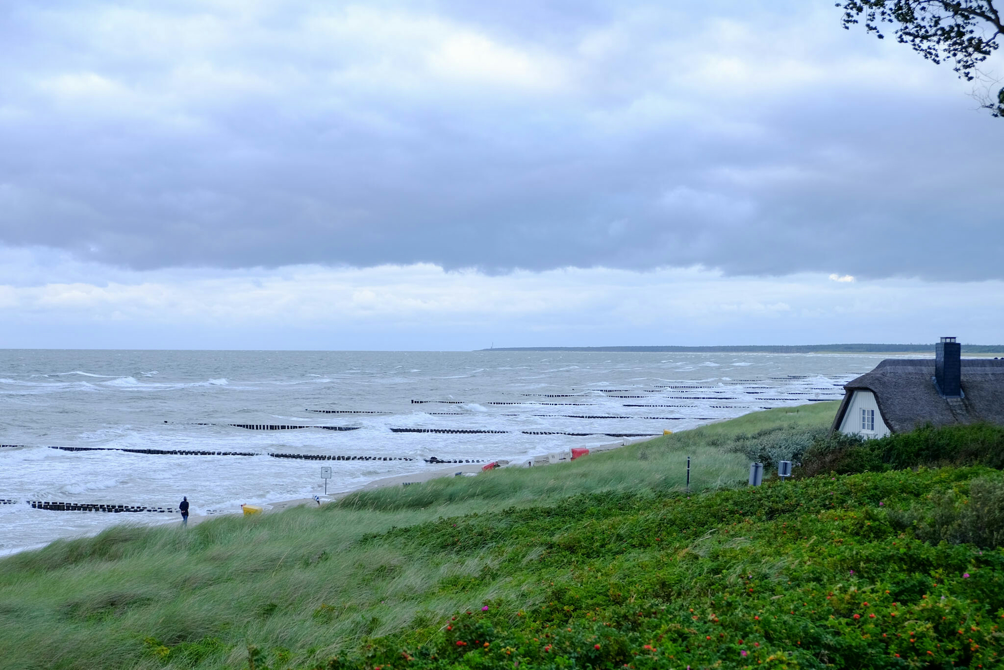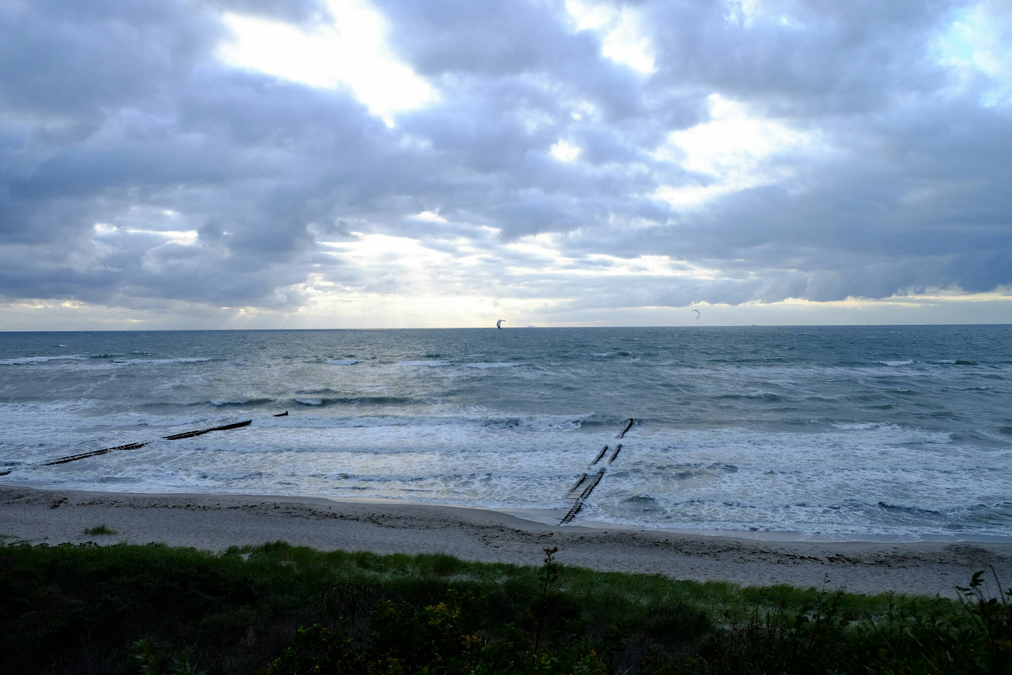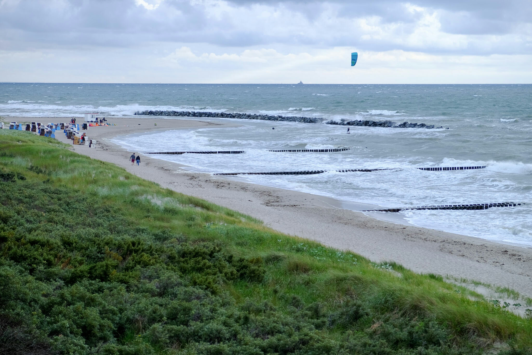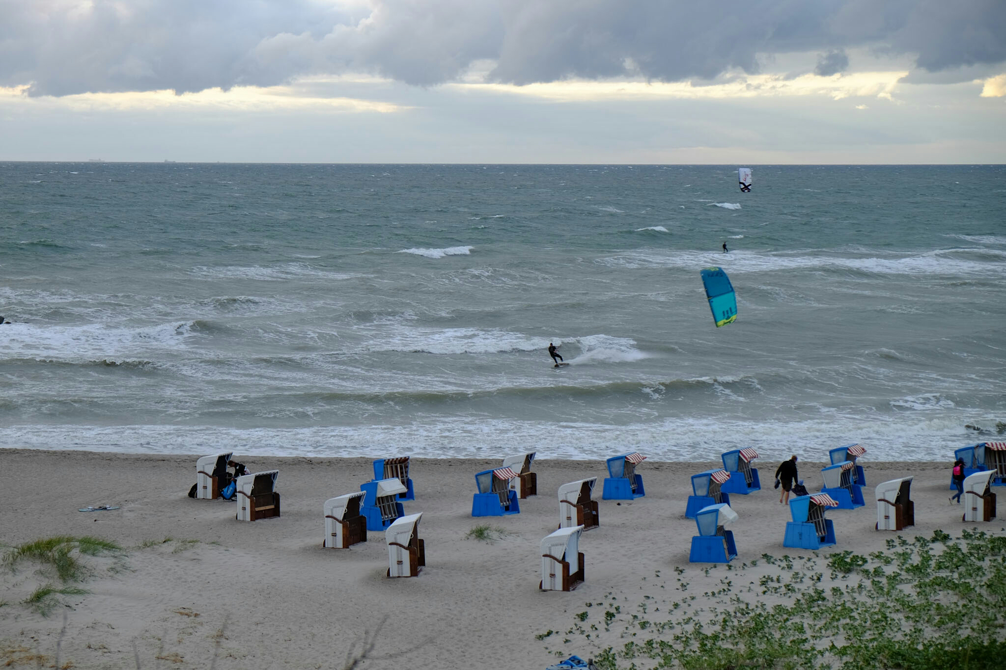 Den heutigen stürmischen Wind spürte man im Windschatten des Darsser Waldes kaum. Aber an der Steilküste von Ahrenshoop blies einem heute Abend eine sehr frische Bise entgegen und der recht hohe Wellengang zog ein paar professionelle Kitesurfer an.