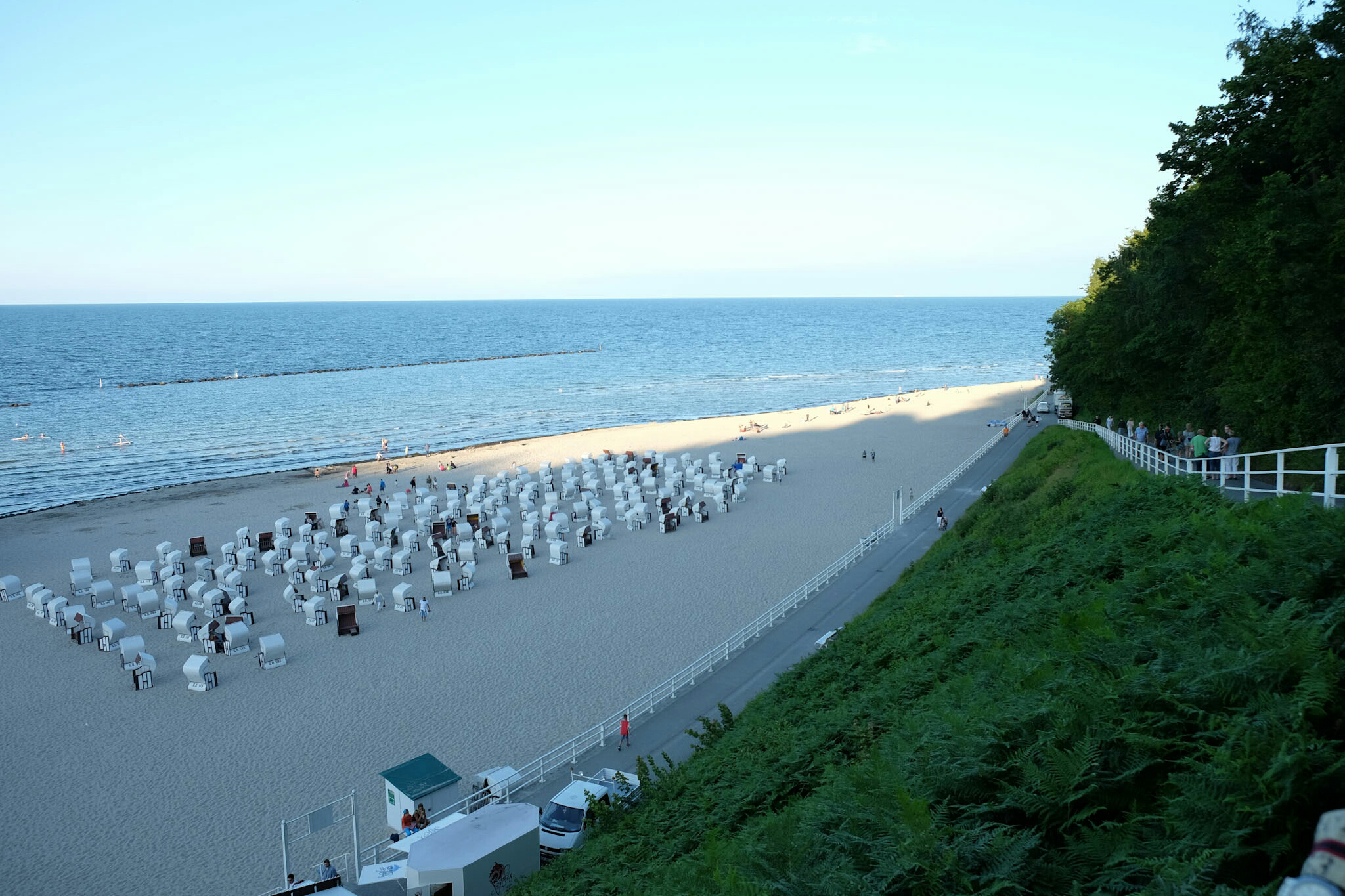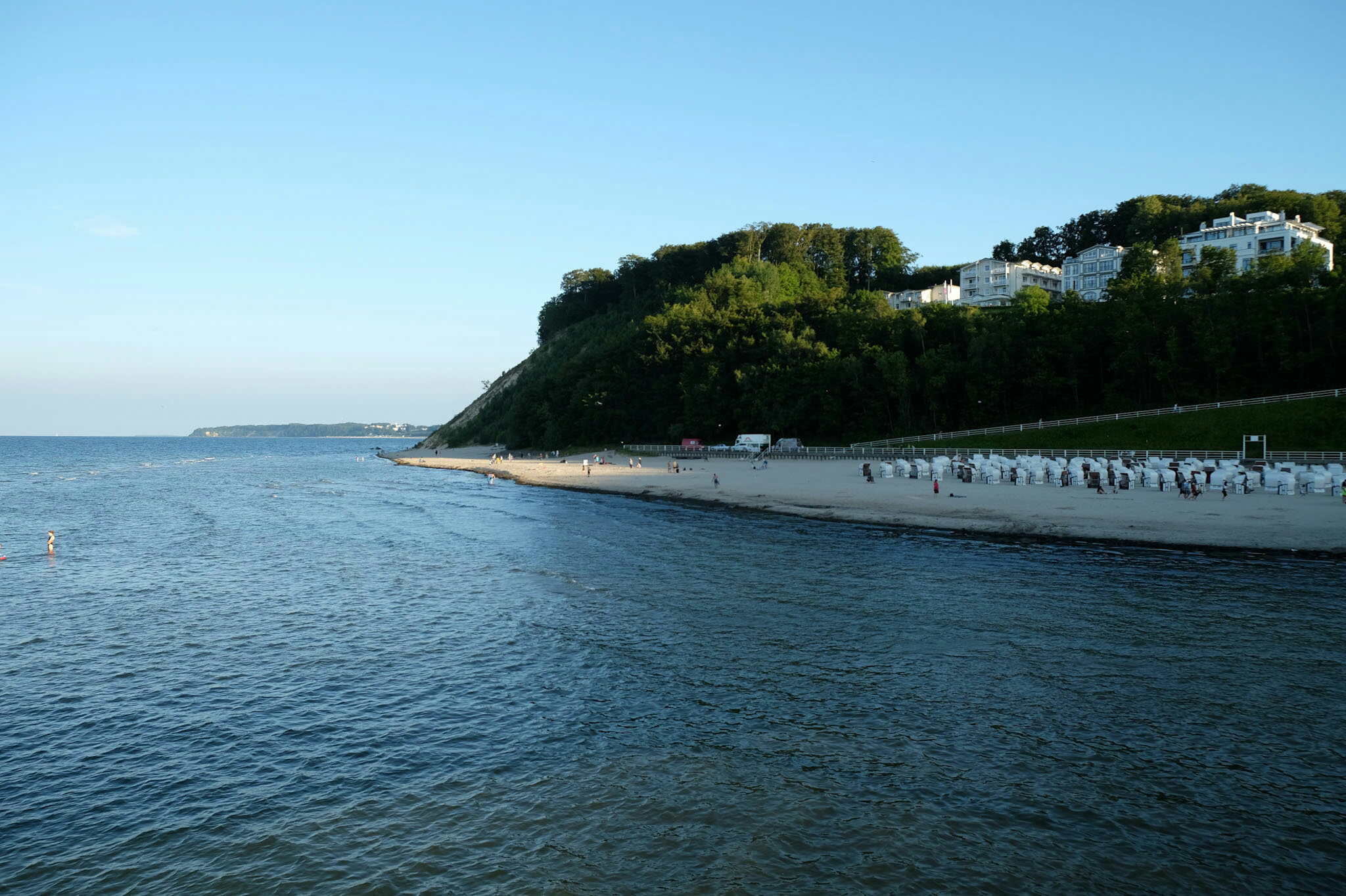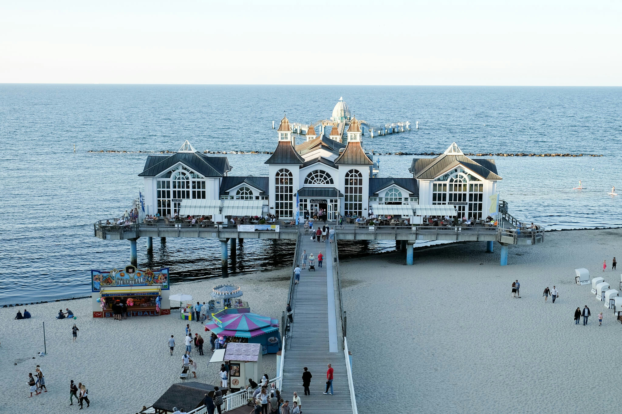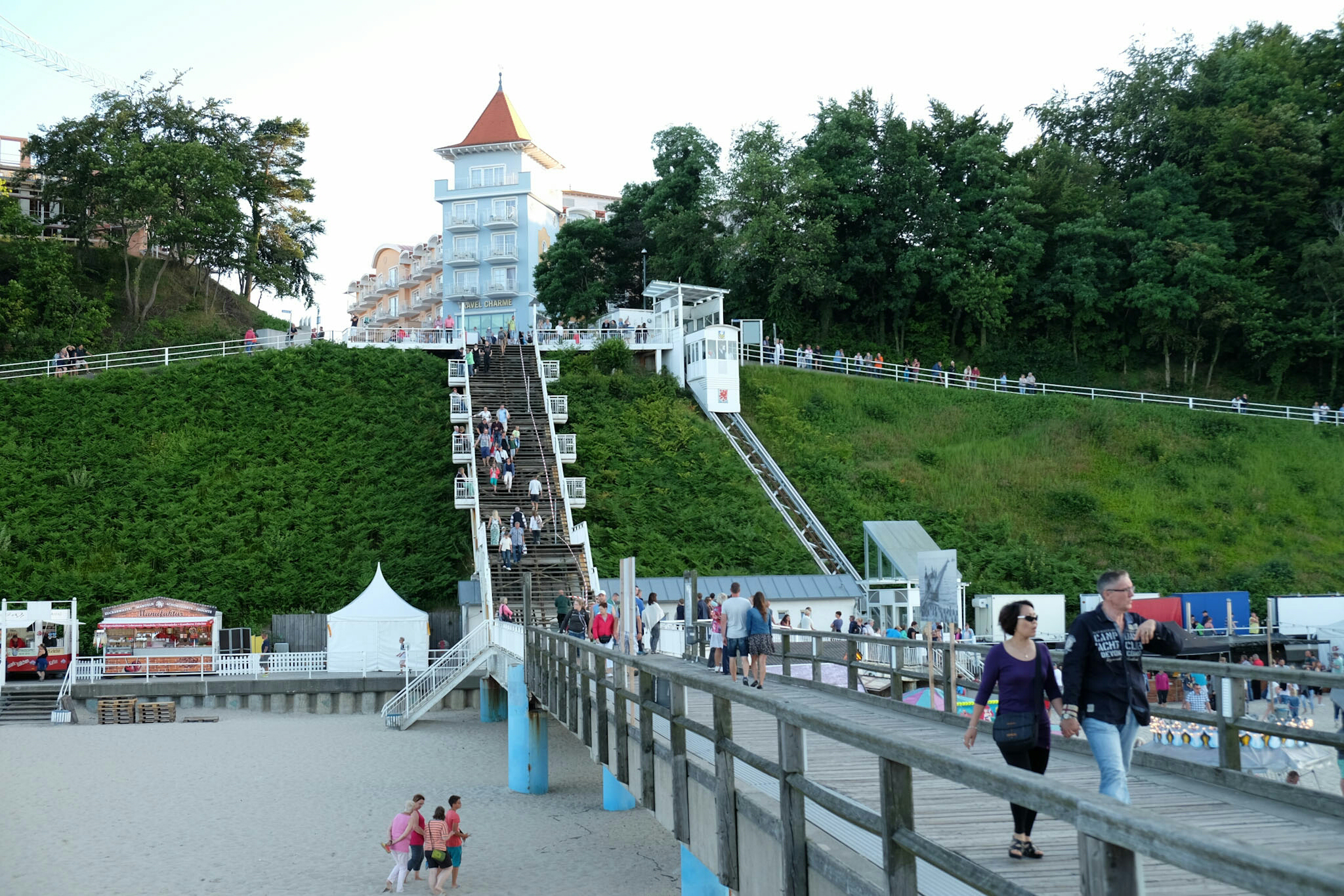 Sellin feierte dieses Wochenende 150 Jahre Badeleben mit Konzerten und einem Feuerwerk. Hoch über dem Strand wollen prachtvolle, weiss getünchte Villen, Hotels und Restaurants bewundert werden. An der unter Denkmalschutz stehenden Wilhelmstrasse reihen sie sich in der Pracht der Bäderarchiktur auf. Am Ende der Strasse taucht die 95 Treppen zählende Himmelsleiter auf (und einem Schräglift), welche zur 1993 nach historischen Vorbildern wieder neu aufgebaute Seebrücke (394m lang, inklusive einer Tauchgondel) führt.