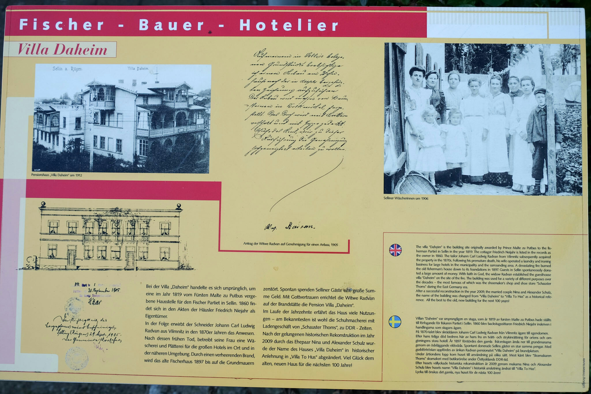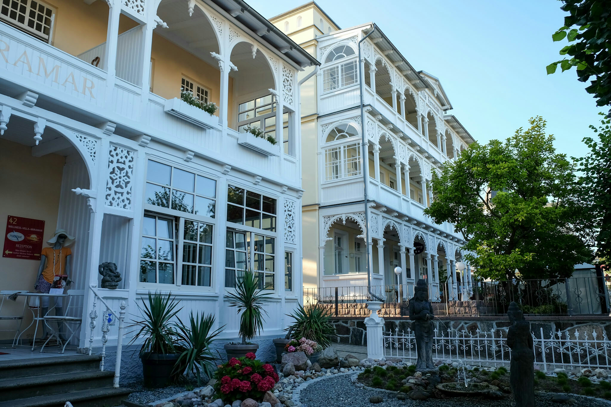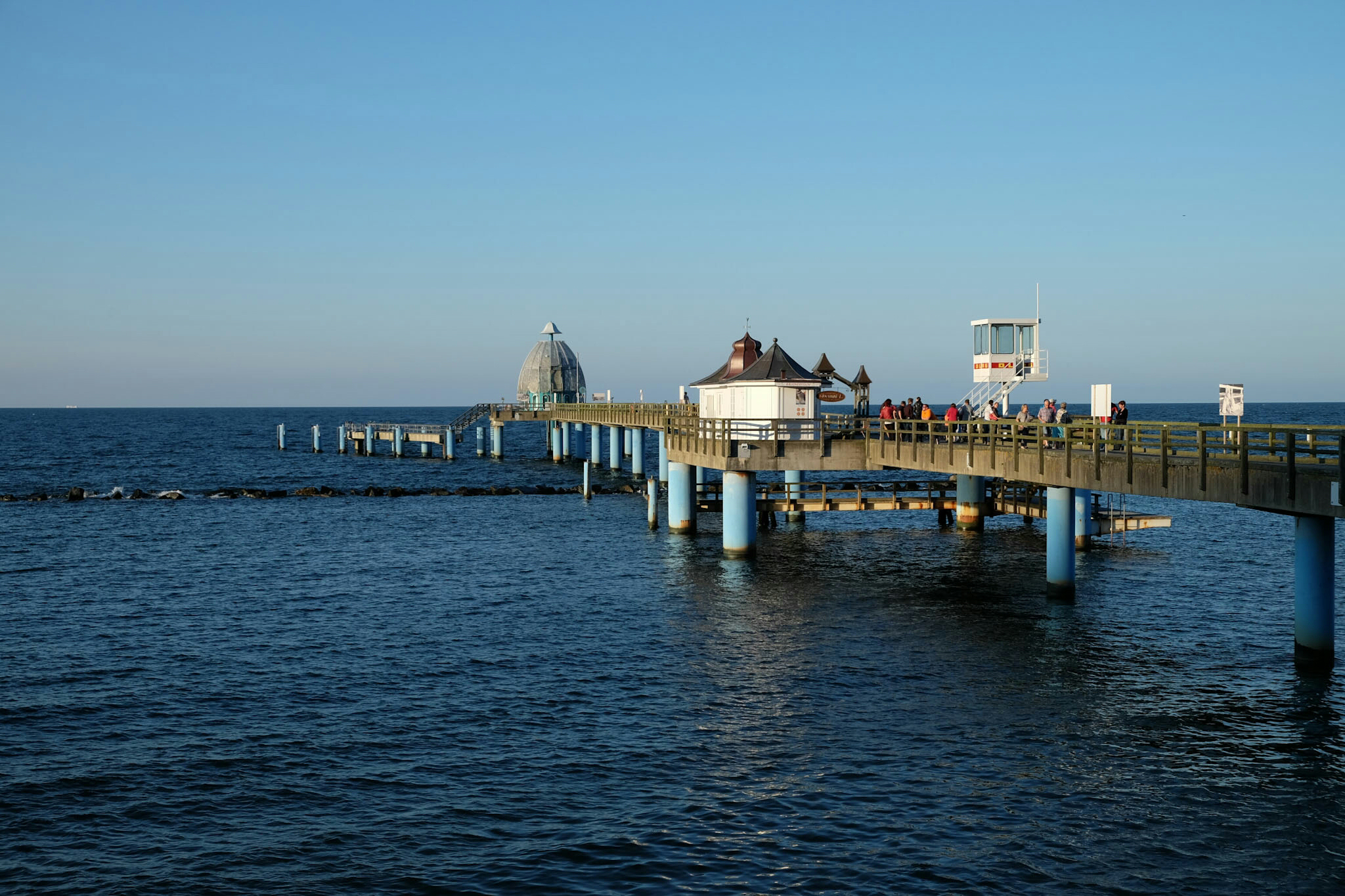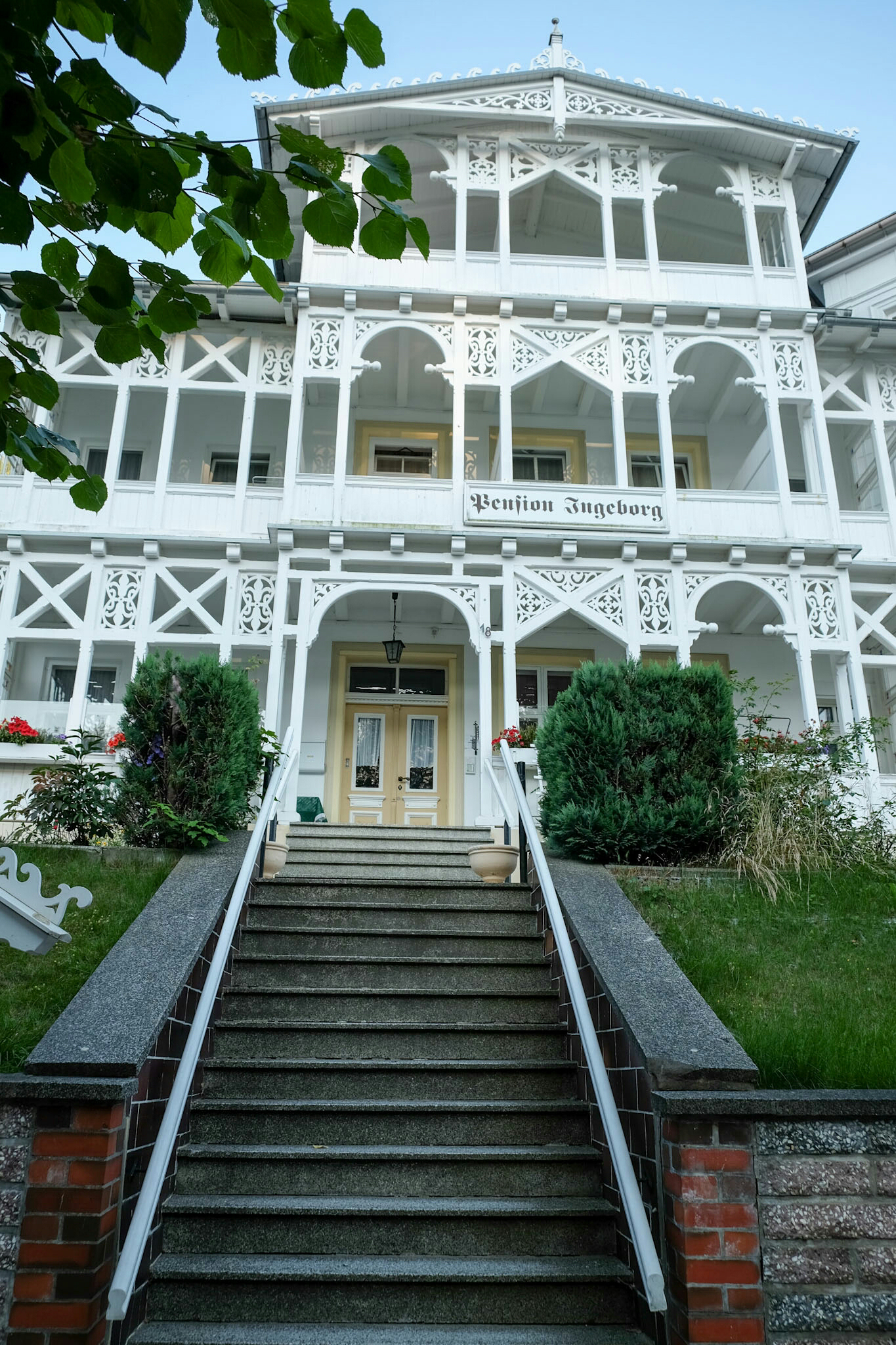 Sellin feierte dieses Wochenende 150 Jahre Badeleben mit Konzerten und einem Feuerwerk. Hoch über dem Strand wollen prachtvolle, weiss getünchte Villen, Hotels und Restaurants bewundert werden. An der unter Denkmalschutz stehenden Wilhelmstrasse reihen sie sich in der Pracht der Bäderarchiktur auf. Am Ende der Strasse taucht die 95 Treppen zählende Himmelsleiter auf (und einem Schräglift), welche zur 1993 nach historischen Vorbildern wieder neu aufgebaute Seebrücke (394m lang, inklusive einer Tauchgondel) führt.