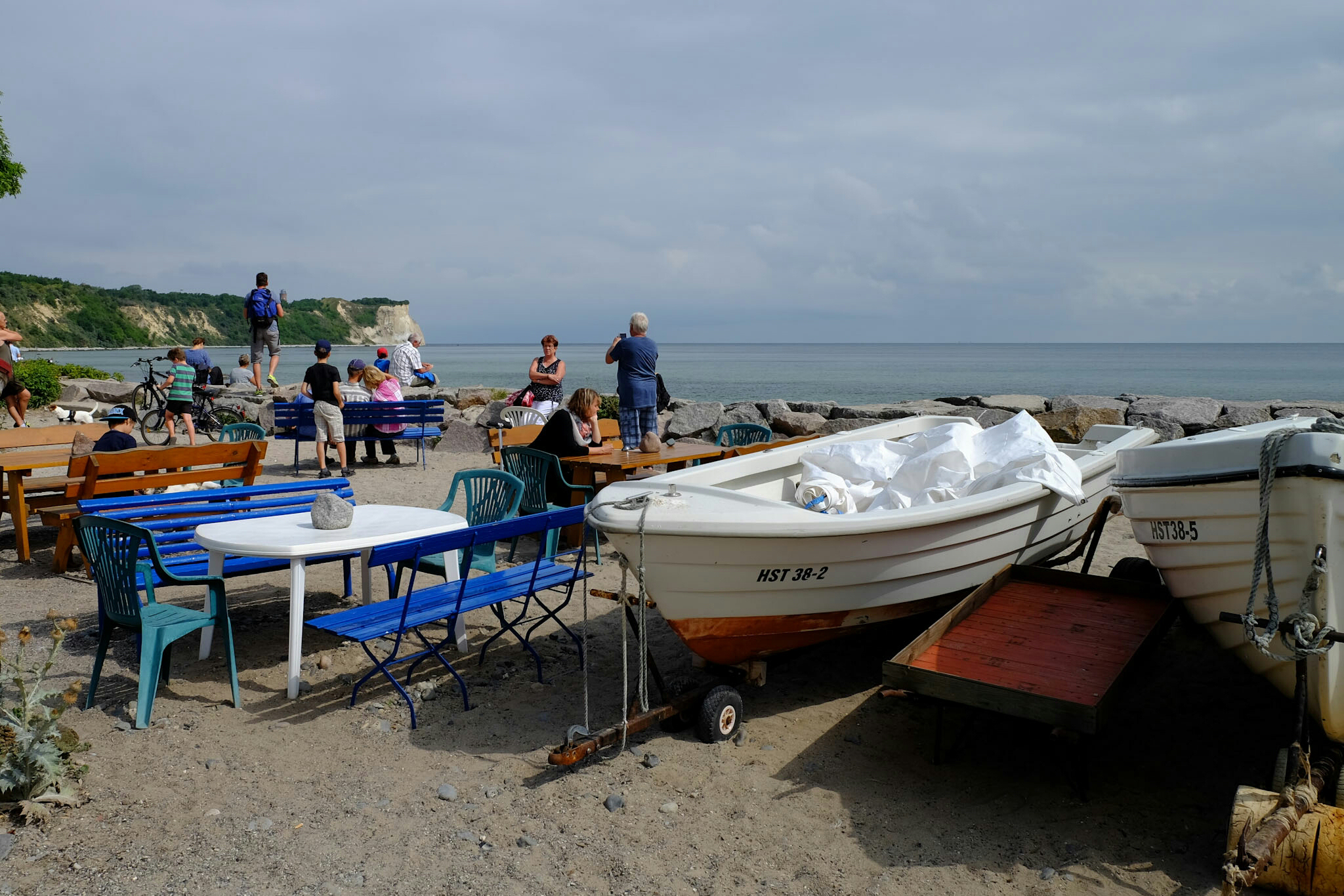 Trotz vieler Touristen hat man am hier noch etwas Einfaches und Ursprüngliches erhalten können. Das Dorf mit seinen 13 reetgedeckten Katen steht unter UNESCO-Denkmalschutz. Früher war die Bucht eine der bedeutendsten Vitten auf Rügen. So nannte man die Plätze, wo sich die Fischer zu den Zeiten der grossen Heringszüge trafen. Da musste ich mittags natürlich einen grossen Brocken geräucherter Buttermakrele mit einem Brötchen verdrücken. Hervorragend.