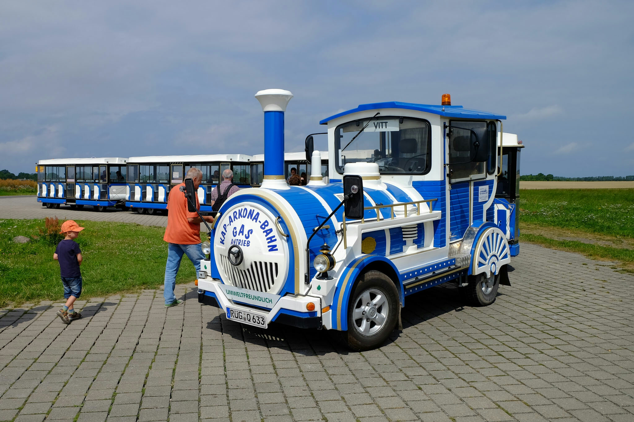 Das Kap kann man nur zu Fuss, mit dem Fahrrad, mit der Pferdekutsche oder mit der ökologischen Kap-Arkona-Bahn erkundet werden. Es lohnt sich jedoch, mindestens den Weg von den Leuchttürmen entlang der Steilküste zum Dorf Vitt zu Fuss zu gehen. Jedes Wegstück ist etwa 2km lang. Ich hab‘ 2 Wegstücke mit der Kap-Arkona-Bahn absolviert.