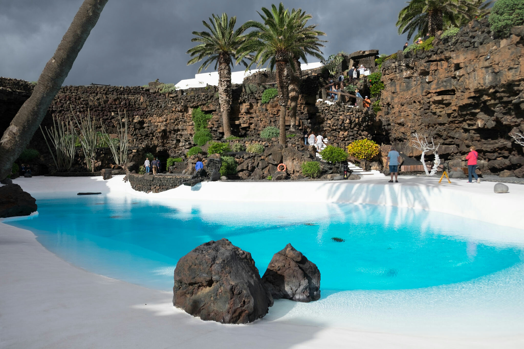 Die Fotos der Jameos del Agua sind wegen einer Kamera-Fehlmanipulation leider mit wenigen Ausnahmen nicht gelungen. Daher gibt’s keine Abbildung der unterirdischen Grotte mit den unzähligen Restaurants und Bars und dem Lagunensee mit den blinden Albino-Krebschen, welche es beim Vulkanausbruch von 2000m Tiefe in die Grotte gespült hat. Nur der wunderschöne Pool im Filmkulissenstyle der 70er hat es richtig auf den Kamerasensor geschafft.