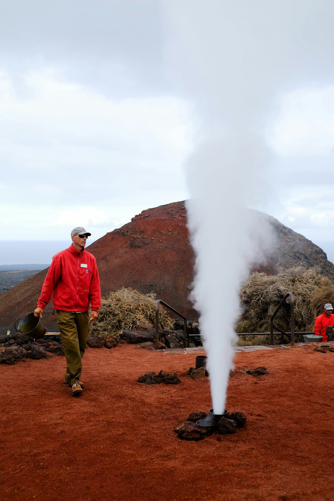 Seit fast 200 Jahren ist Ruhe, aber in den Feuerbergen (Montañas del Fuego) des Timanfaya Nationalparks existiert der Blase mit Magma (der Hotspot) immer noch. Man kann mit dem Auto zu einem feuerfesten Restaurant mitten in den Feuerbergen fahren und von dort eine Rundtour mit dem Bus machen. Das Begehen und Befahren des Nationalparks ist inzwischen nur noch auf wenigen Strassen und Wegen erlaubt.