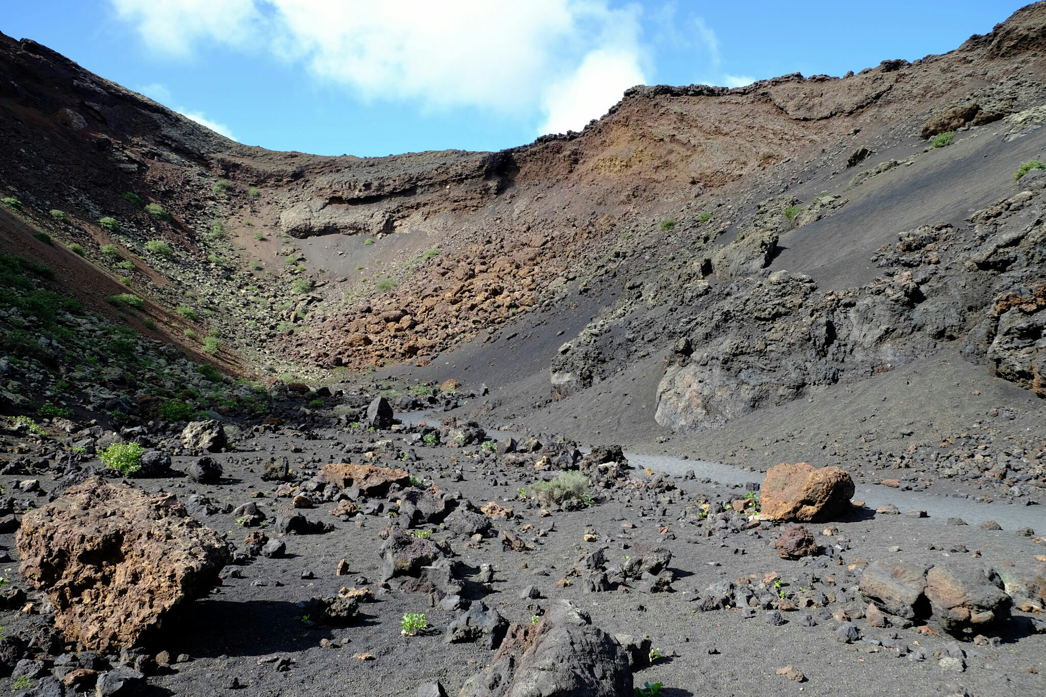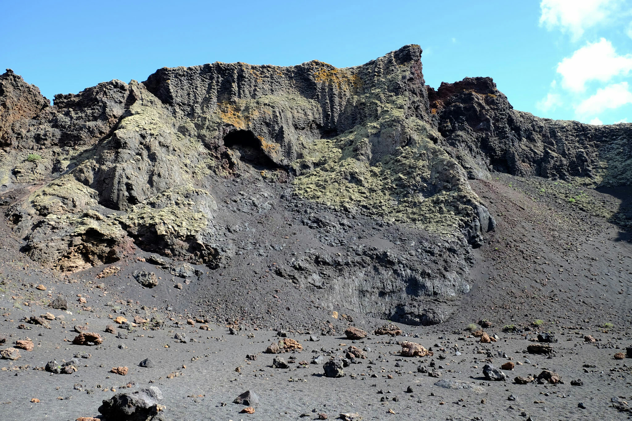 Ich hab‘ mich für die Caldera del Cuervo entschieden. Diese Caldera war der erste Vulkanschlot, der im gigantischen Timanfaya Vulkanausbruch von 1730-1736 entstanden ist. Er steht als Solitär mitten in einem ausgedehnten Lavafeld und kann in gut einer Stunde umrundet werden. Die Lava dieses kleinen Vulkans floss gegen Norden und Nordosten und hinterliess eine zerstörerische Spur von schwarzem Basalt, dem die ersten Gehöfte des Ausbruchs zum Opfer fielen. Pyroklastischer Regen zerstörte danach die Dörfer im weiten Umkreis.