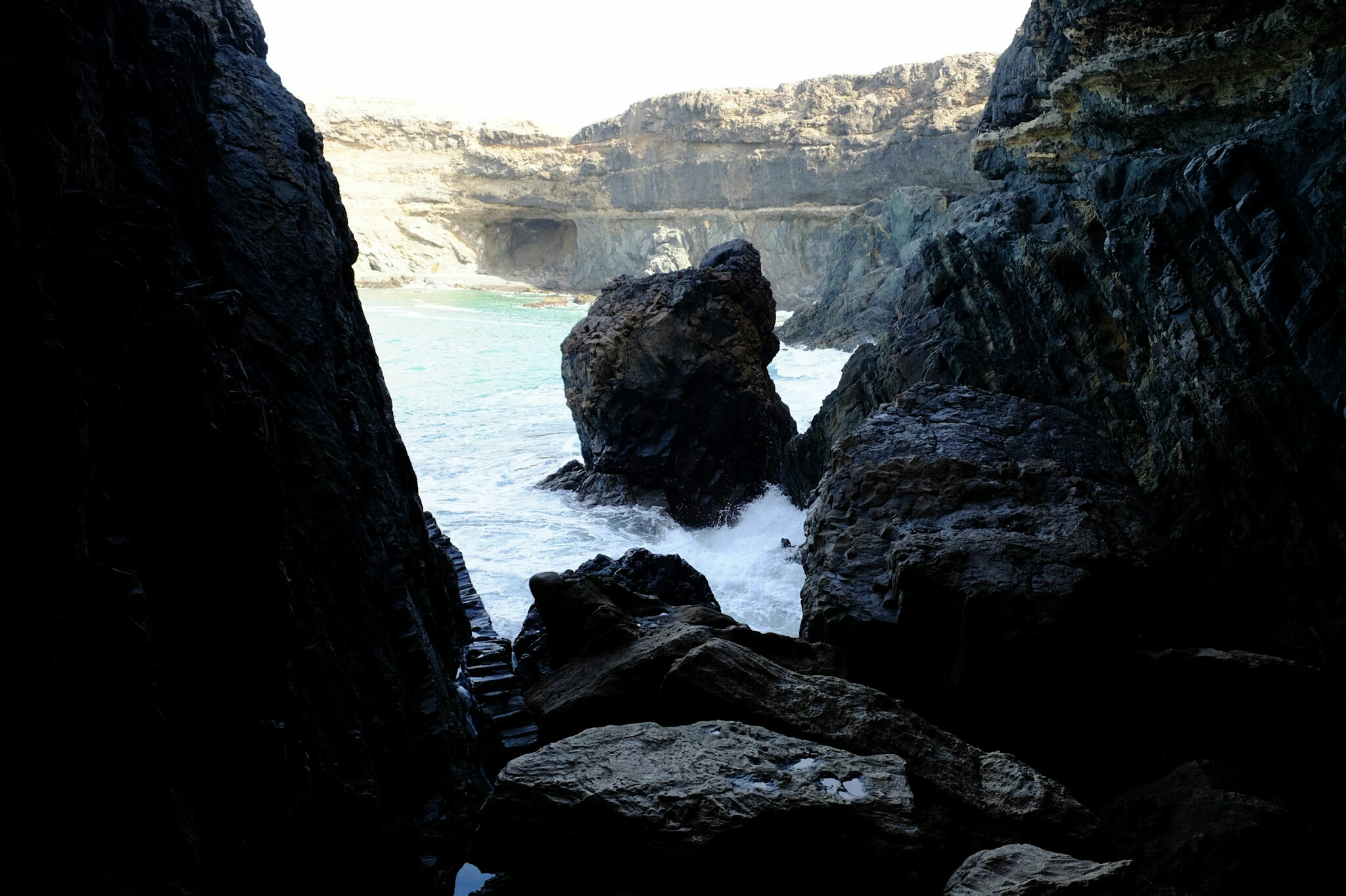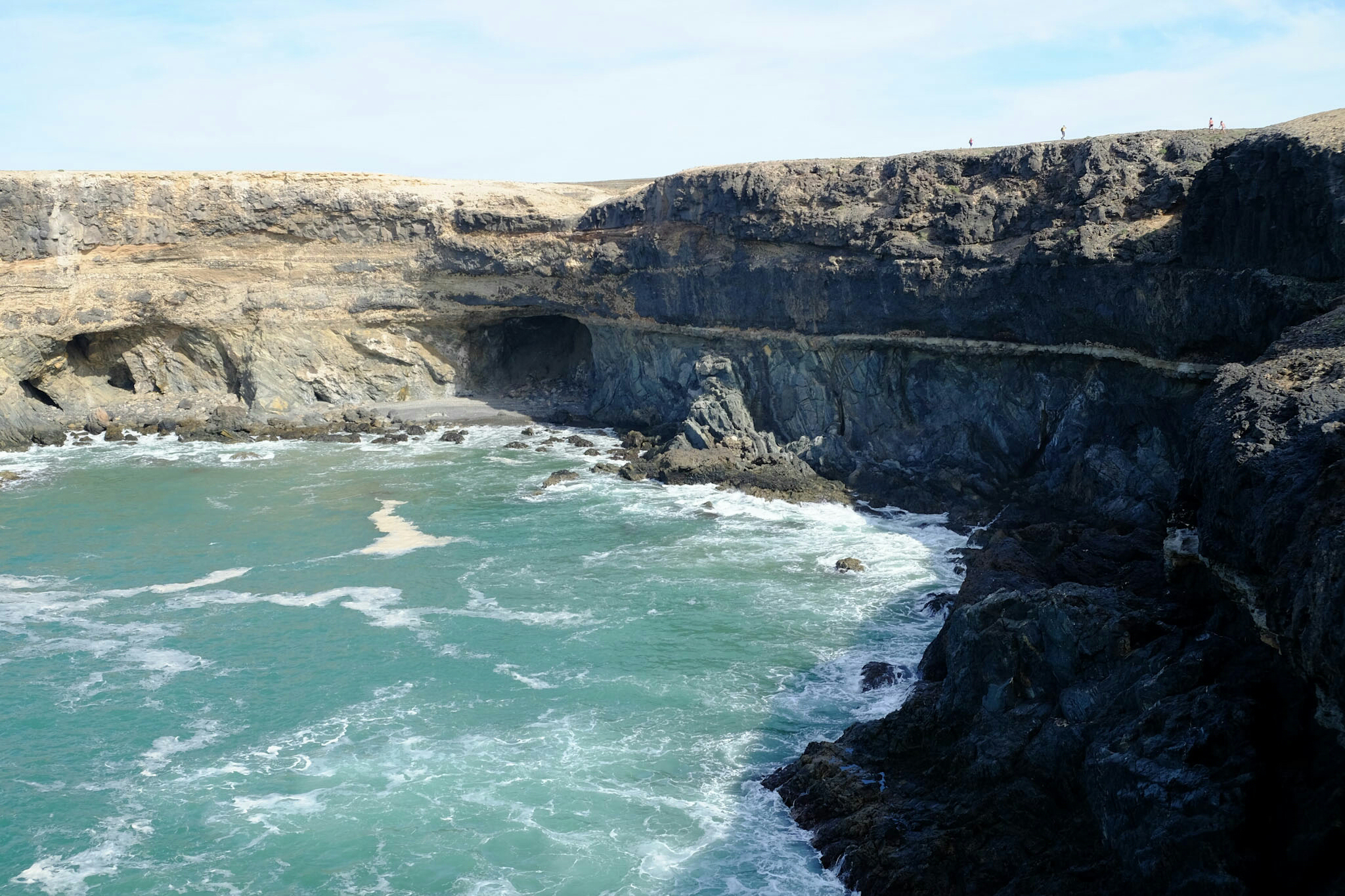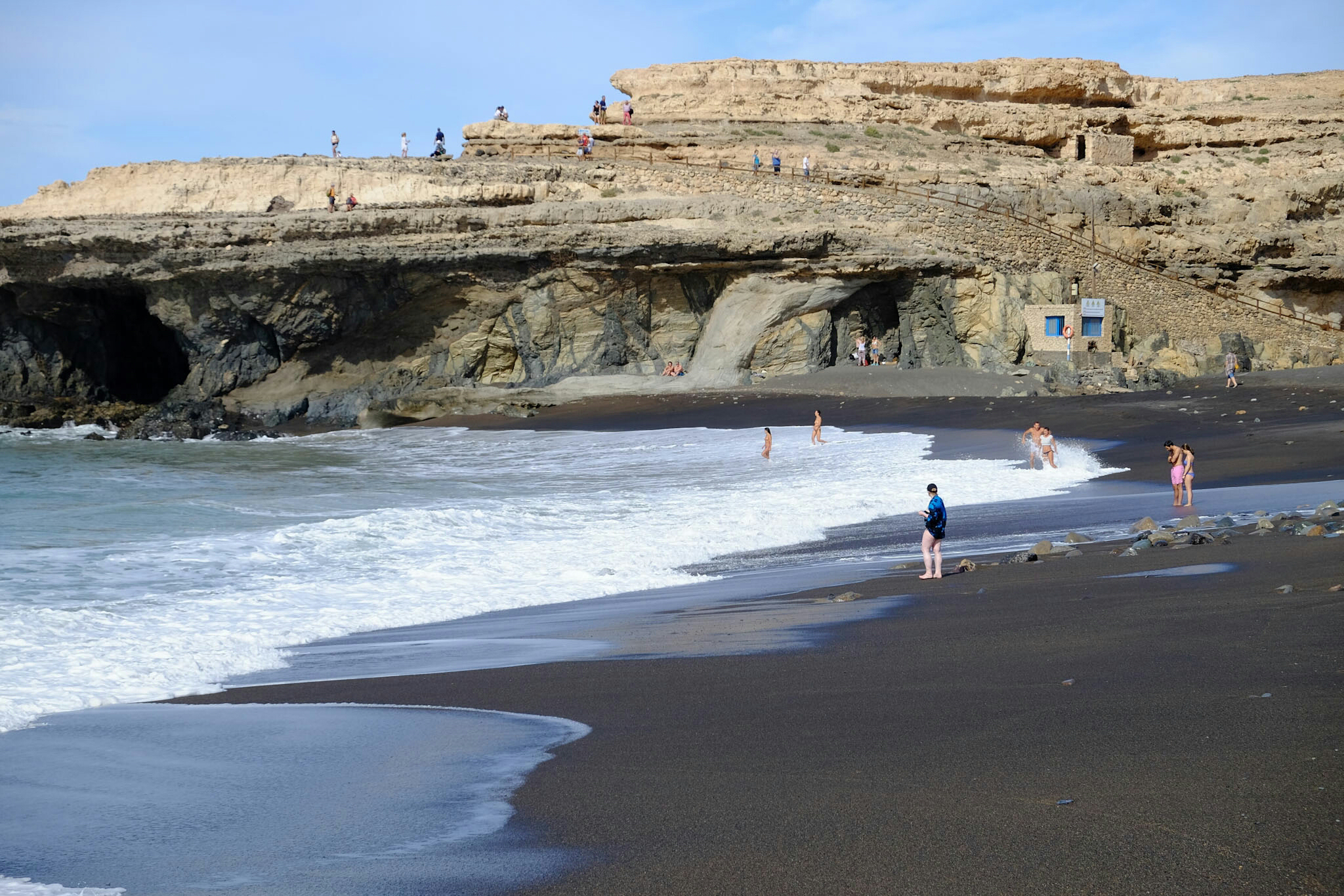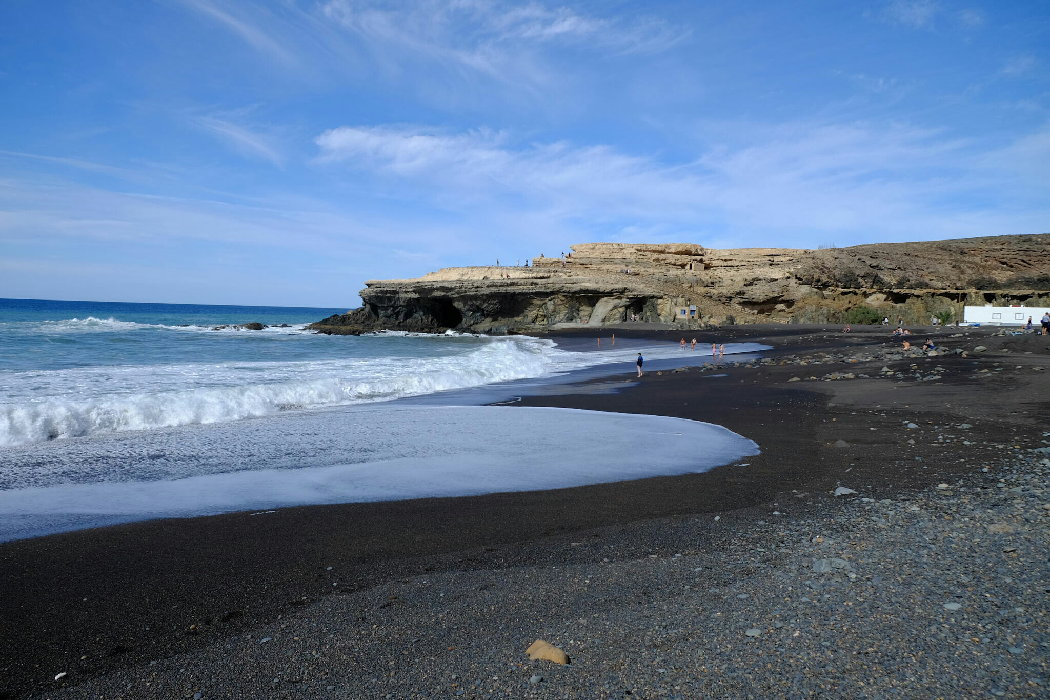 Rechts kann man die Klippen raufgehen und in einem etwa 20-minütigen Fussmarsch über teils steile Felstreppen die Schwarze Höhle besuchen gehen. Einer der beeindruckendsten, von der Natur geschaffenen Orte von Fuerteventura. Auf dem Weg entlang der Klippe sieht man noch zwei Kalköfen, wo früher Kalk gebrannt wurde.