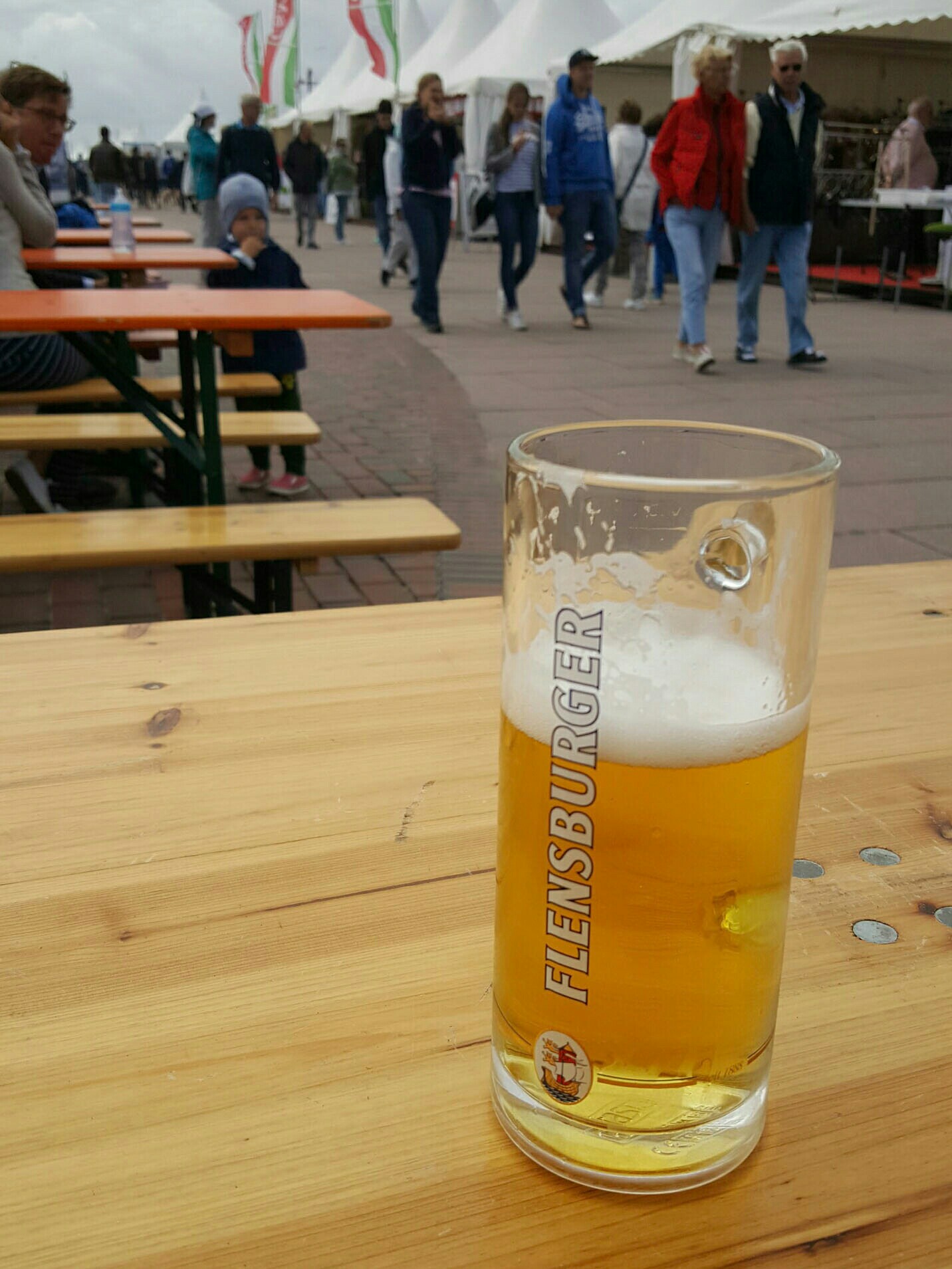 Das erste Training der Sailing Week fand, wohl wegen des starken Windes, nicht statt. Aber die vielen Verpflegungsstände hatten natürlich trotzdem offen. Ich hab‘ mir ein grosses Stück Pizza, ein Flens und dann noch eine Portion Garnelen mit Knoblauch-Dip gegönnt. Die Stände haben auch den Sturmwind recht gut abgehalten. Ein gefüllter Magen und etwas Alkohol heben die Stimmung doch ungemein!