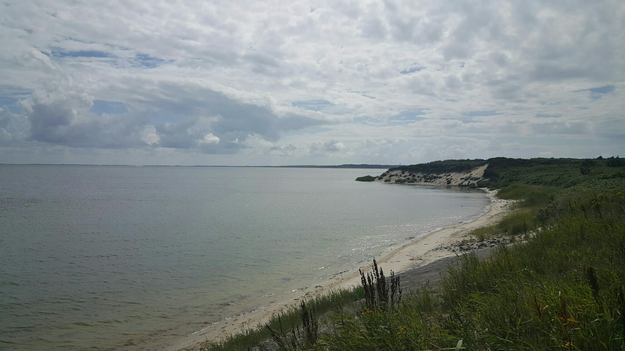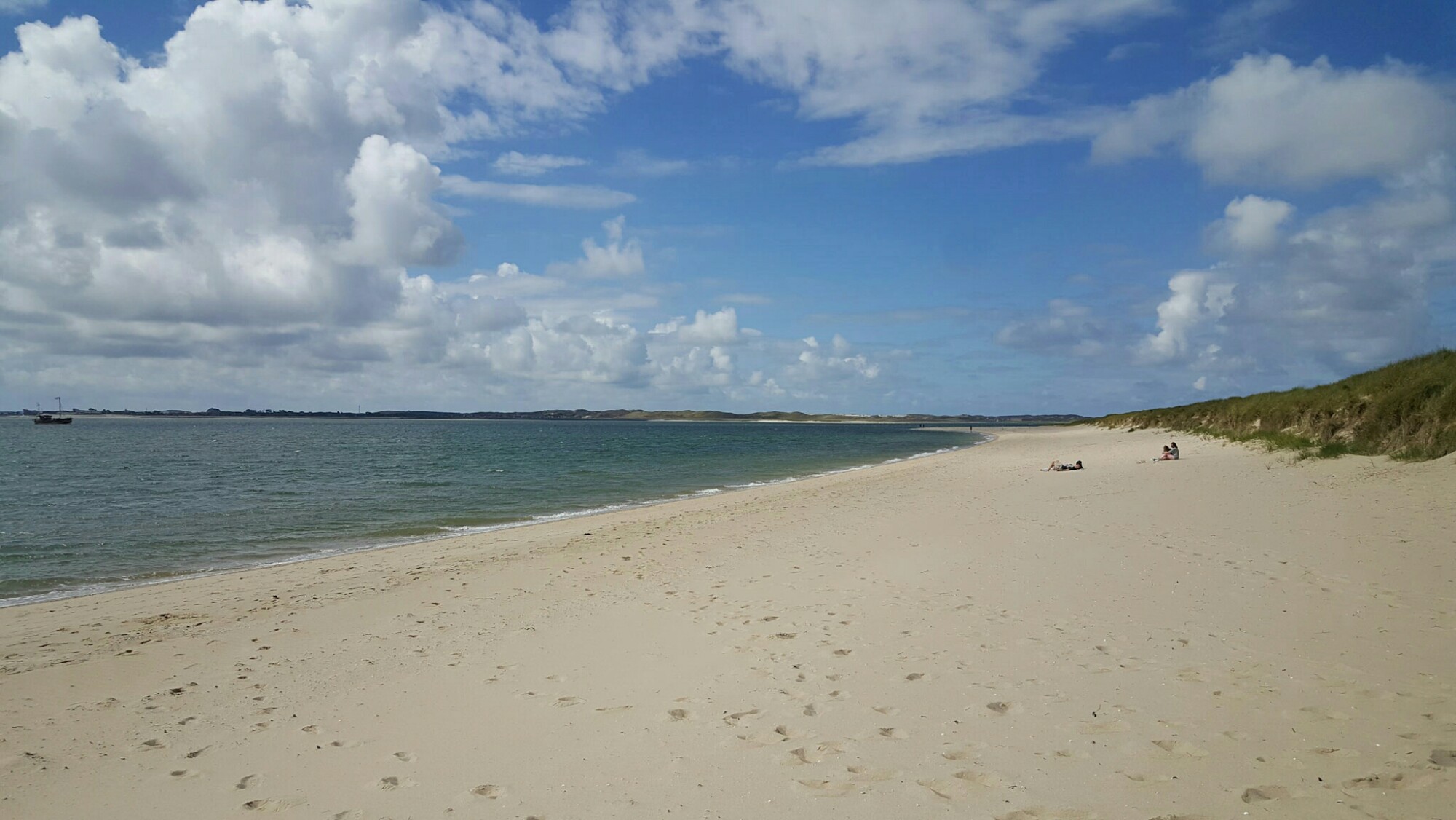 Bei der Westrandhalle (Wonnemeyers) ging’s auf die Privatstrasse Richtung Ellenbogen, denn der ganze Ellenbogen ist seit 1608 in privatem Besitz! Wenigstens müssen Radfahrer, Radfahrerinnen und Wandersleute keine Maut bezahlen. Am Parkplatz an der Ellenbogenspitze kann man die fantastische Natur bestaunen und den starken Strömungen nördlich und südlich der Spitze zuschauen. Über Rømø gingen aus dunklen Gewitterwolken gerade ein paar Regenschauer runter, aber hier umd über dem Königshafen war schönes Wetter. Der Königshafen ist ein sehr beliebtes Surfrevier, denn das Wasser ist nur hüfttief und auch für Anfänger geeignet.