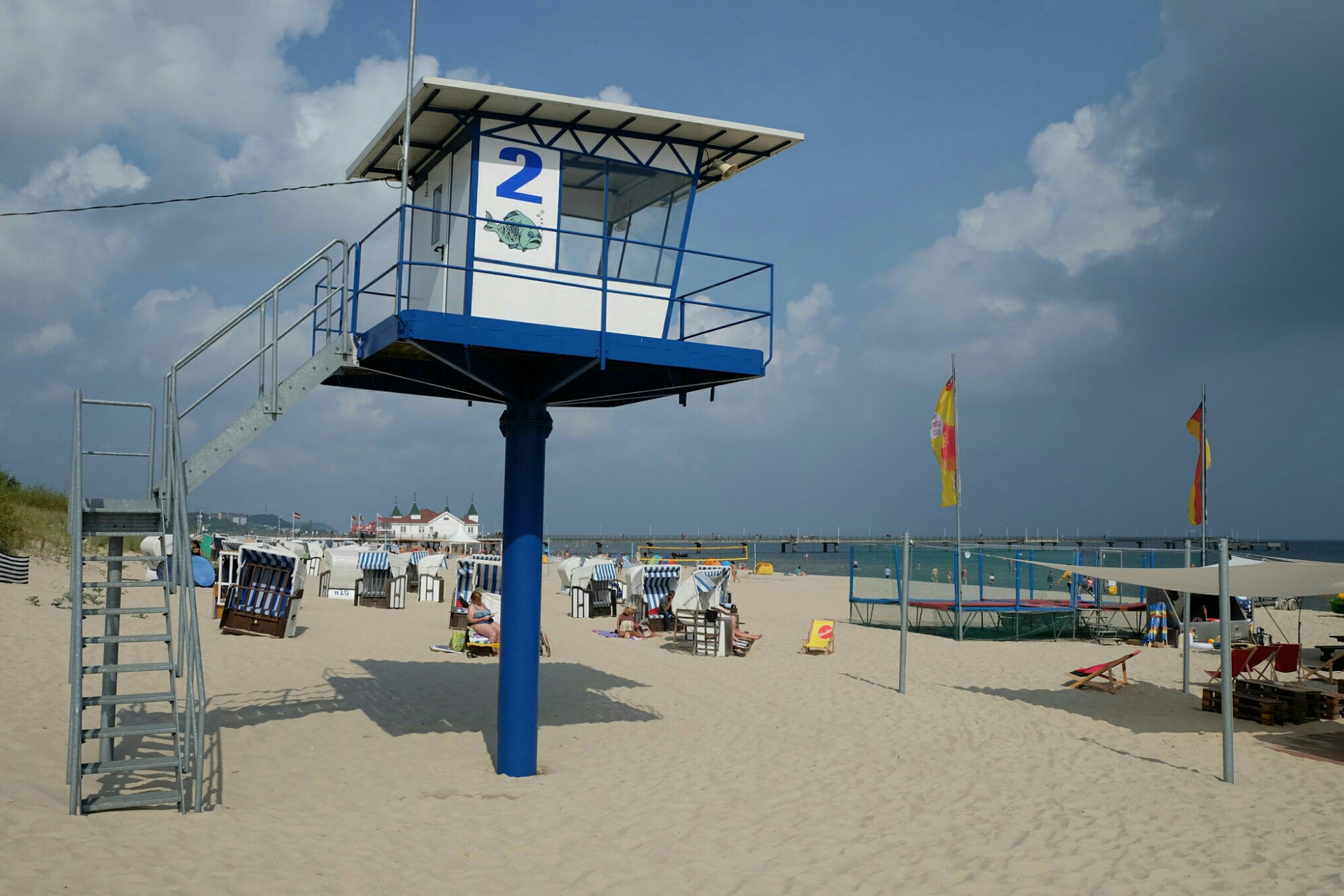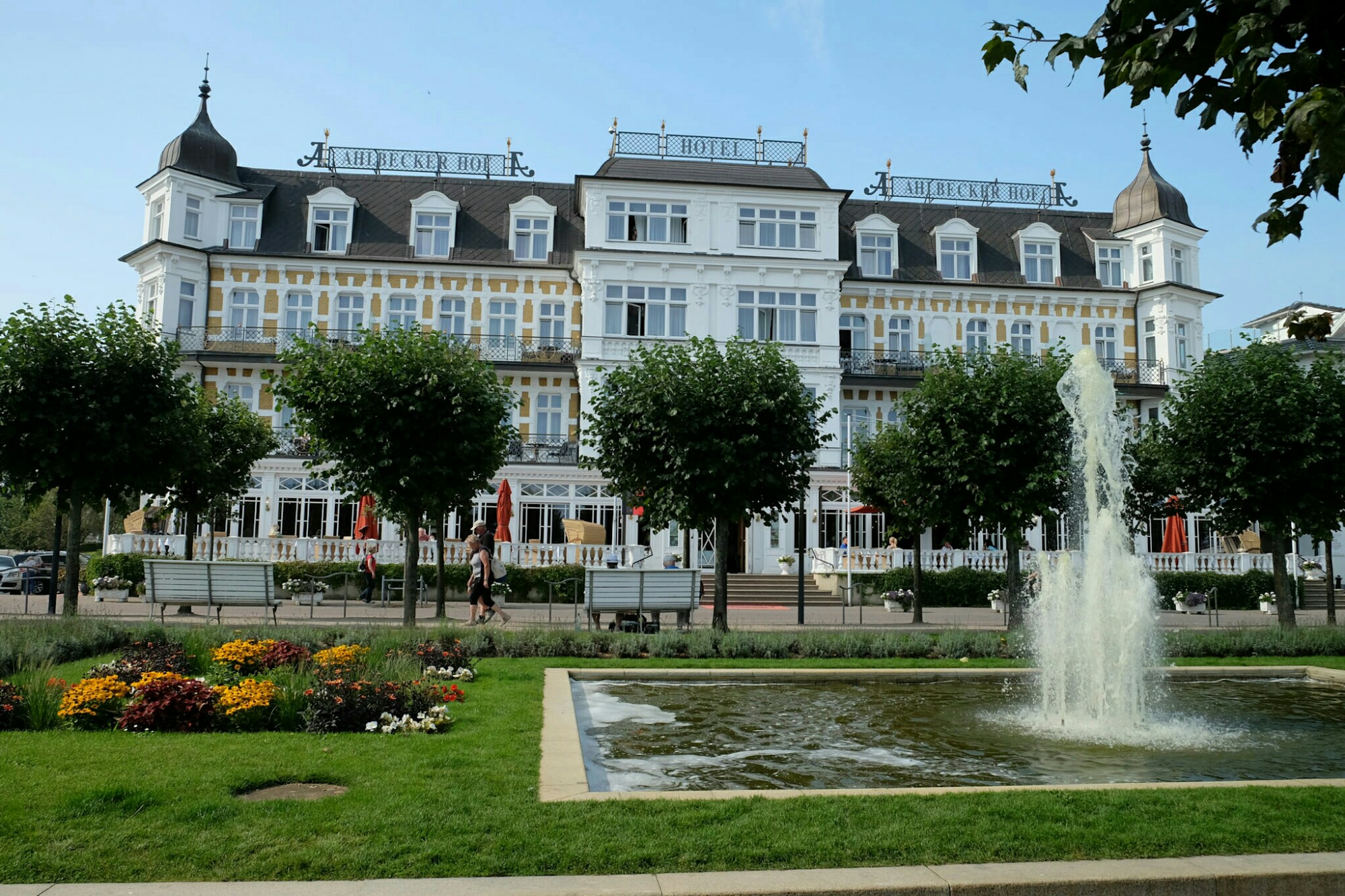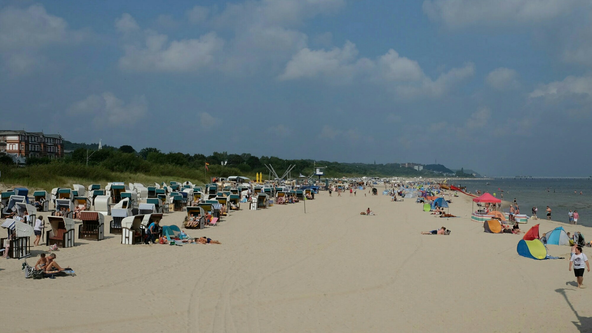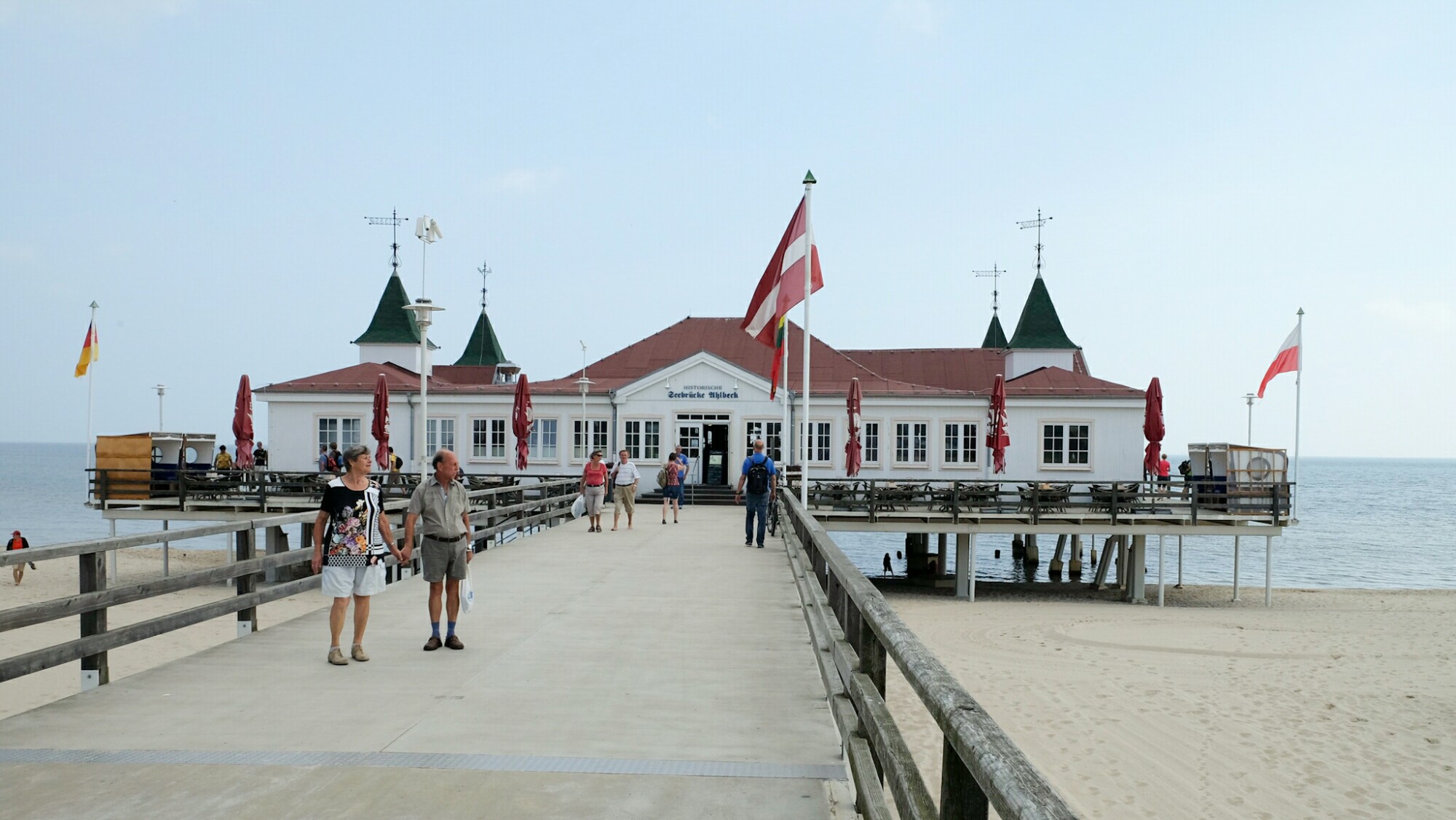 Ahlbeck, an der Grenze zu Polen, konnte seinen Charme als Bad für den gutsituierten Mittelstand bewahren und ist inzwischen der beliebteste Badeort auf Usedom. Im Gegensatz zu den anderen Orten konnte man hier die historische Seebrücke mit seinem Gründerzeitbau von 1899 erhalten. Sie dient als Titelbild vieler Magazine und sehr gerne als Filmkulisse. Der 70m breite, feine Sandstrand erstreckt sich entlang der Promenade auf beiden Seiten des Orts bis zum Horizont. Das zieht die Badegäste natürlich wie magisch an.