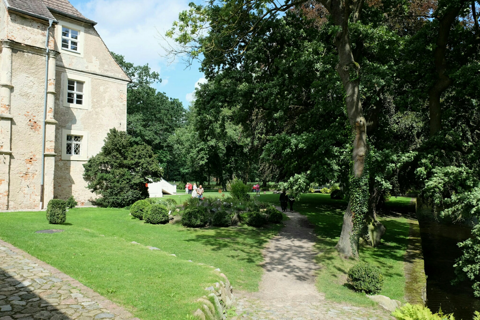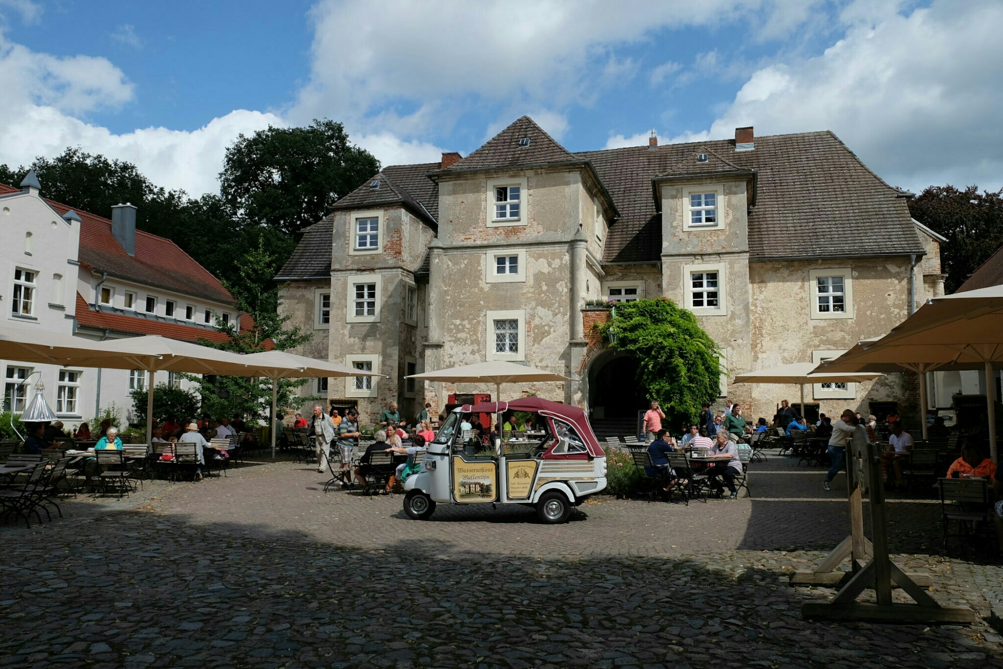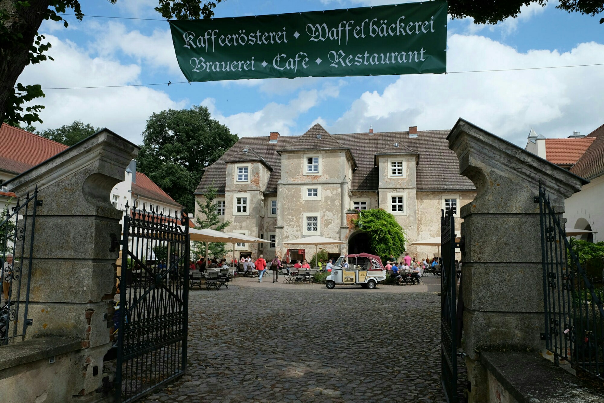 Das Gebäude wurde 1575 von Rüdiger von Neuenkirchen erbaut und hat schon viele Besitzerwechsel hinter sich. 40 Jahre Verwahrlosung in der DDR gingen nicht spurlos am Schlösschen vorbei. 2001 kaufte die Familie Fidora das Gebäude und begann es mit viel Engagement zu renovieren und mit einem nachhaltigen Betriebskonzept zu finanzieren. Das Wasserschloss ist heute ein Café, ein Restaurant, eine Brauerei, eine Kaffeerösterei und ein Hotel. Und eine Waffelbäckerei. Wöchentliche Themenabende sollen weitere Gäste anlocken. Ziemlich viele Ambitionen innerhalb des Wassergrabens!