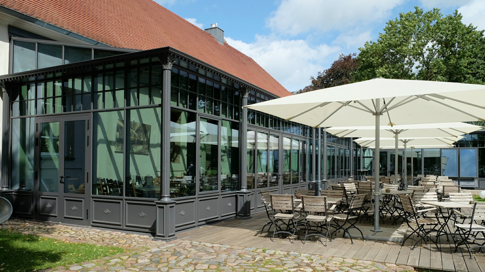 Nachdem man an der Brücke 2€ Brückenzoll bezahlt hat (es war vor dem Passieren des „Zolls“ nicht ganz klar, ob man als Restaurant-Gast den linksseitigen Gratisparkplatz für Gäste benutzten durfte, oder auf dem kostenpflichtigen rechtsseitigen Parkplatz parken musste), darf man die verschiedenen Restaurationsbereiche betreten oder den kleinen Garten innerhalb des rechteckigen Wassergrabens hinter dem Haus begutachten. Ich habe auf dem Schlossplatz die gutbürgerliche Küche (ein grosser, währschafter Teller mit Flunderfilets mit Bratkartoffeln und Co.) sowie das selbstgebraute Bier und den selbst gerösteten Kaffee probiert. Kann ich empfehlen: Das hat geschmeckt und war sehr entspannt, da auch die Sonne die Gäste ausserhalb der Reichweite der Sonnenschirme verwöhnte.