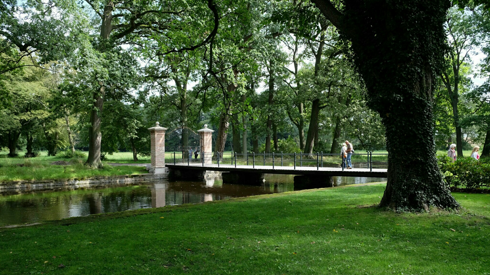 Nachdem man an der Brücke 2€ Brückenzoll bezahlt hat (es war vor dem Passieren des „Zolls“ nicht ganz klar, ob man als Restaurant-Gast den linksseitigen Gratisparkplatz für Gäste benutzten durfte, oder auf dem kostenpflichtigen rechtsseitigen Parkplatz parken musste), darf man die verschiedenen Restaurationsbereiche betreten oder den kleinen Garten innerhalb des rechteckigen Wassergrabens hinter dem Haus begutachten. Ich habe auf dem Schlossplatz die gutbürgerliche Küche (ein grosser, währschafter Teller mit Flunderfilets mit Bratkartoffeln und Co.) sowie das selbstgebraute Bier und den selbst gerösteten Kaffee probiert. Kann ich empfehlen: Das hat geschmeckt und war sehr entspannt, da auch die Sonne die Gäste ausserhalb der Reichweite der Sonnenschirme verwöhnte.
