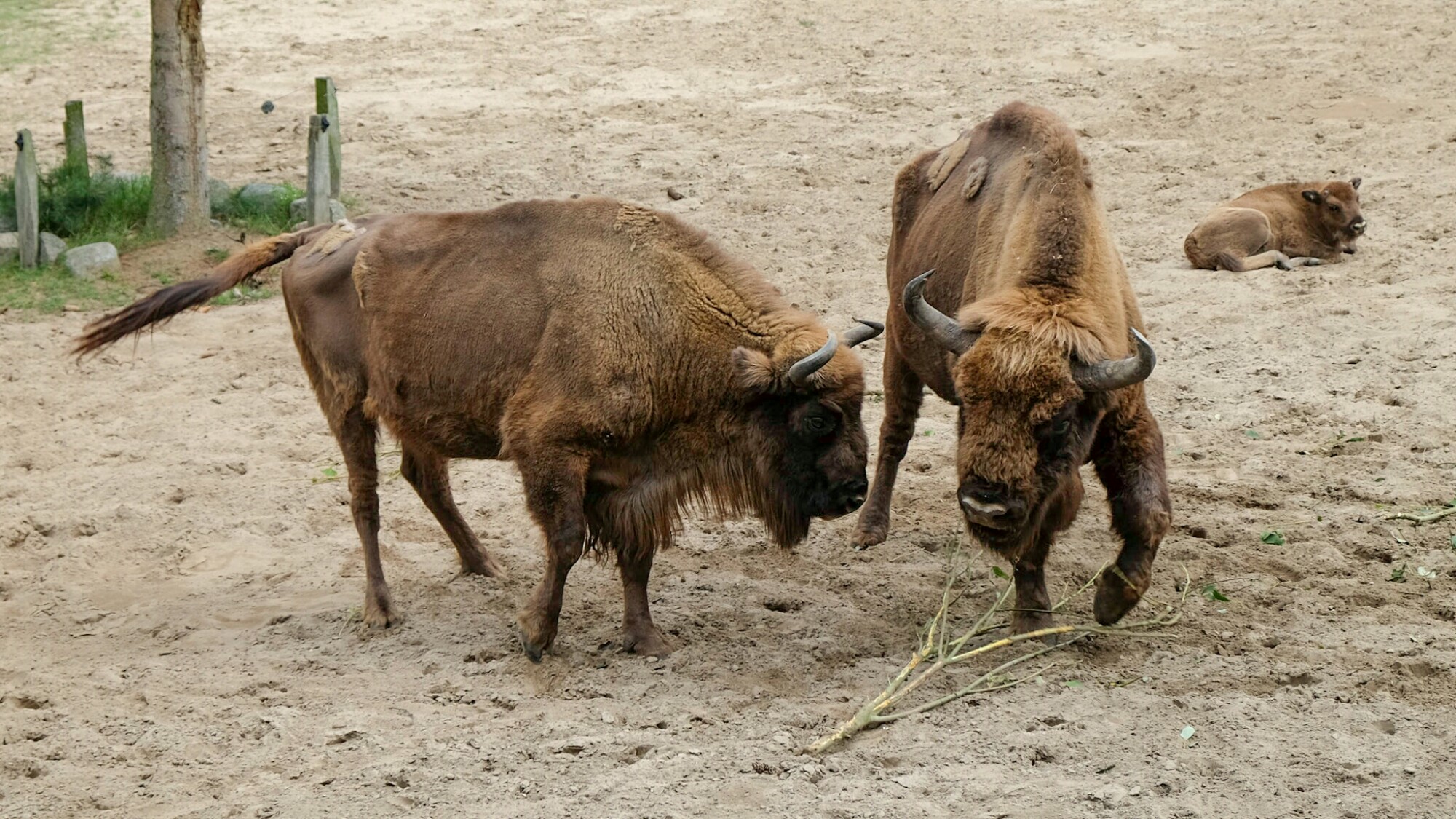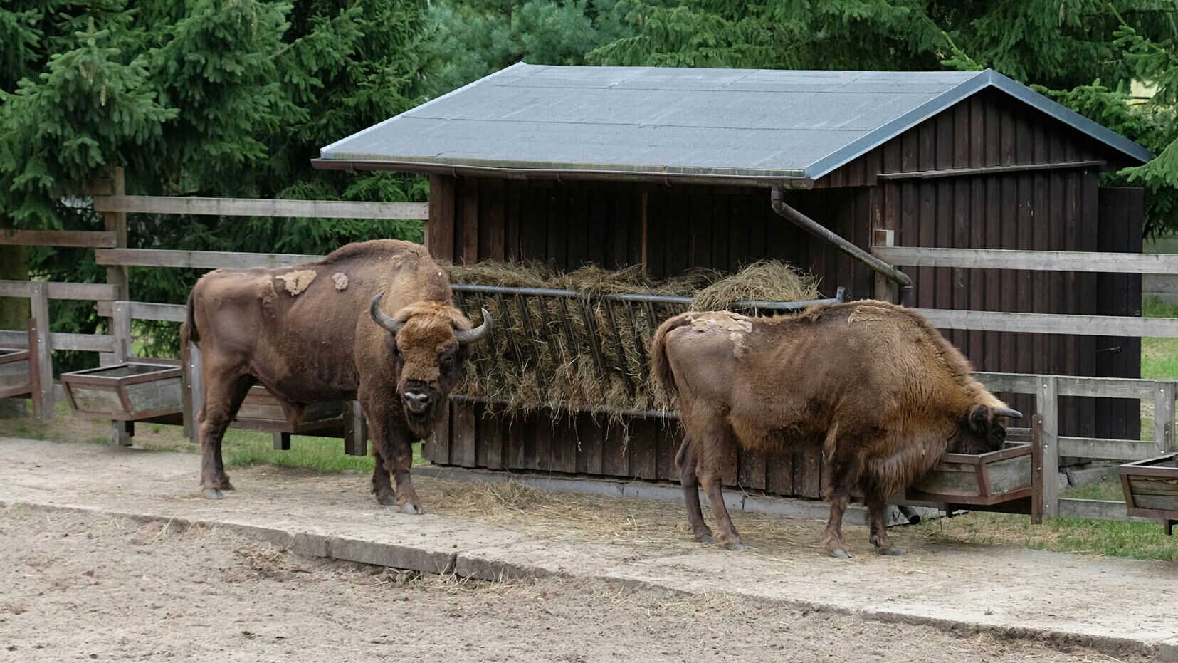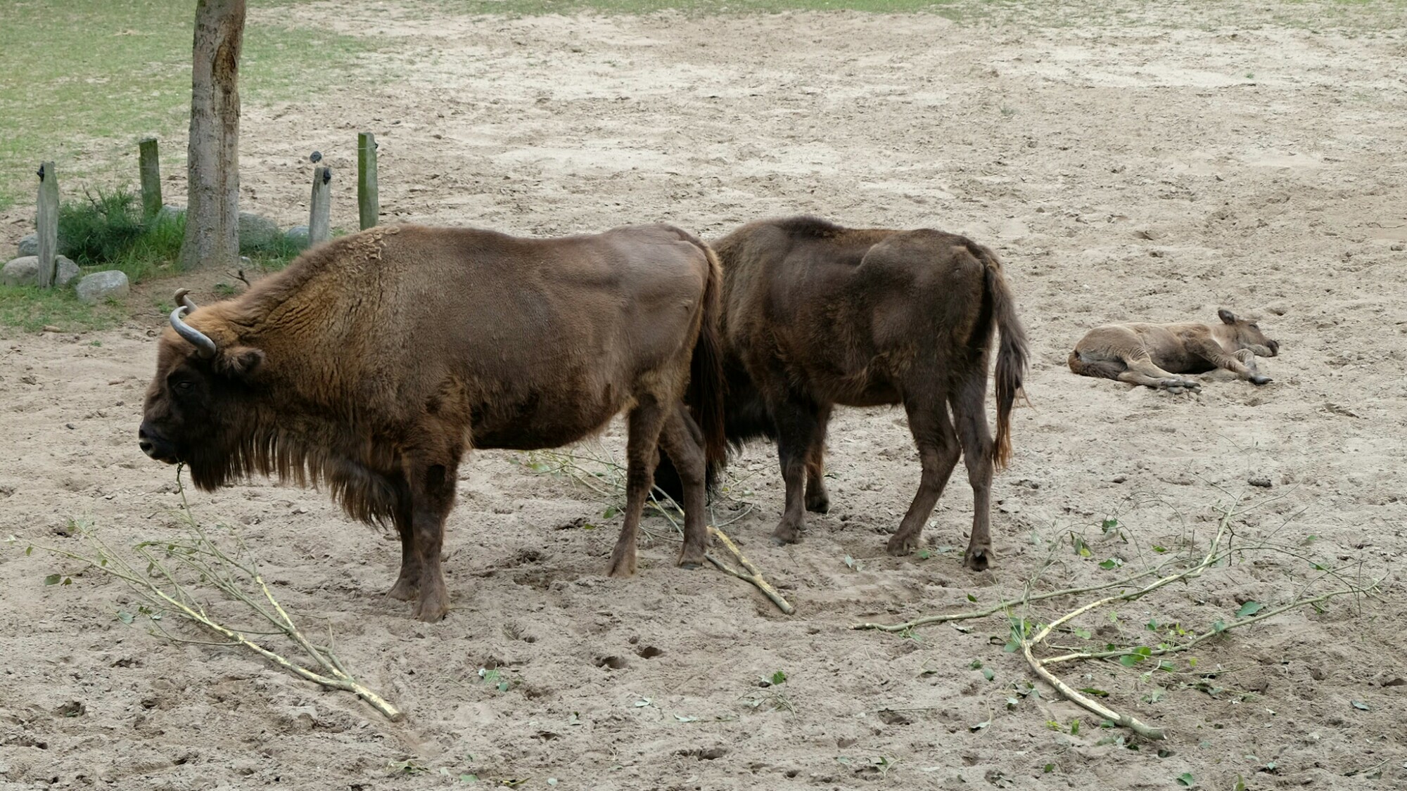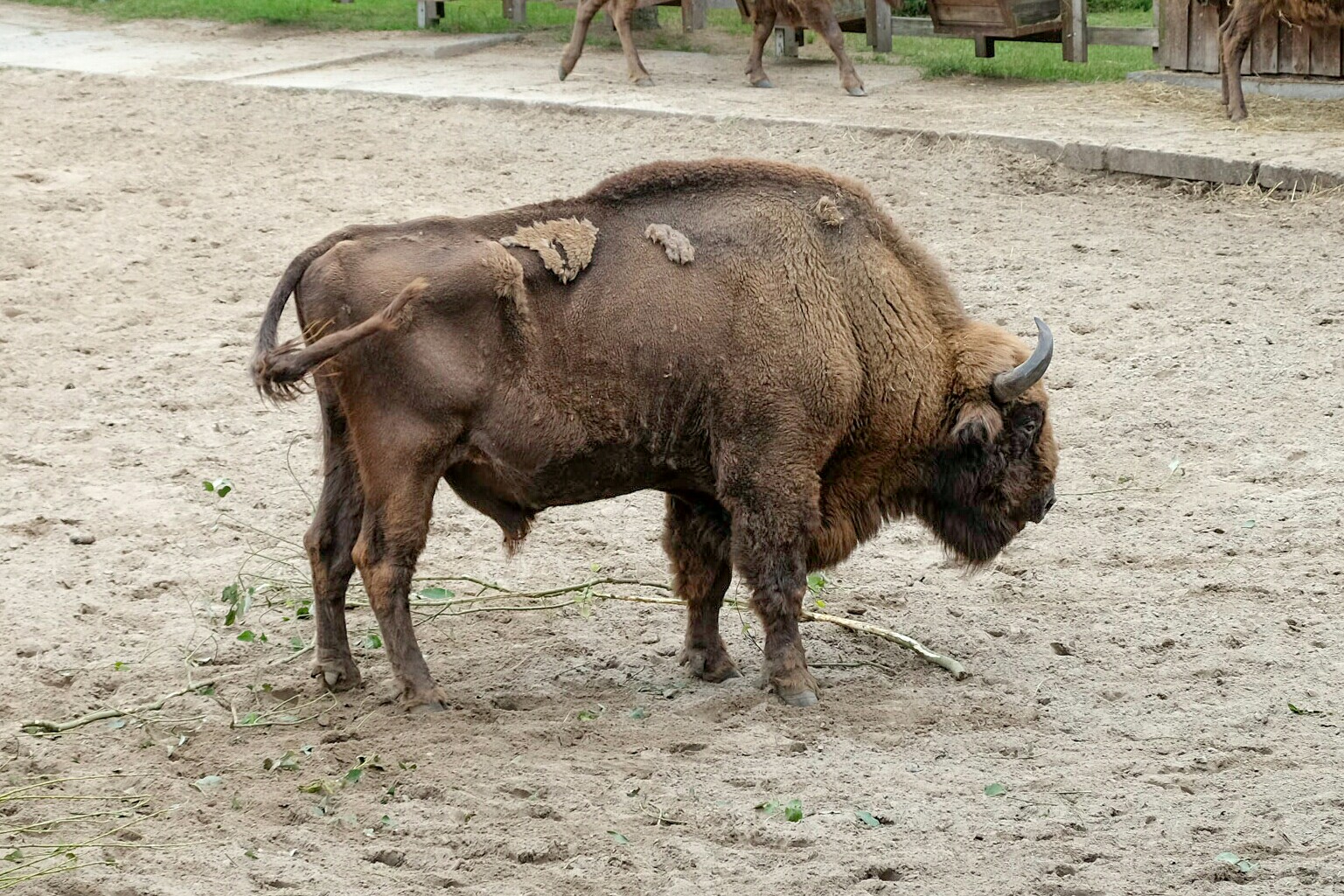 Als nächstes stand der Besuch des nahegelegenen Wisentgeheges an. Die Anfahrt führt über schon fast abenteuerliche Strassen. Seit Juni 2004 gibt es in der Mellenthiner Heide dieses Zucht- und Schaugehege für Wisente. Damit ist eine ehemals heimische Tierart nach Mecklenburg-Vorpommern zurückgekehrt – 640 Jahre nach ihrer Ausrottung durch den Menschen. In 6 Ländern Europas sind etwa 2000 Wisente wieder in freier Natur. Etwa 1200 Wisente leben in Tierparks und Gehegen. Sie sind die genetische Reserve für eine strenge Zuchtwahl. Wegen ihrer engen Verwandtschaft weisen alle Tiere eine hohe genetische Übereinstimmung auf. Der Wisent ist immer noch eine bedrohte Tierart! Die majestätischen Tiere so friedlich aus der Nähe bei der täglichen Fütterung beobachten zu können, ist schon ein besonderes Erlebnis! Man möchte dem grössten Wildtier in Europa in freier Wildbahn eher nicht begegnen, denn sie können auf bis zu 60km/h beschleunigen und die Bullen werden bis zu 900kg schwer…