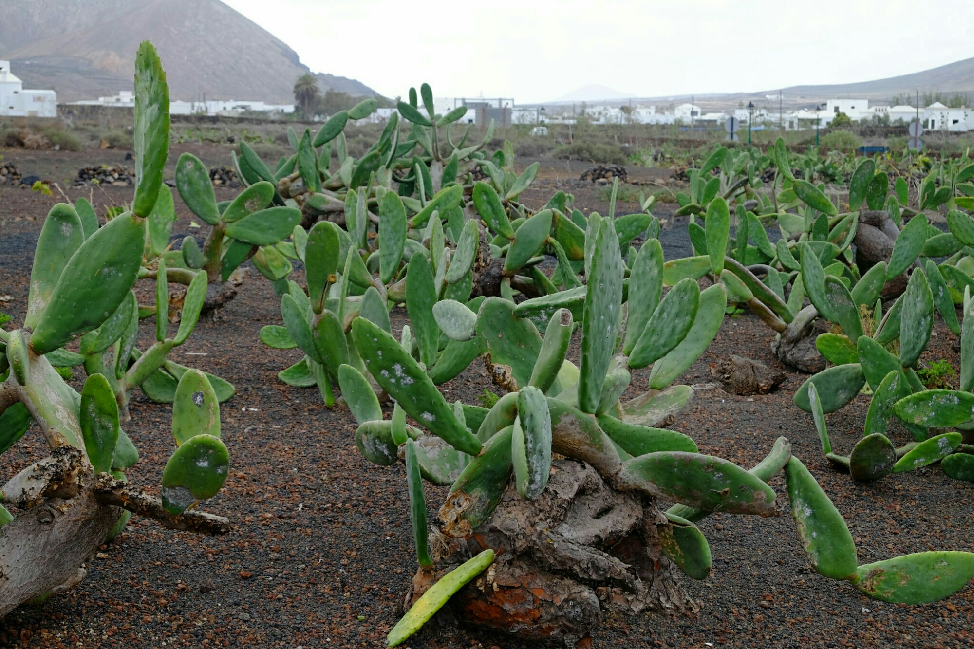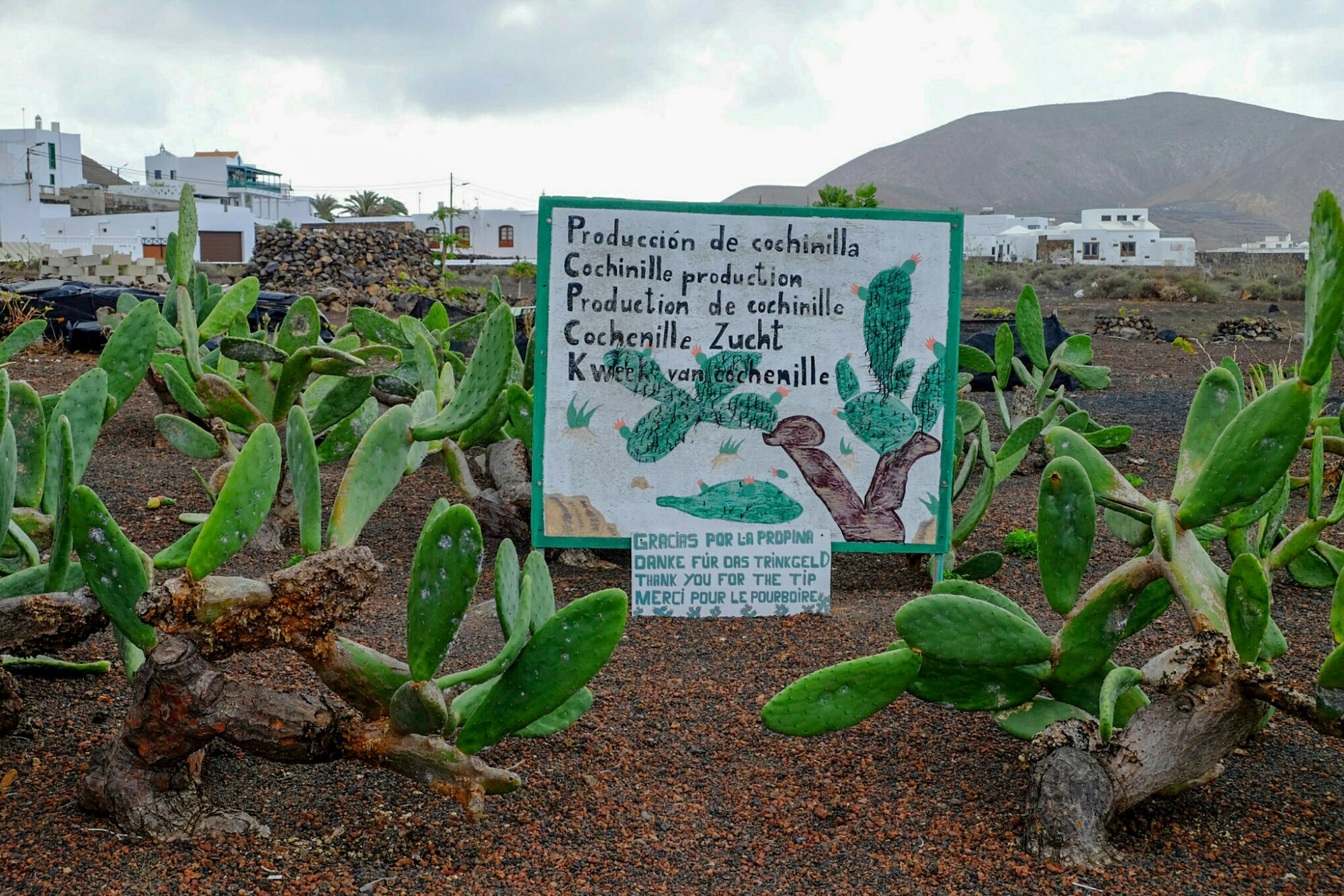 Rund um die Dörfer Mala und Guatiza (Jardín de Cactus) hat es unzählige Feigenkaktusfelder. Warum die hier angebaut werden, hat mit roter Farbe zu tun. Denn auf den Kakteen (Opuntien) leben als Schmarotzer Läuse, die Coschenillen-Schildläuse. Und aus den Läusen wird roter Farbstoff hergestellt! Die weissen, pudrigen Läuse sind auf den Kakteen sehr gut sichtbar. Und je nach Jahreszeit bewegen die sich sogar… Aus den Larven wird Karmin gewonnen, das als roter Farbstoff früher grossen Absatz fand.