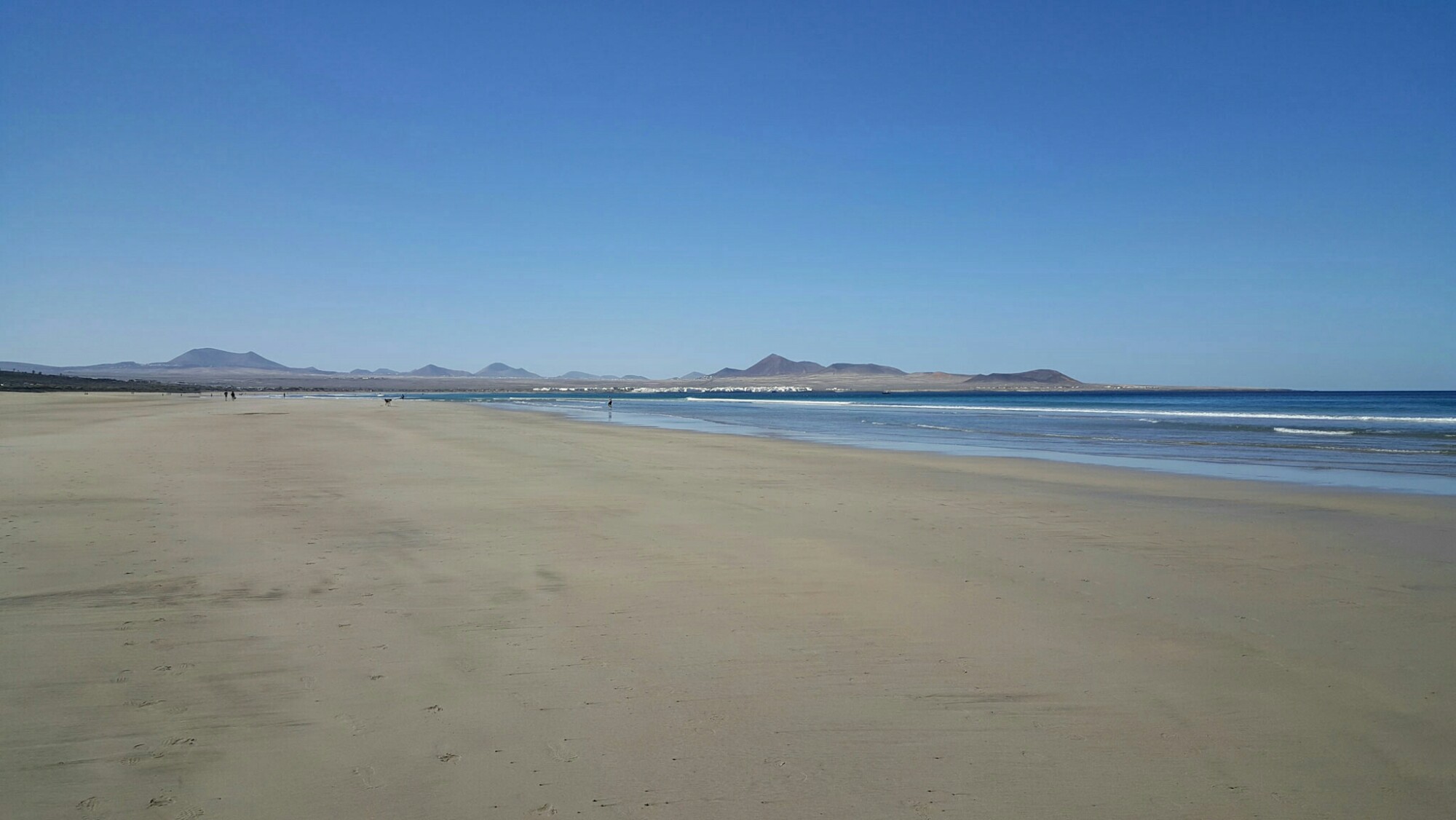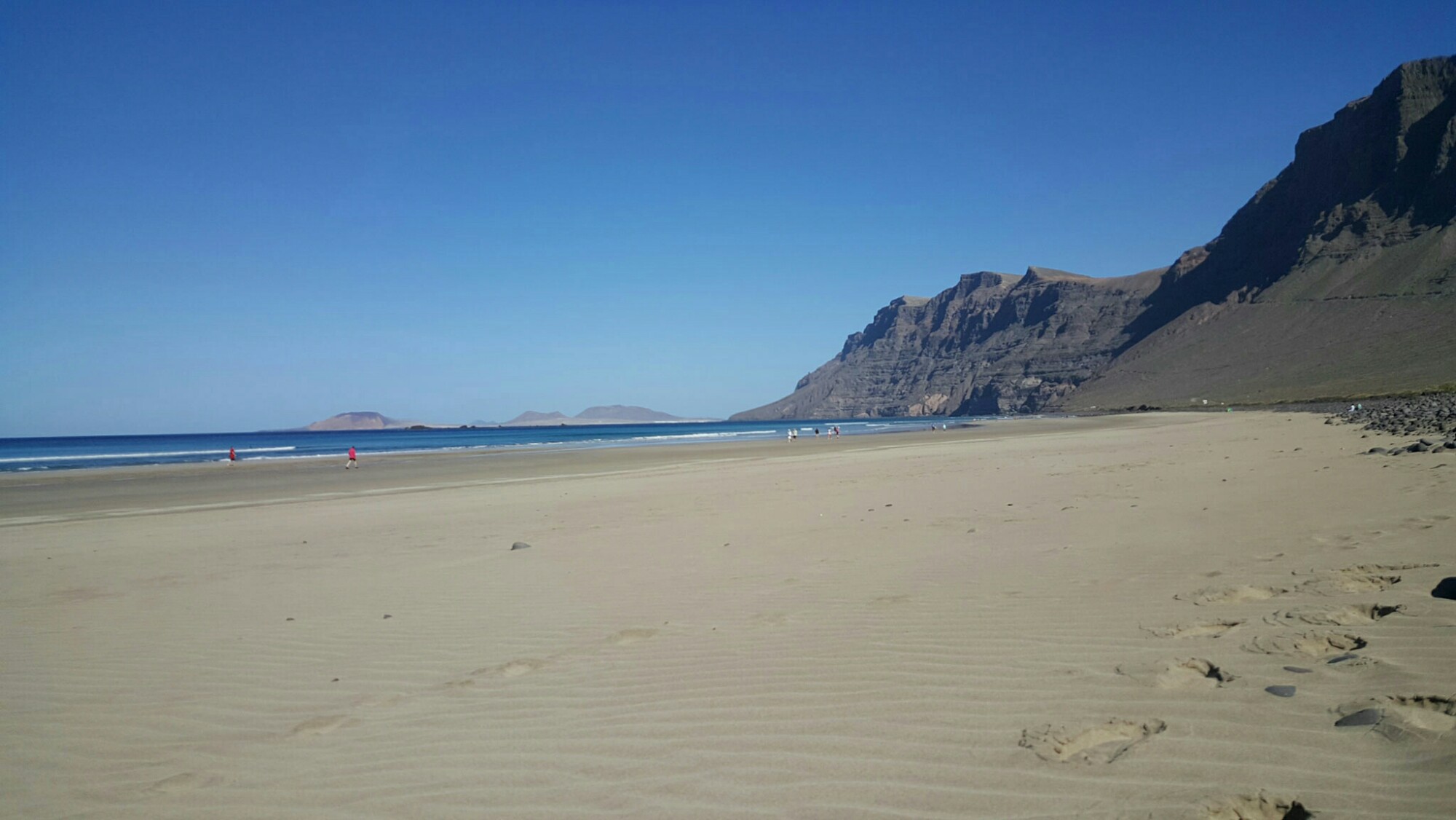 Wenn man den Strand bei niedrigem Wasserstand besucht und dann auf dem kilometerlangen, flach abfallenden und breiten Strand steht, die Rippel den Sandes unter den Füssen spürt, teilweise das flache Wasser auf dem festen Sand durchpflügt und einem die kühle Brise entweder von hinten anschiebt oder von vorne auskühlt, dann fühlt man sich wie an einem der unendlich langen Nordsee-Strände von Jütland (oder Sylt, je nach Vorliebe). Auch Temperatur, Sonnenstand, das klare Licht passen perfekt zu einem Sommertag im Norden. Und die wenigen anderen Strandspaziergänger tragen den selben Kleidermix zwischen Badesachen und Outdoor-Expedition wie in Dänemark (oder wo auch immer). Wenn nur nicht das imposante Famara-Kliff und die Vulkanberge den Horizont begrenzen würden! Die weissen Häuser von Caleta de Famara passen auch nicht ganz in diese Sommerfantasie. Das bringt dich dann doch wieder zurück in die Realität: Lanzarote, Playa de Famara, Weihnachtstag.