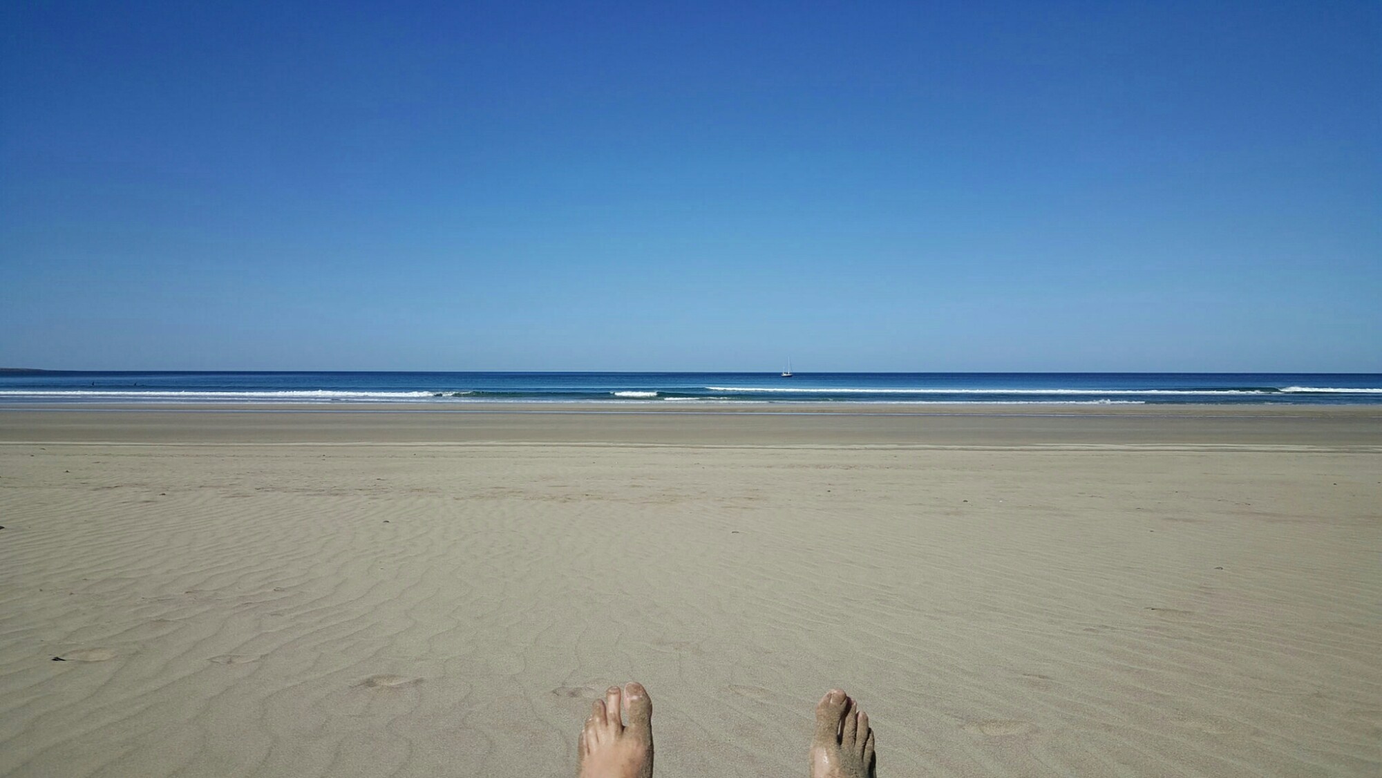 Vor dem Steinwall, der den Strand zu den Dünen hin abgrenzt, konnte ich nach dem ausgiebigen Strandspaziergang den Windschatten auf dem weichen Teil des Strandes geniessen. Jetzt schmeckten die mitgebrachten Brote und die Banane fast genauso gut wie nach einer 10km langen Wanderung.