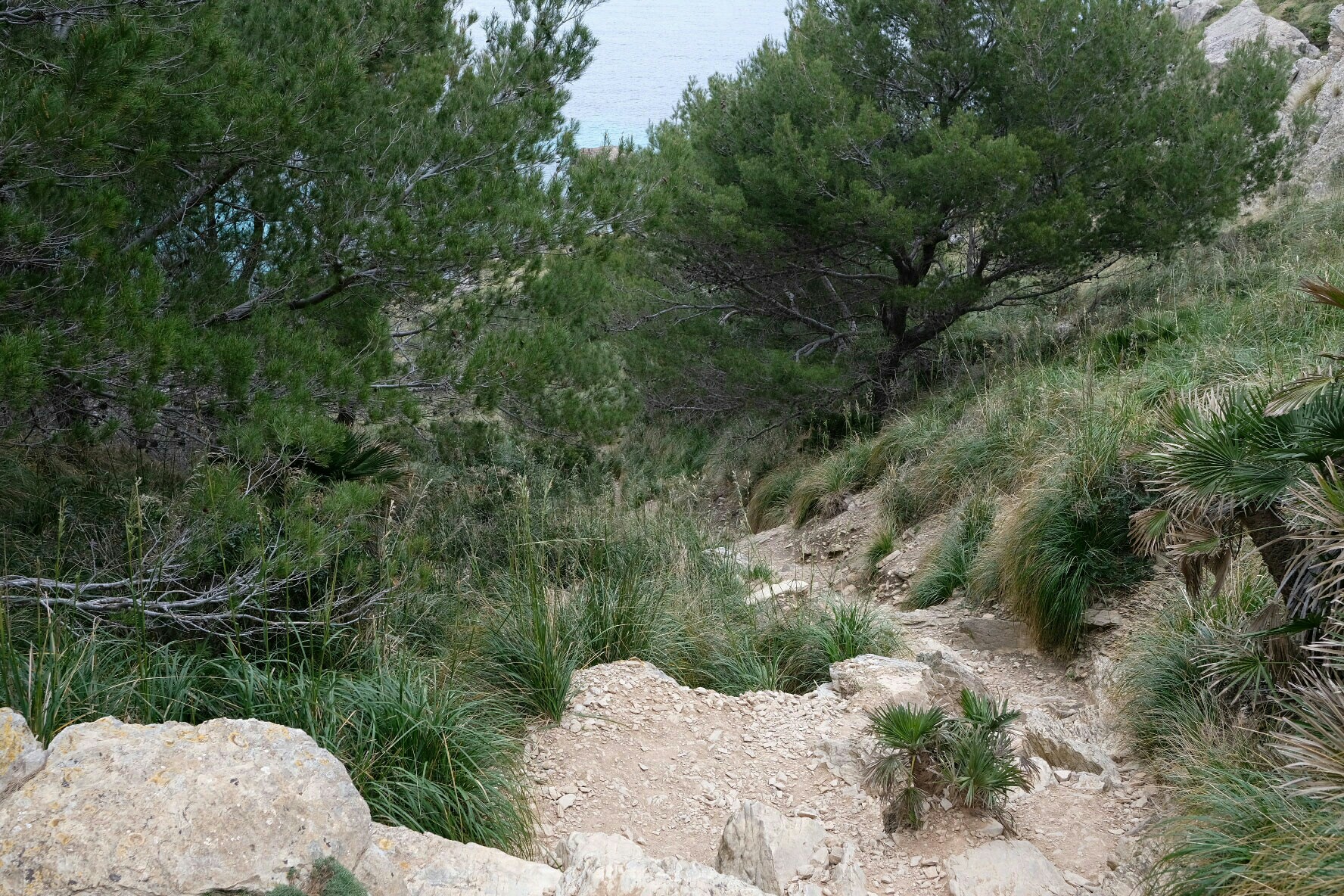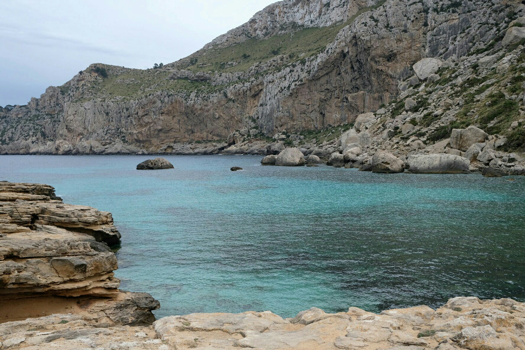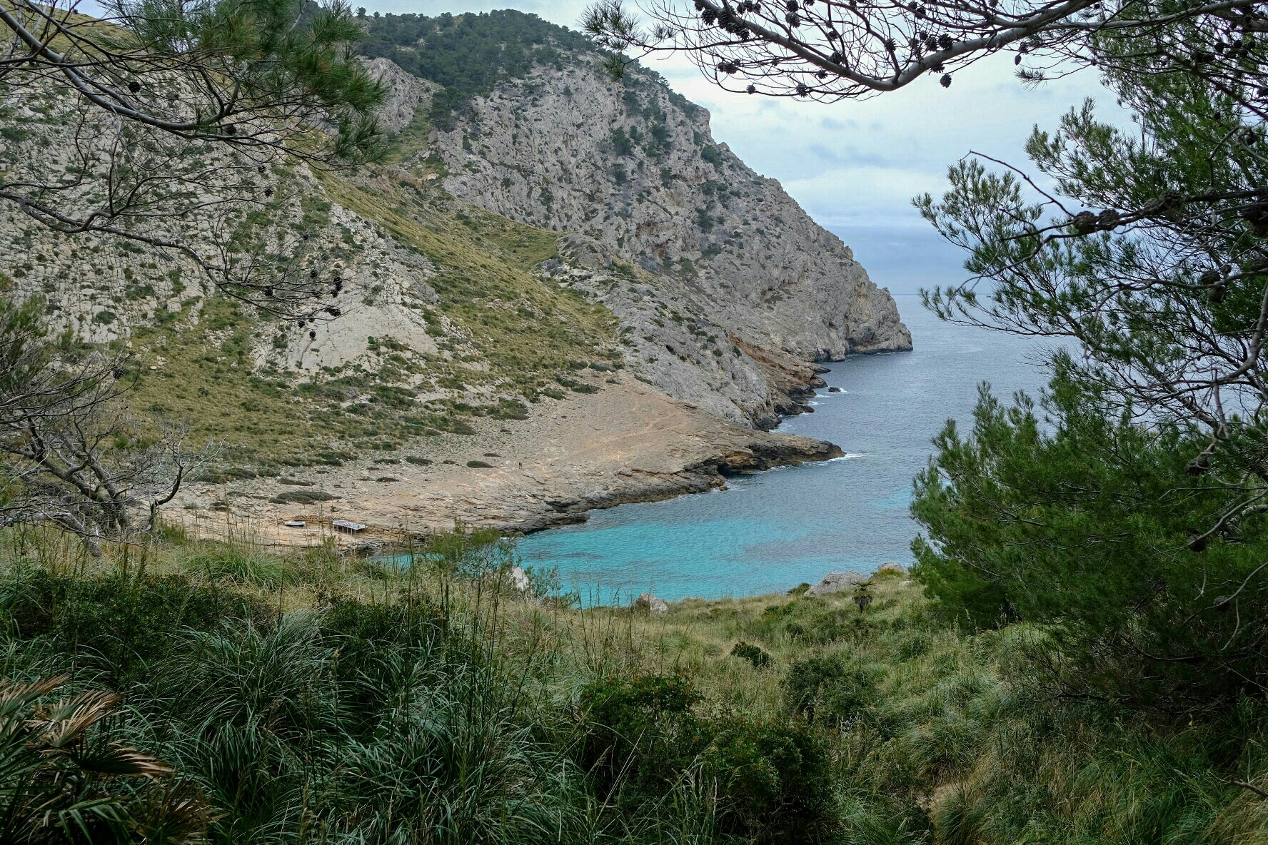 Auf dem Rückweg habe ich eine der beiden bekanntesten Buchten, die Cala Muerta, vom grossen Parkplatz rechts nach dem Tunnel aus, erkundet. Bei Sonnenschein hätte das türkisfarbene Wasser wohl noch mehr Eindruck gemacht. Aber der steile Ab- und Aufstieg hat sich gelohnt.