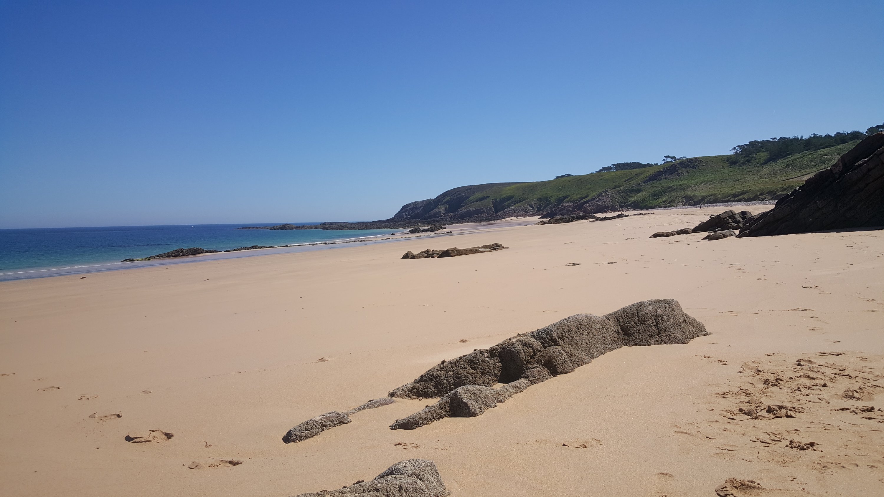 Ich finde den Ausdruck „plages sauvages“ (wörtlich „wilde Strände“) ganz schön romantisch. Die Küste rund um Erquy kann mit vielen wilden Stränden aufwarten. Aber die meisten Strände sind gar nicht wirklich wild, sondern einfach nur natürlich. Und sind meist auch für Familien geeignet. Allerdings muss man sich bewusst sein, dass der Tidenhub hier nicht unbeträchtlich ist: Bei Niedrigwasser hat man einen extrem breiten Strand vor sich. Und bei Hochwasser gibt es vielleicht gar keinen Strand mehr. Wenn man nicht aufpasst, kann man wegen ein paar in’s Meer ragenden Felsen plötzlich eingeschlossen sein. Das Wasser steigt unglaublich schnell! Es lohnt sich also, die Tidentabelle zu beachten.