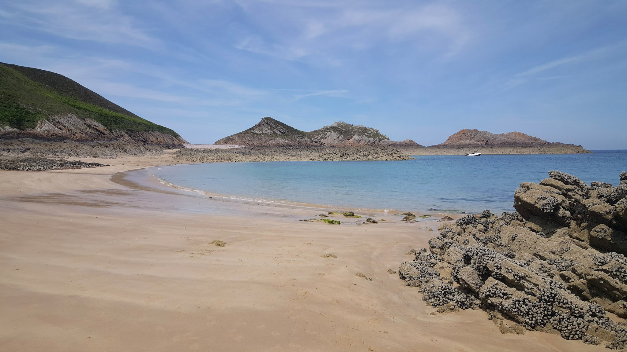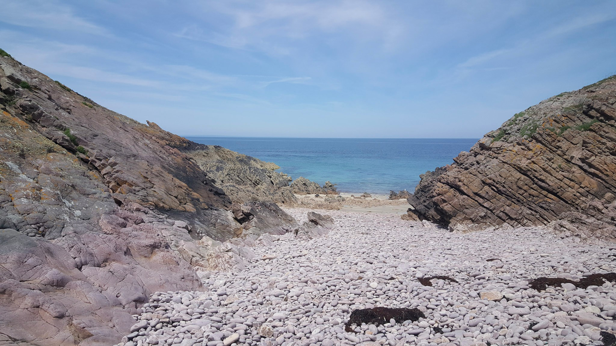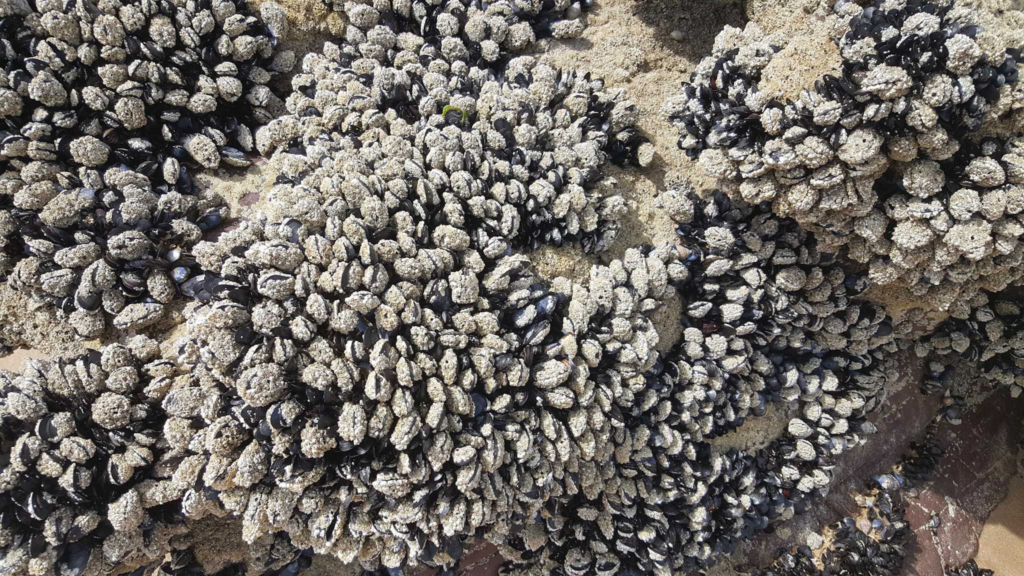Ab Mittag konnte ich nochmals den wunderbaren Strand Lourtuais erkunden. Bei tiefem Wasserstand kann man dem Strand entlang ziemlich weit gehen und am Ende durch eine Lücke in die nächste Bucht gucken. Und da ich mich mittags deutlich unter der Hochwasserkante bewegte, konnte ich auch ein paar Miesmuschelbänke bewundern.