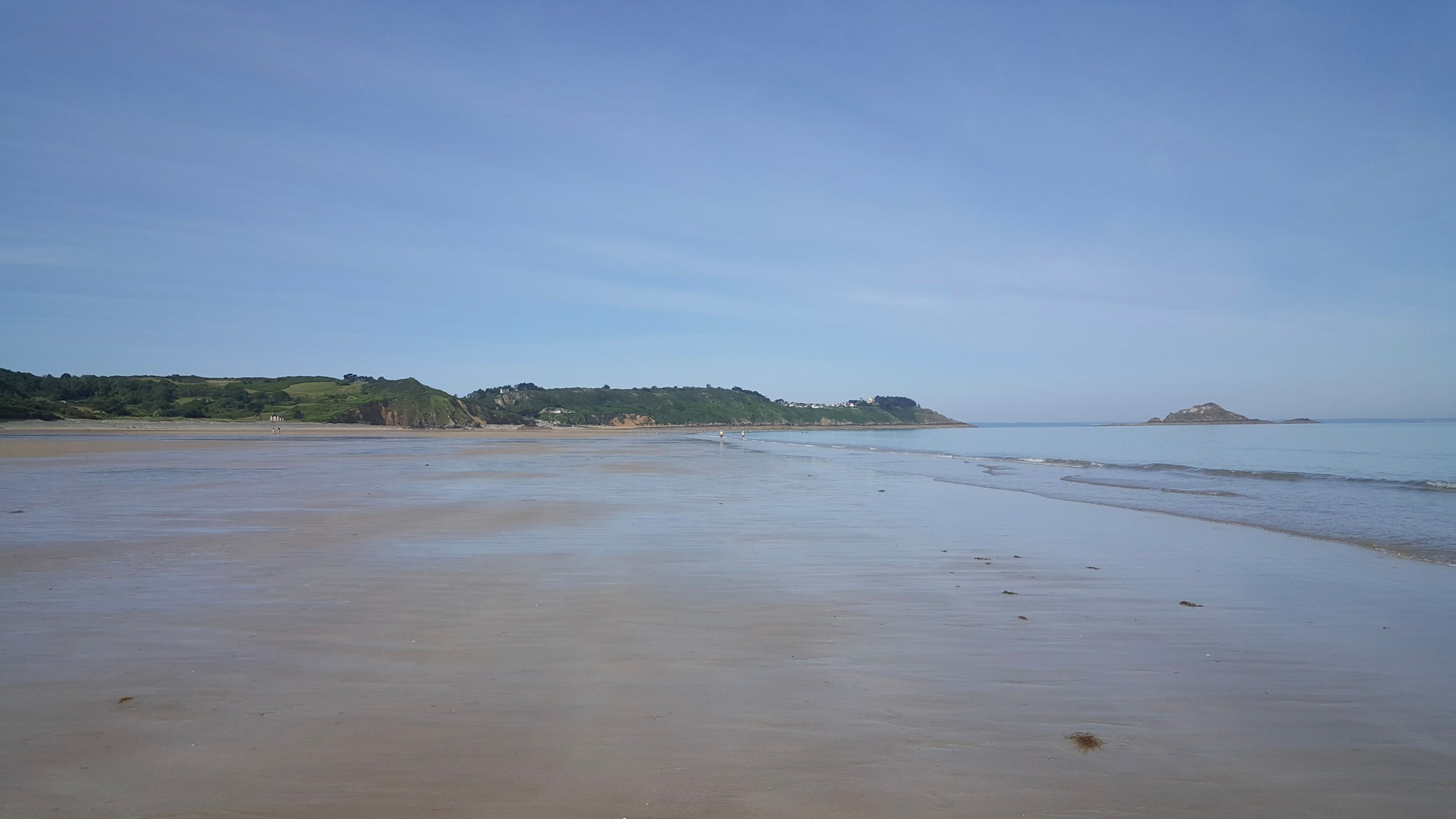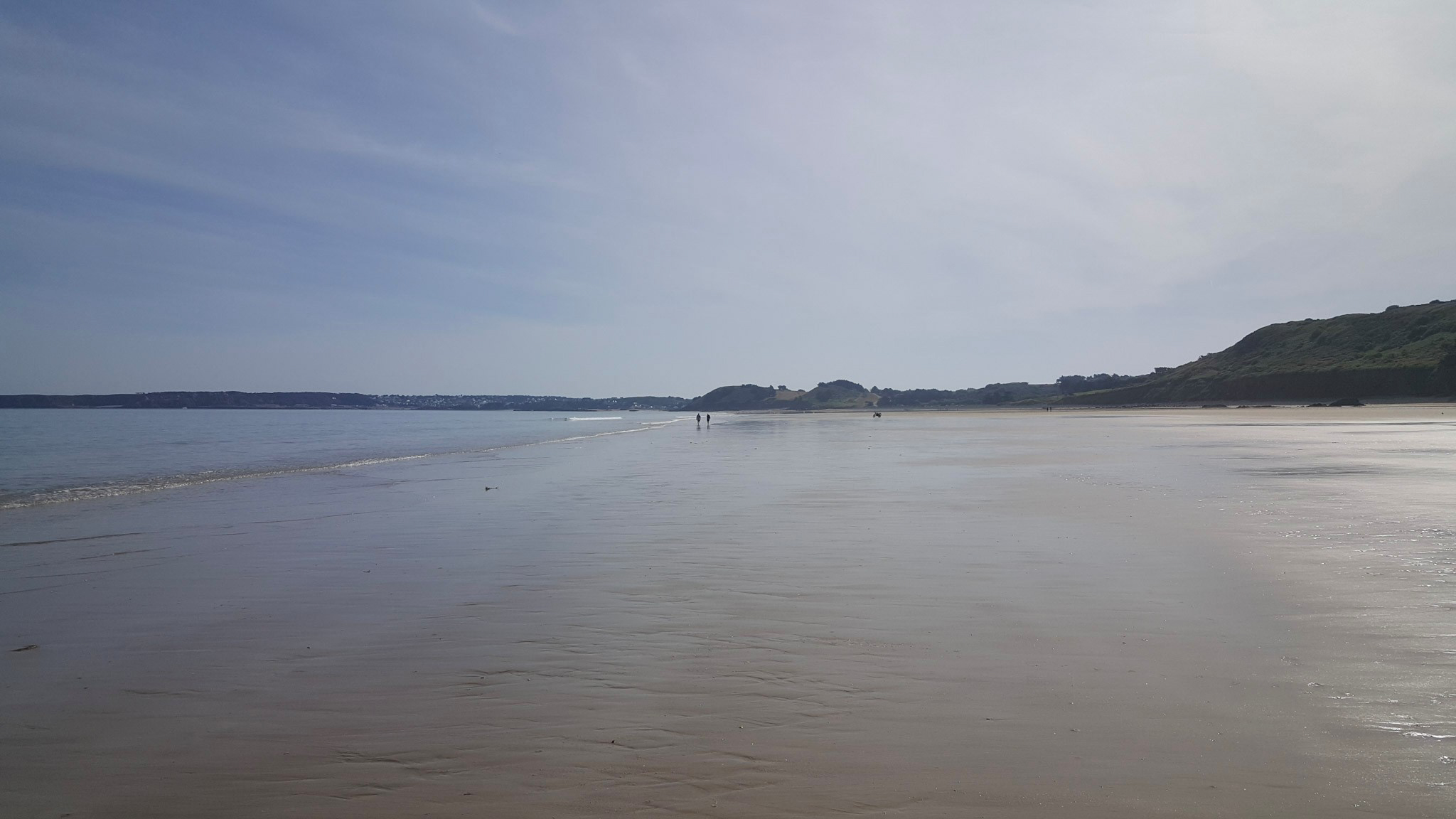 Ich habe heute Morgen westlich von Erquy den (bei Niedrigwasser) extrem breiten Strand von Nantois (bei Pléneuf-Val-André) erwandert. Auf dem Küstenweg waren sehr viele Wandergruppen unterwegs. Und auch die Hunde freuen sich auf den Auslauf.