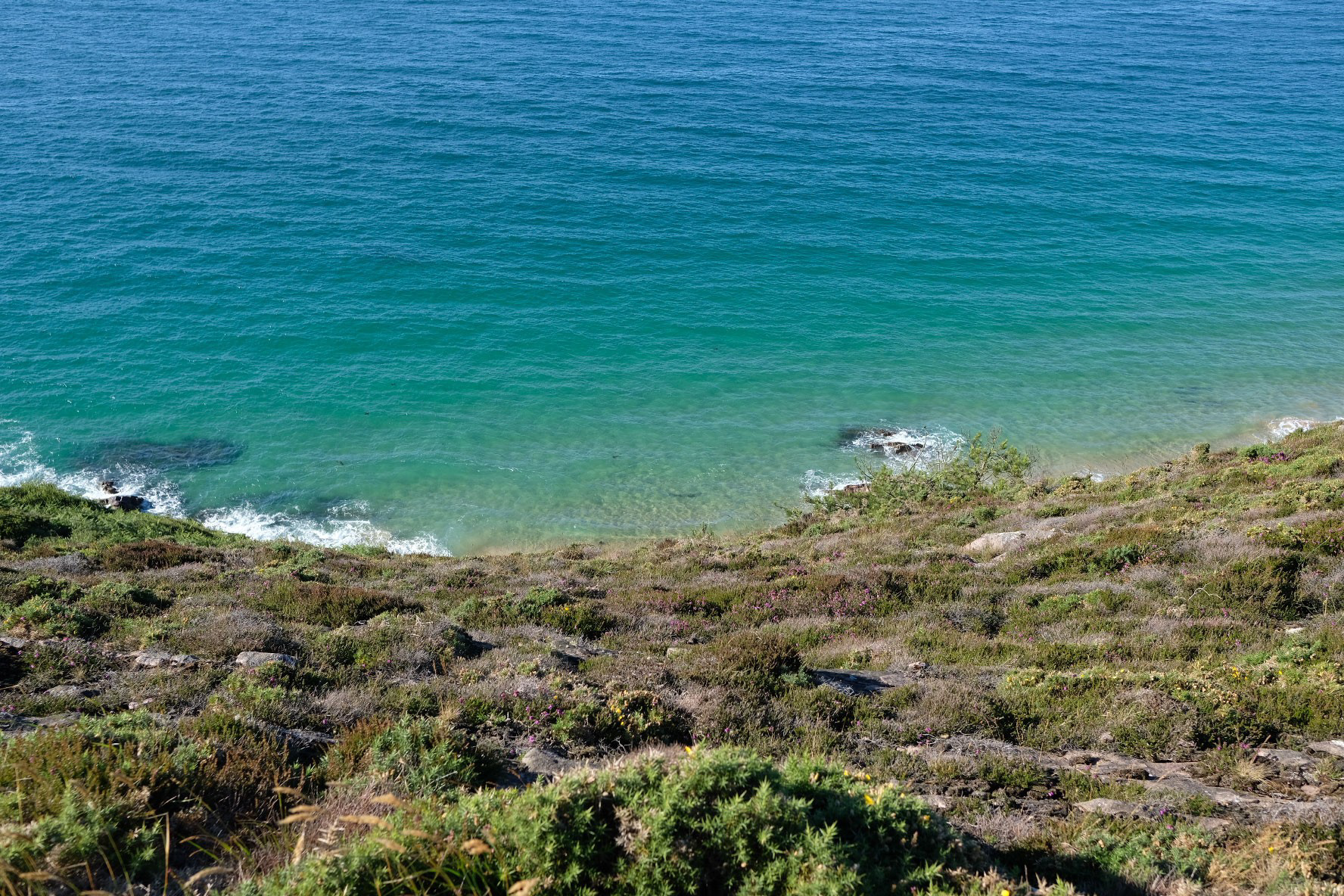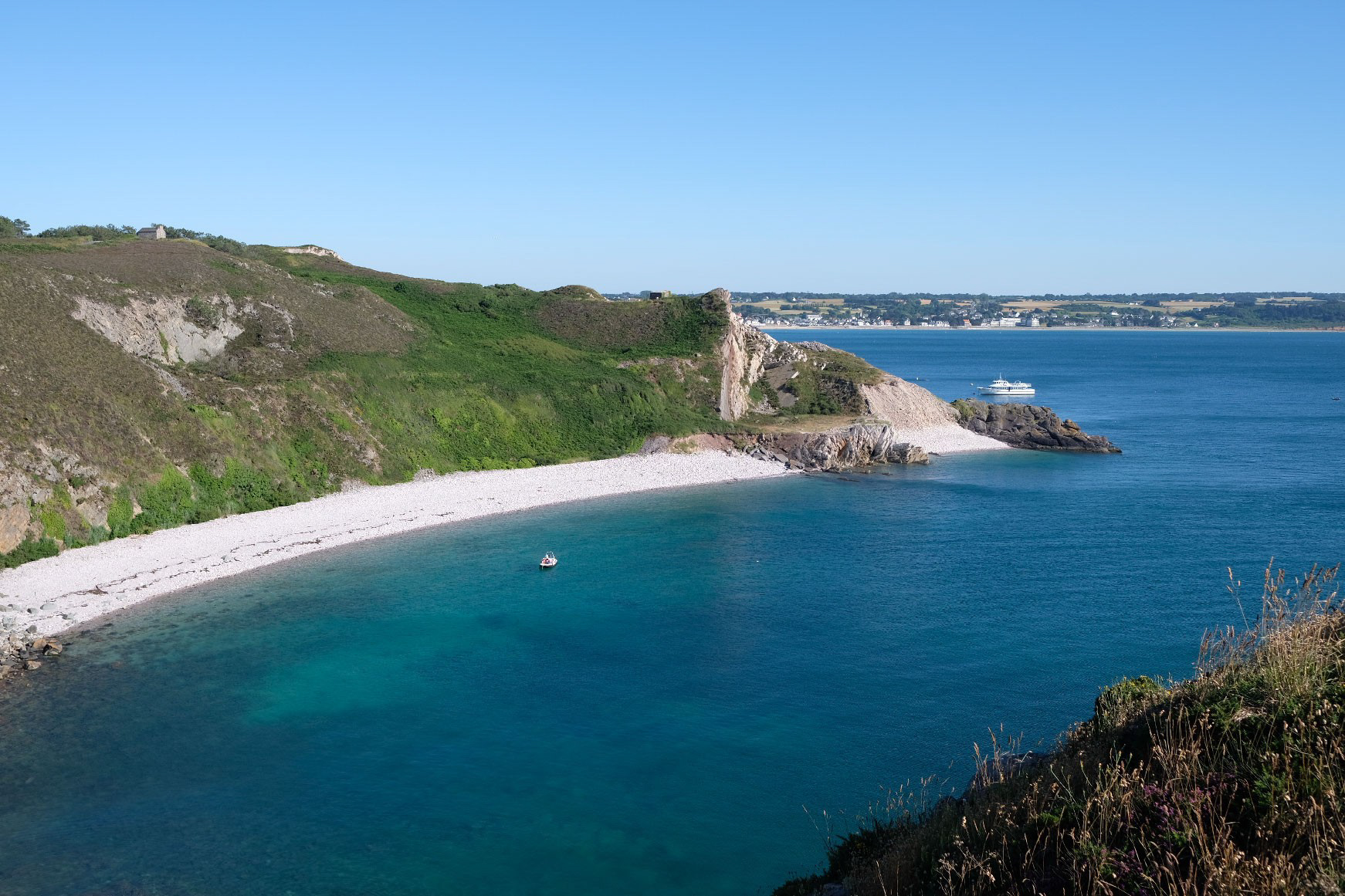 Nach dem zeitigen Abendessen hatte ich aber trotzdem noch Lust, mit einer kleinen Wanderung die Heidelandschaft, die Klippen und die Buchten des Cap d’Erquy zu erkunden. Mein Muskelkater, das durch das intensive Treppensteigen entstanden ist, war ja fast ganz abgeklungen. Also habe ich die Wasserflasche und die Kamera in den Rucksack gepackt und habe das Auto auf dem Parkplatz oberhalb des Ortes geparkt. Die Sonne geht ja erst nach 22 Uhr unter.