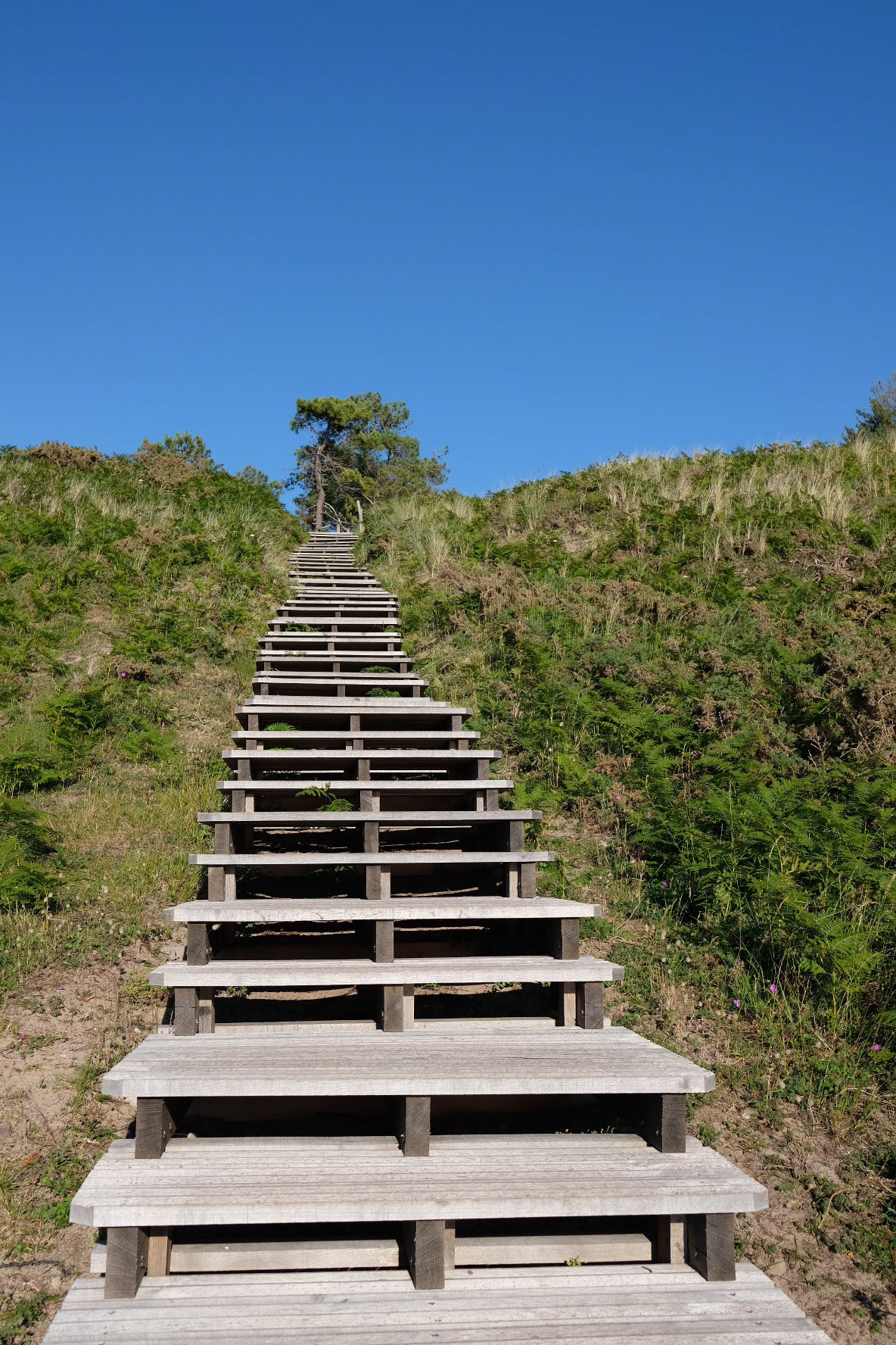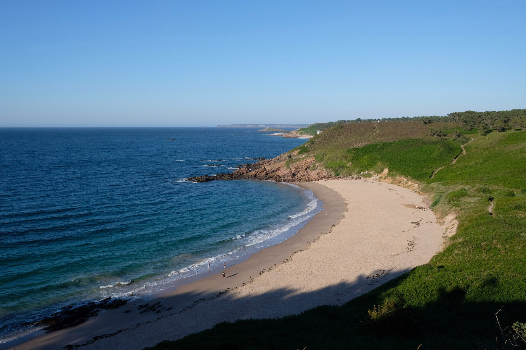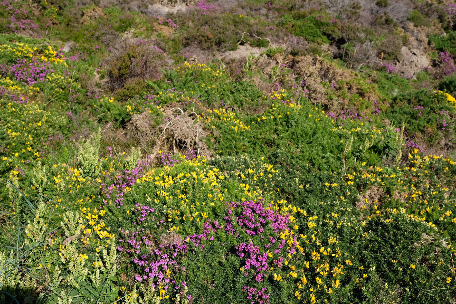 Nach dem zeitigen Abendessen hatte ich aber trotzdem noch Lust, mit einer kleinen Wanderung die Heidelandschaft, die Klippen und die Buchten des Cap d’Erquy zu erkunden. Mein Muskelkater, das durch das intensive Treppensteigen entstanden ist, war ja fast ganz abgeklungen. Also habe ich die Wasserflasche und die Kamera in den Rucksack gepackt und habe das Auto auf dem Parkplatz oberhalb des Ortes geparkt. Die Sonne geht ja erst nach 22 Uhr unter.