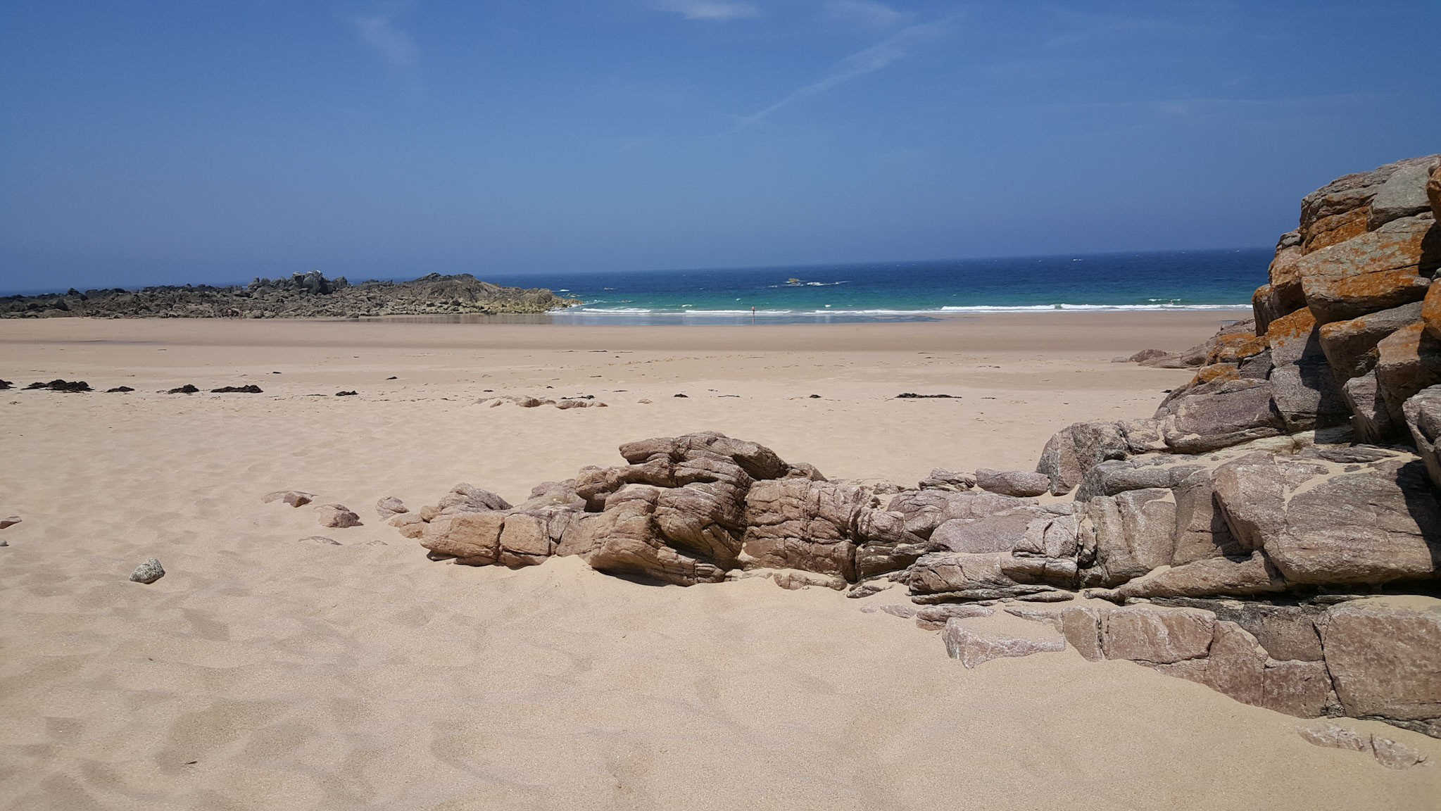 Und da die Côte Penthièvre mit ihren schönen Strände brilliert, fahre ich ein paar Kilometer Richtung Westen und halte am ersten Strand (Plage de la Fosse), um dort meinen Lunch aus dem neu gekauften, thermoisolierten Lunchbag zu geniessen. Luxus ohne Ende…