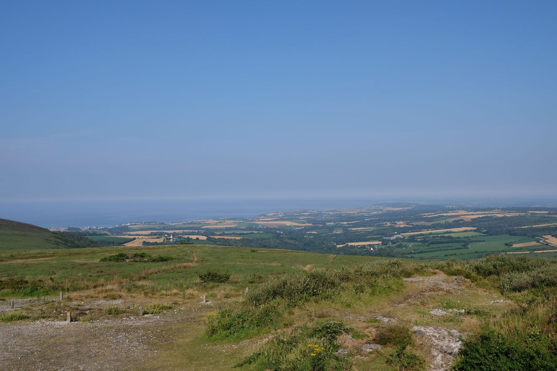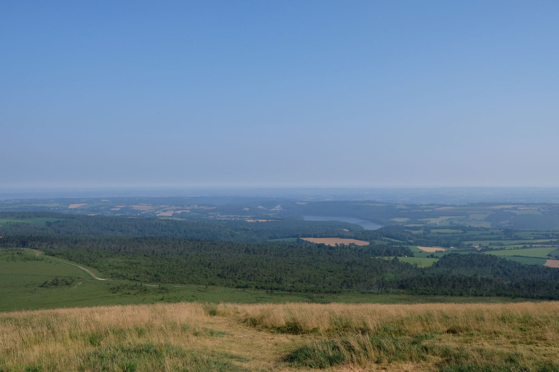 Der Blick kann im Südwesten 24km bis zum Cap de la Chèvre, im Nordwesten 20km bis zur Bucht von Brest reichen. Bei ganz klaren Tagen könnte man im Südwesten 50km bis zur Île de Sein vor der Pointe du Raz oder im Nordwesten 42km bis zum Pointe de Saint-Mathieu schauen. So weit sieht man auf meinen Bildern aber kaum. Der Blick hat auf jeden Fall in das Tal der Aulne gereicht, die markante Brücke der D791 ist ganz gut erkennbar.
