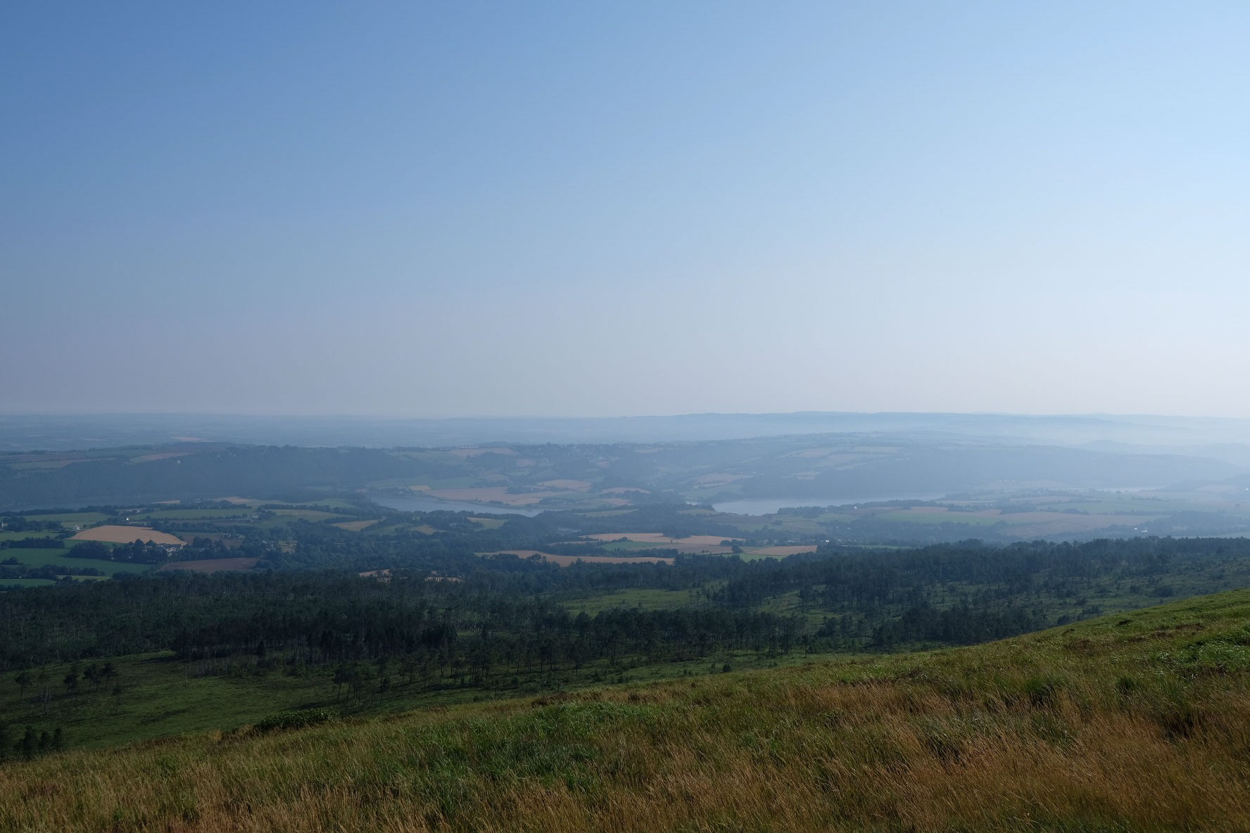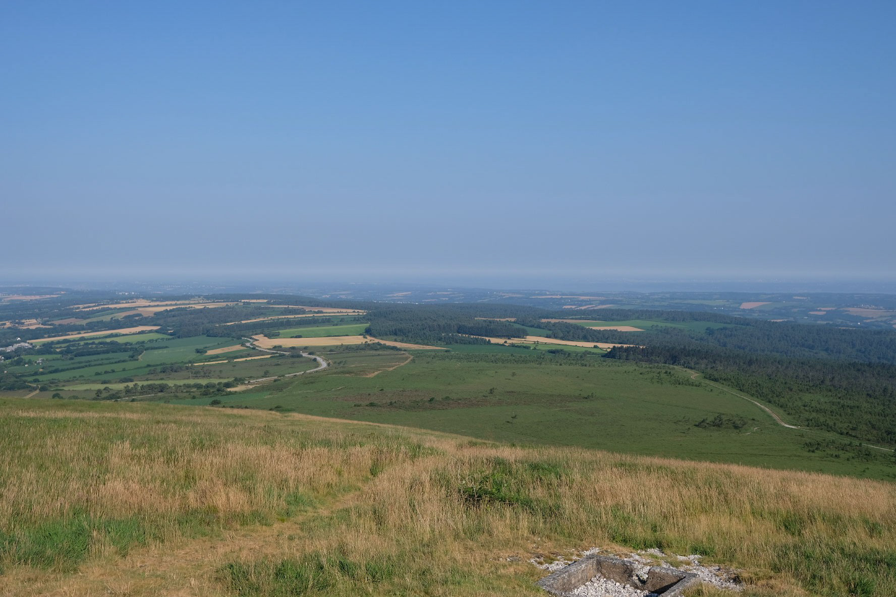 Auf der Fahrt nach Süden bin ich wiederum am Berg Ménez-Hom vorbeigekommen, den ich vorher nicht besucht hatte, weil das bei einem wolkenverhangenen Himmel wenig Sinn macht. Heute aber war der wenige Morgennebel sehr schnell verschwunden und blauer Himmel stimmte mich beim Abschied von der Presqu’Île de Crozon fröhlich. So sieht die Landschaft doch viel freundlicher aus.