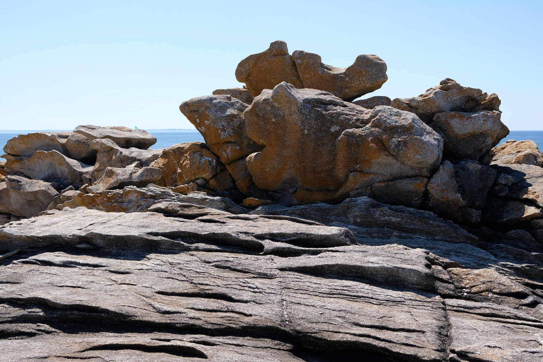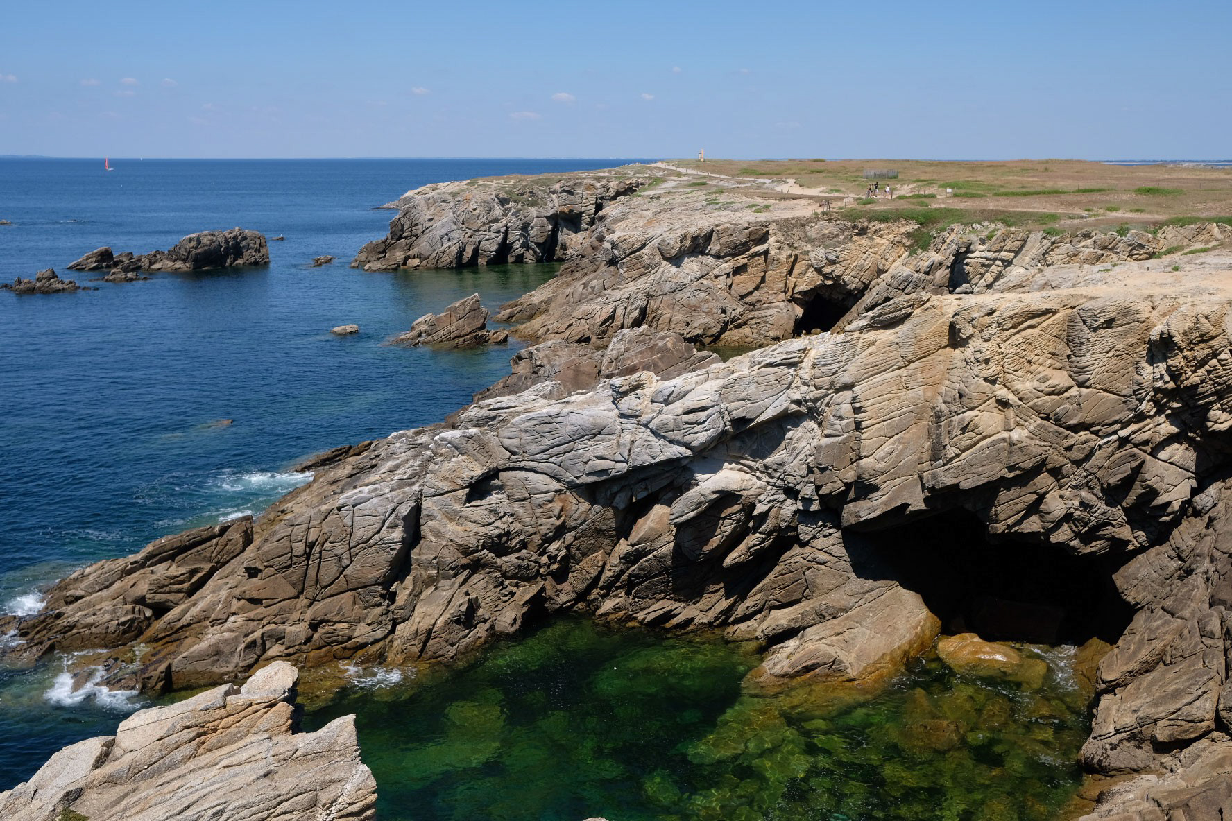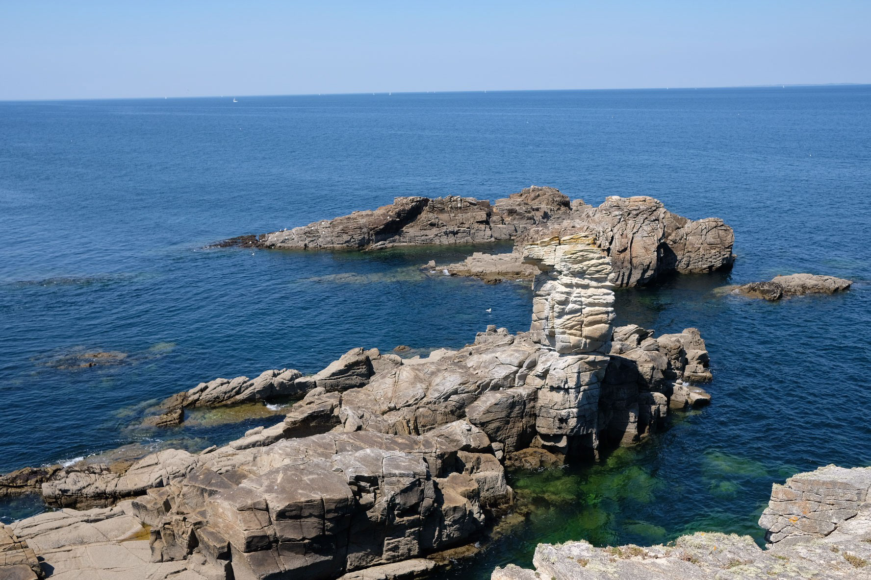 Von der „wilden Küste“ war ausser den sehr eindrücklichen Felsformationen aber nicht viel zu spüren. Blauer Himmel, 30° und recht wenig Wind erzeugten keine Dünung. Allerdings könnte ein Sturmtief auf dem Atlantik auch bei schönem Wetter hohe Wellen an die Küste branden lassen. Wegen den tückischen Strömungen der Tide ist das Gewässer sowieso anspruchsvoll. Das Baden in den kleinen Buchten der Côte Sauvage ist deshalb untersagt.