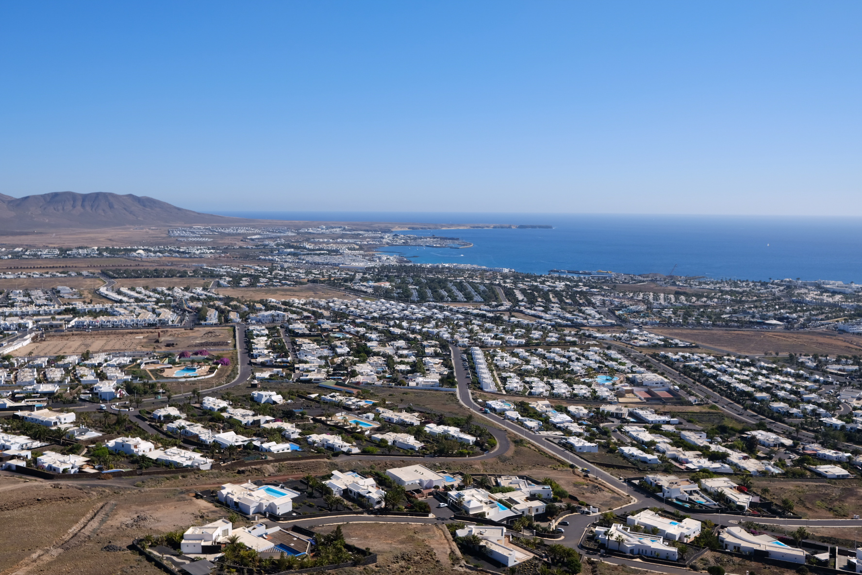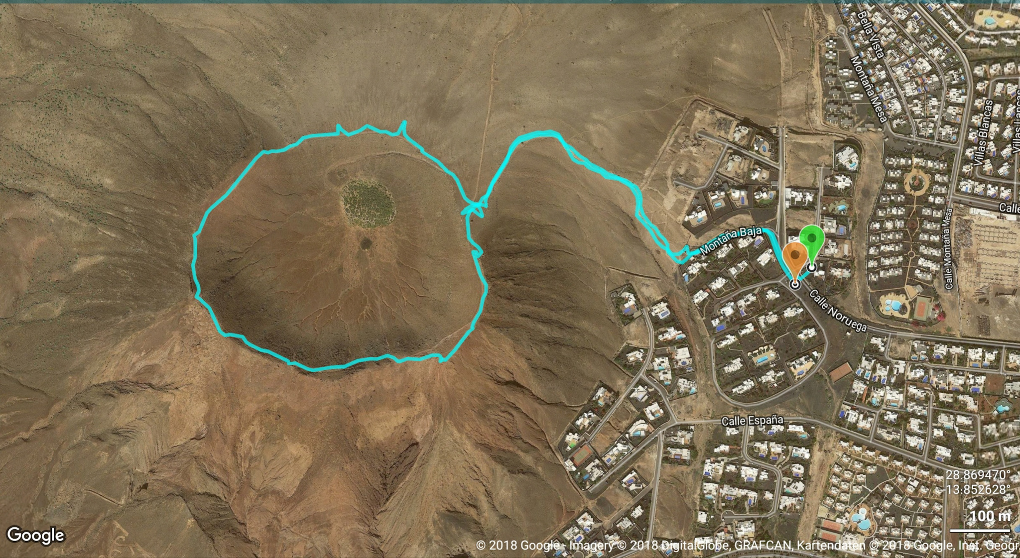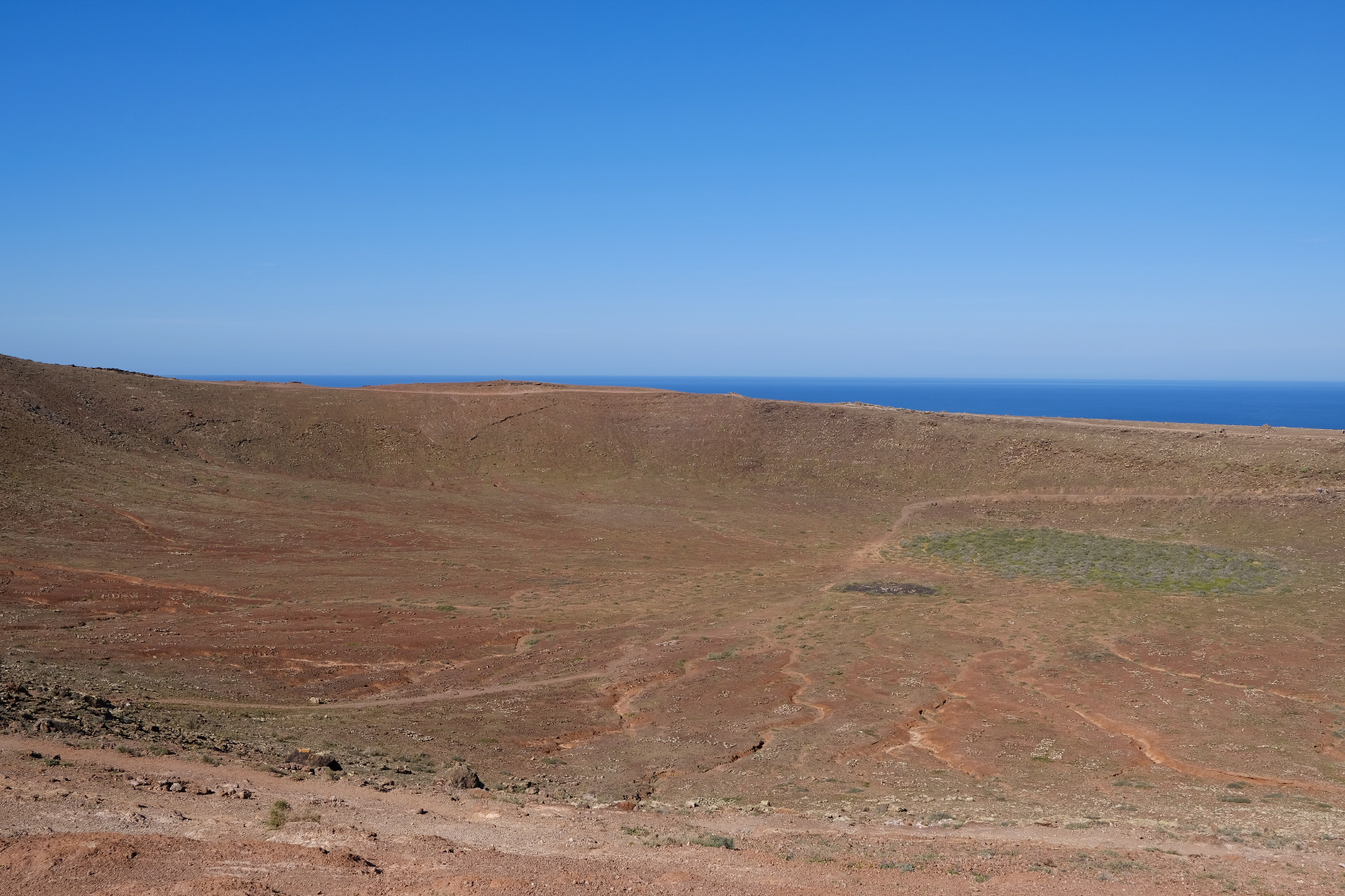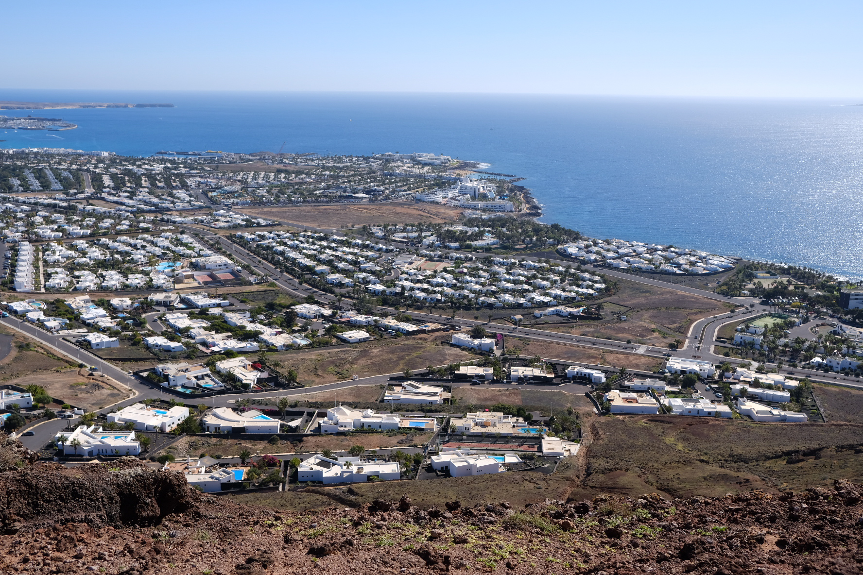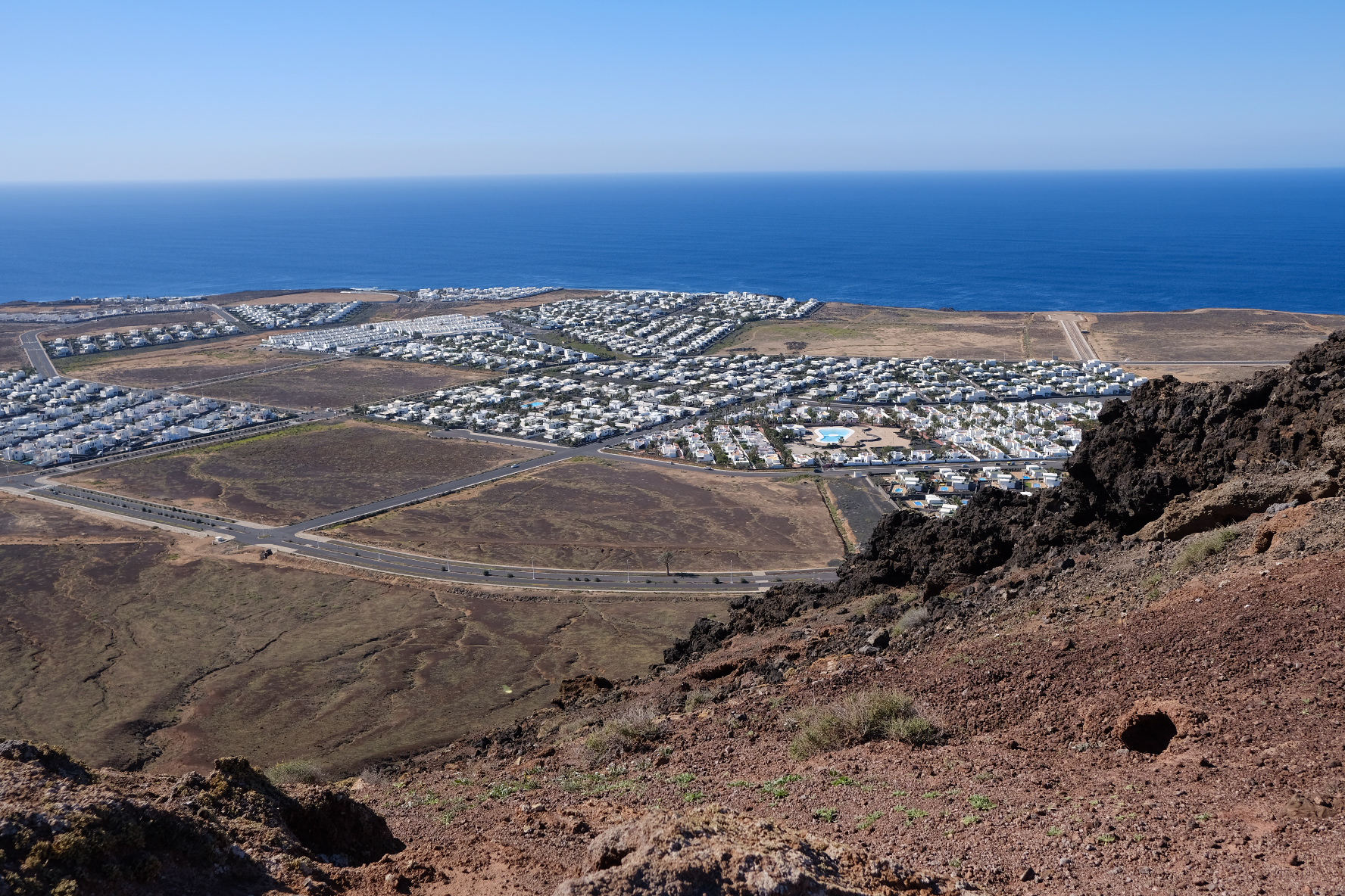 Man hat auf der Kraterumrundung einen wundervollen Ausblick zuerst über Playa Blanca, dann entlang des Faro Pechiguera auf die Nachbarinsel Fuerteventura, danach über Lanzarote bis zu den Feuerbergen. Fast ganz rund um den Vulkan sind die Strassen für weitere Bungalowsiedlungen schon vorbereitet: Es geht wohl nur noch ein paar Jahre, bis der Vulkan rundum von Bungalowanlagen eingeschlossen sein wird.