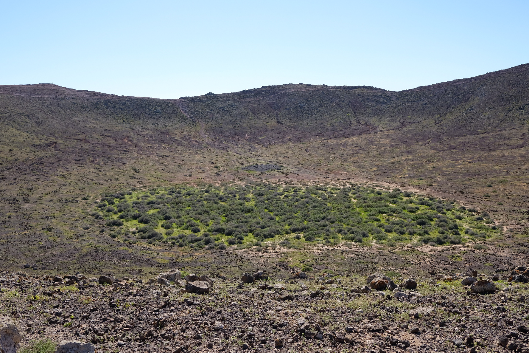 Ich musste mit dem Auto nur durch den Ort fahren und an einer Strasse des Villenviertels am Fuss des Vulkans Parken. Beim Beginn des Wanderwegs stehen ein paar grössere und ansehnliche Villen. Bei einem Mobilfunkmast startet der Pfad auf den Vulkan. Schneller und mit weniger Energie als gedacht stehe ich schon bei einer anderthalb Meter hohen Steinpyramide am Kraterrand der Montaña Roja. Hier kann ich das erste Mal in die riesige Kraterschüssel schauen.