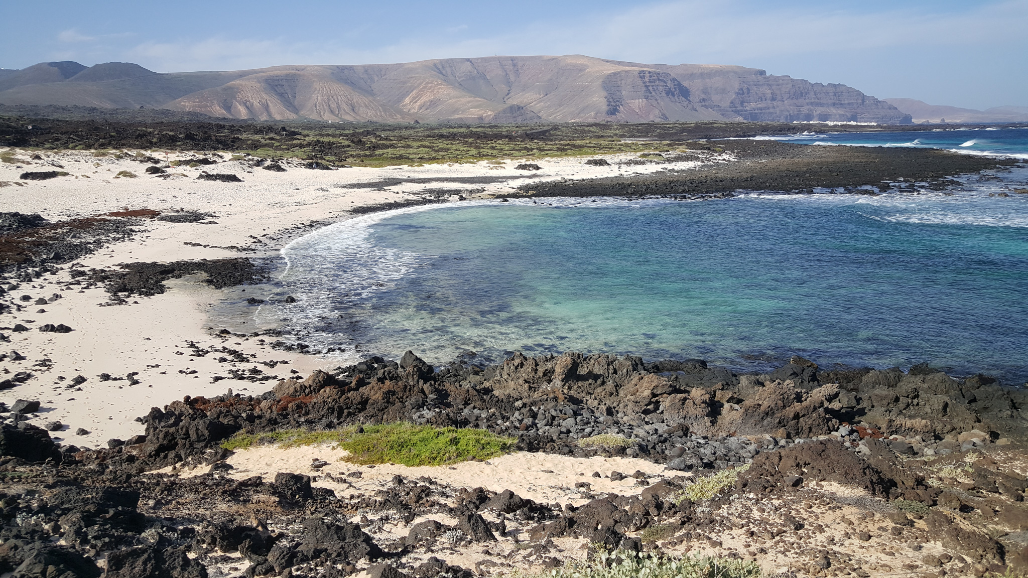An der Küste des Malpais vor Orzola hat sich weisser Sand als Dünen und Strände in der schwarzen Brockenlava des Malpais angesammelt.