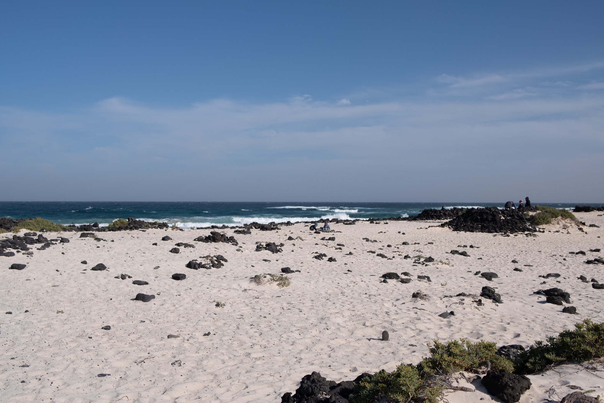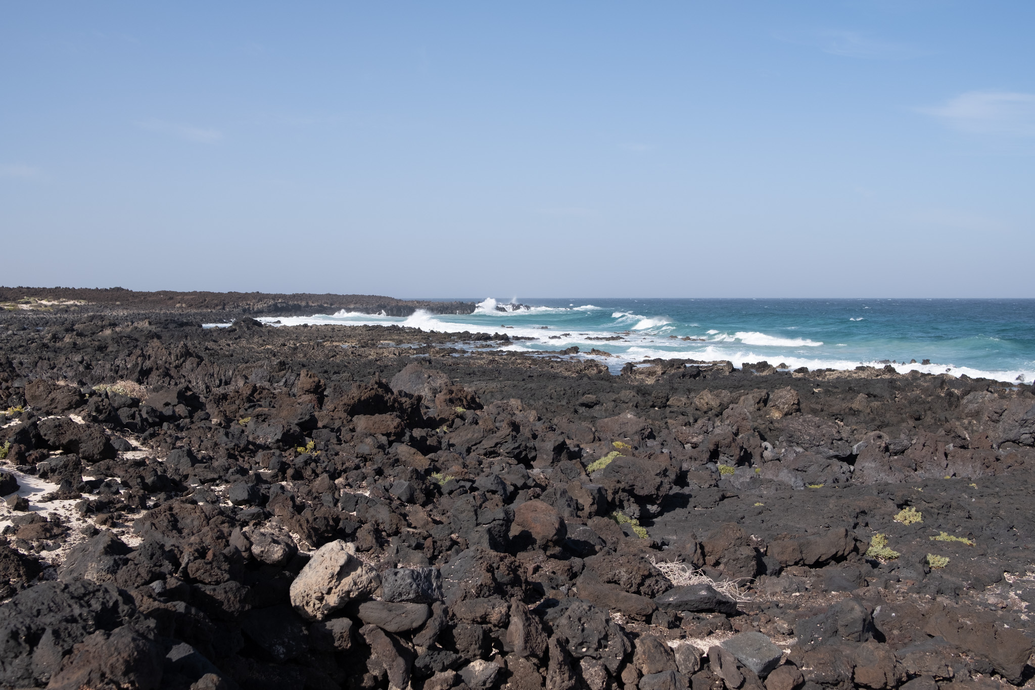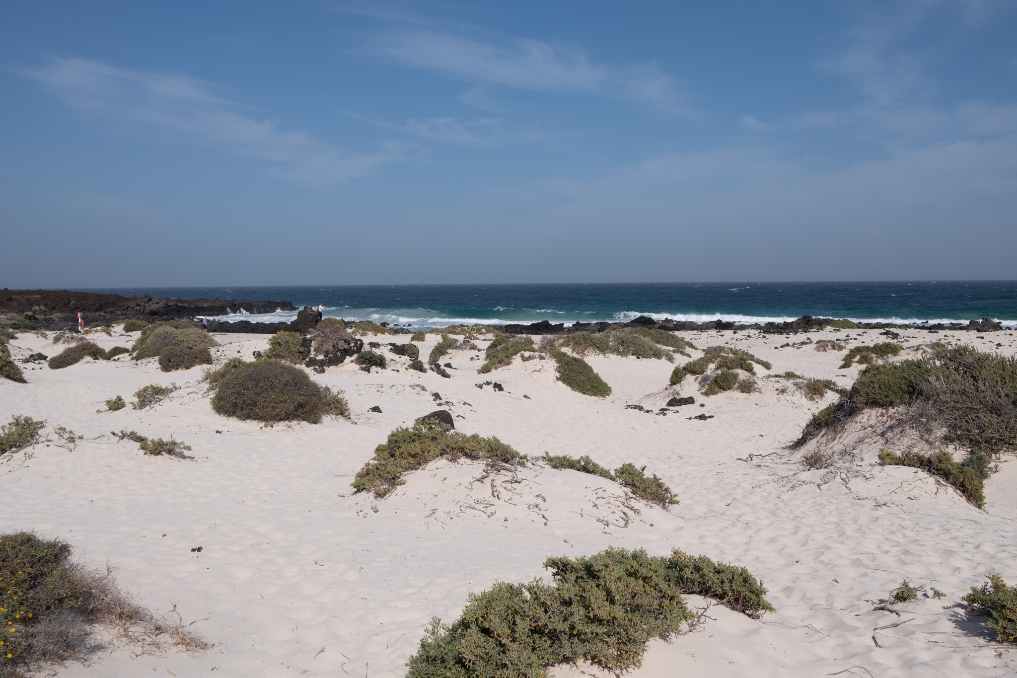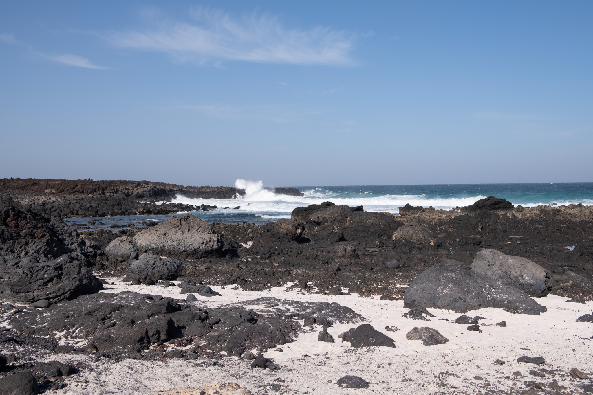 Dieser Kontrast zwischen dem Weiss des Dünensandes, dem Schwarz der Lava sowie dem Blau und Türkis des Wassers lässt einem innehalten und staunen. Den heranrollenden Wellen kann nicht nur ich eine sehr lange Zeit zusehen! In der Caleta del Mojón Blanco haben sich sogar zwei Surfer (mit Neoprenanzug) in die tollen Wellen gewagt. In der Bucht kann man draussen auf dem felsenlosen Sand sogar stehen, was das Surfen natürlich angenehm macht. Wenn man die Grössenverhältnisse zwischen Mensch und Welle betrachtet, dann erkennt man erst die Wucht der heranrollenden Brecher.