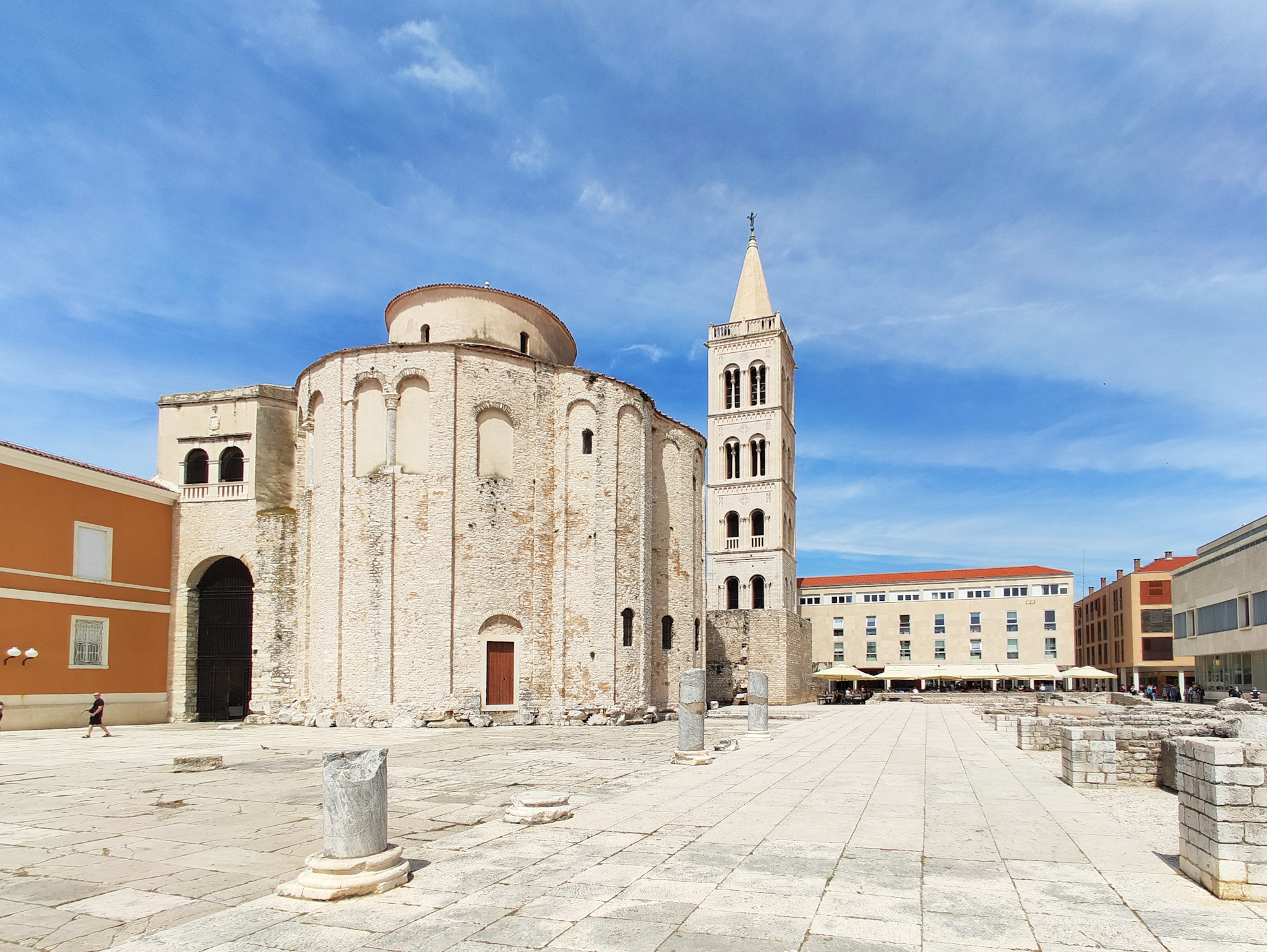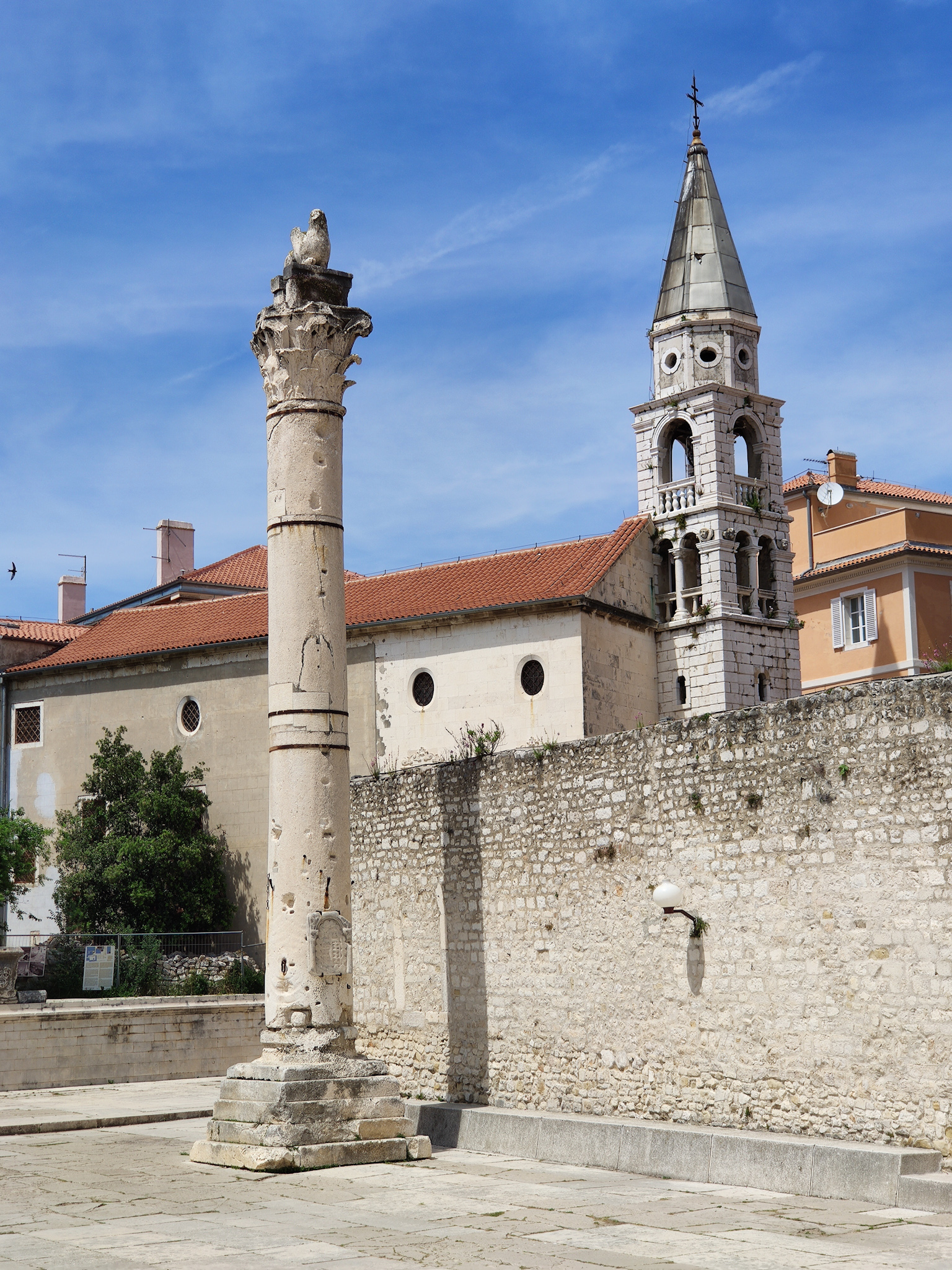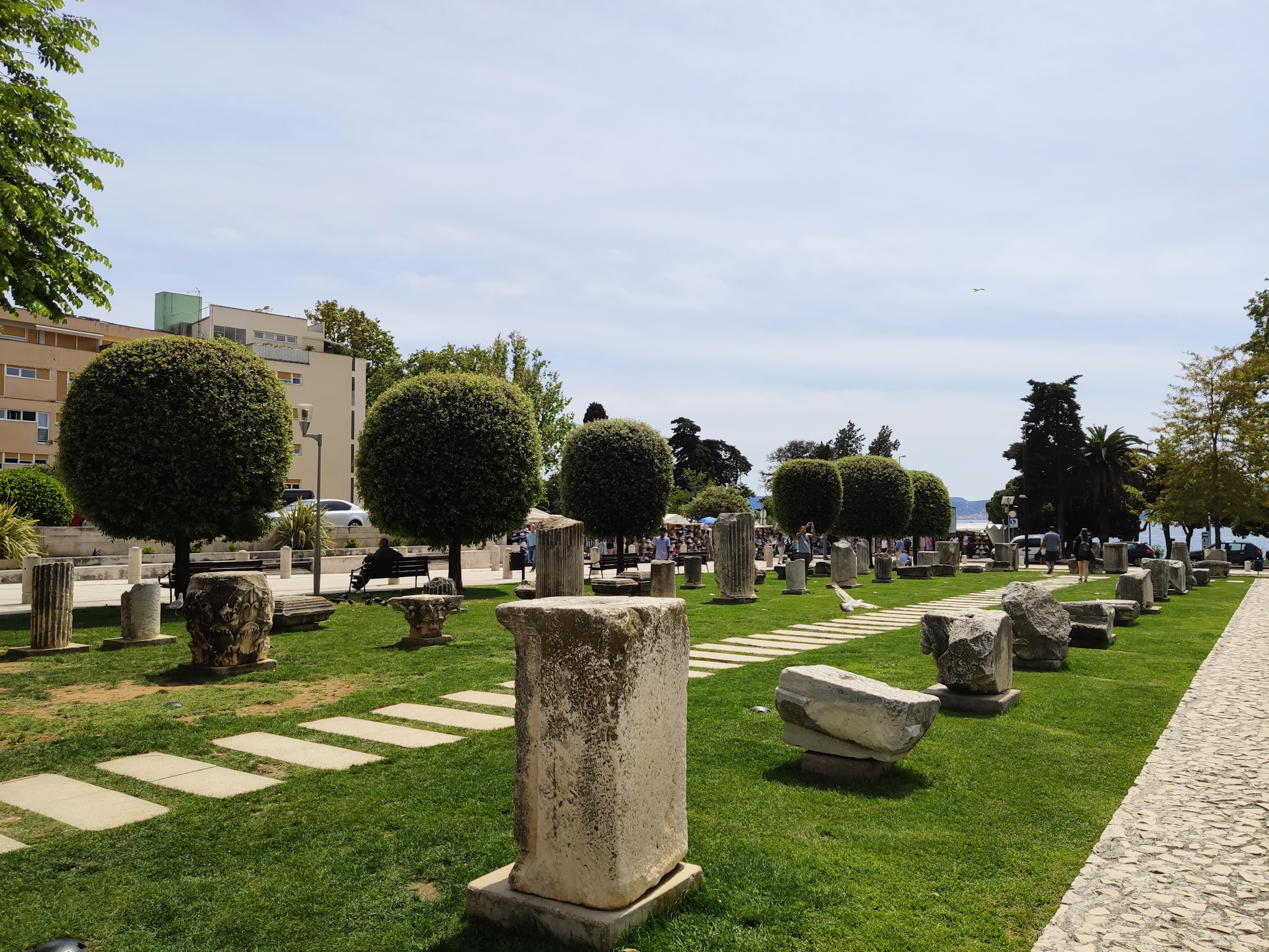 Das antike Zentrum mit dem ausgedehnten Römischen Forum liegt am nordwestlichen Ende der Stadt. Säulenreste und weitere Funde liegen auf dem Rasen und dem Platz, die kostbareren Stücke sind im archäologischen Museum, gleich nebenan, ausgestellt. Aber für einen Museumsbesuch war heute einfach das Wetter zu schön. Am Forum kann man auch die doppelstöckige Rundkirche Sv Donat finden. Es ist eine der ältesten christlichen Kirchen von Kroatien, erbaut 810 bis 815. Daran angebaut ist die Anastasia-Kathedrale mir ihrem schönen Turm. Sie ist das bedeutendste romanische Bauwerk der Stadt. Das Benediktinerkloster Sv Marija, gleich gegenüber am Forum, aus dem 11. Jh. präsentiert Kirchenschätze vom 8. bis zum 18. Jh.; eine der wertvollsten Sammlungen des Landes. Vom Forum kann man gleich auf die Mitte der sehr langen Promenade gelangen.
