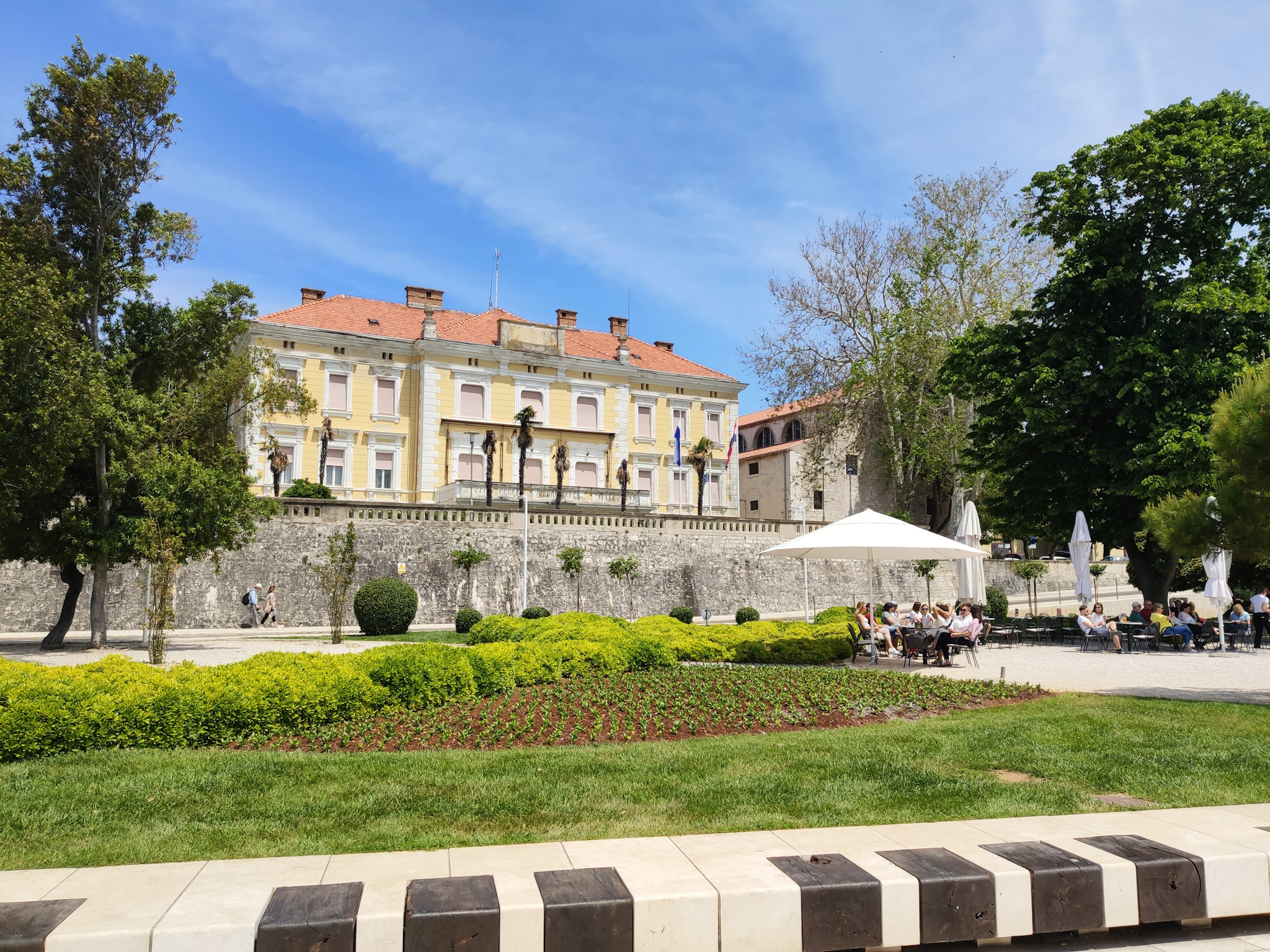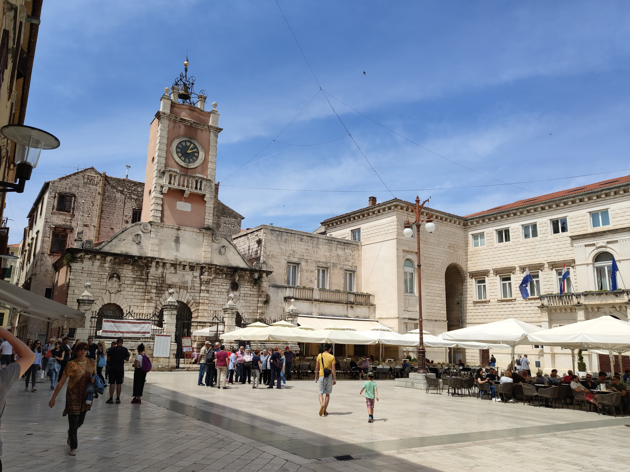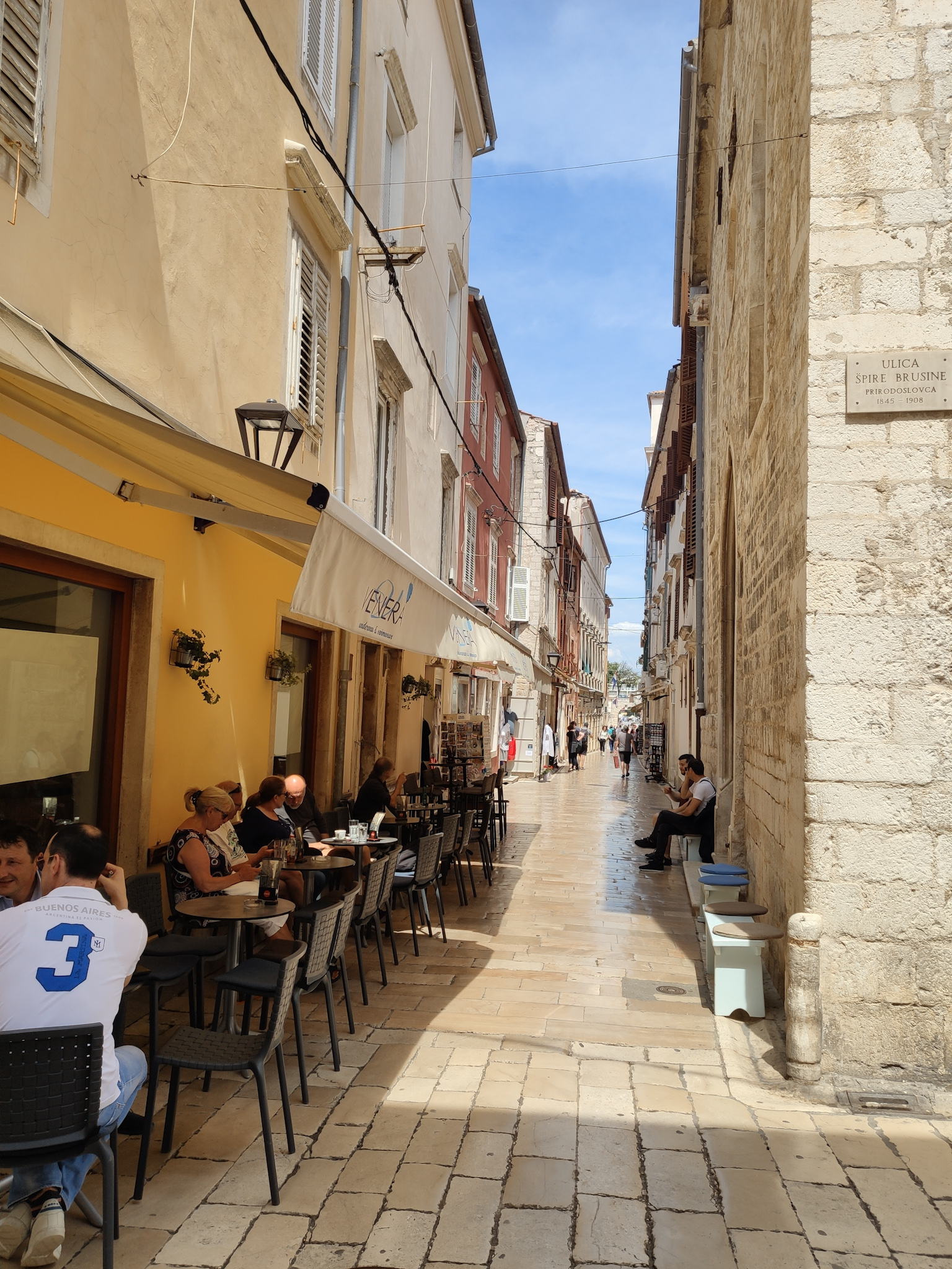 Das antike Zentrum mit dem ausgedehnten Römischen Forum liegt am nordwestlichen Ende der Stadt. Säulenreste und weitere Funde liegen auf dem Rasen und dem Platz, die kostbareren Stücke sind im archäologischen Museum, gleich nebenan, ausgestellt. Aber für einen Museumsbesuch war heute einfach das Wetter zu schön. Am Forum kann man auch die doppelstöckige Rundkirche Sv Donat finden. Es ist eine der ältesten christlichen Kirchen von Kroatien, erbaut 810 bis 815. Daran angebaut ist die Anastasia-Kathedrale mir ihrem schönen Turm. Sie ist das bedeutendste romanische Bauwerk der Stadt. Das Benediktinerkloster Sv Marija, gleich gegenüber am Forum, aus dem 11. Jh. präsentiert Kirchenschätze vom 8. bis zum 18. Jh.; eine der wertvollsten Sammlungen des Landes. Vom Forum kann man gleich auf die Mitte der sehr langen Promenade gelangen.