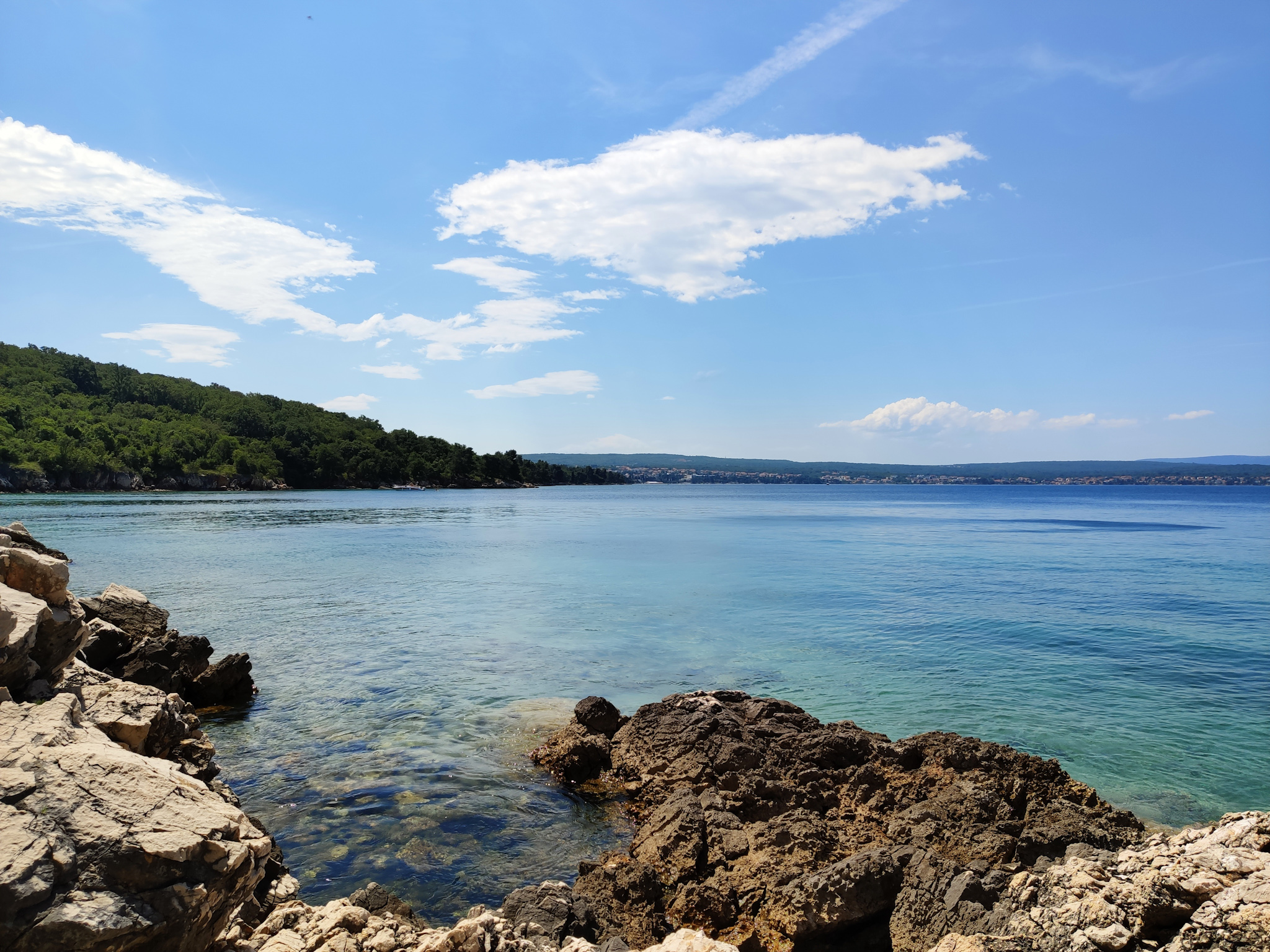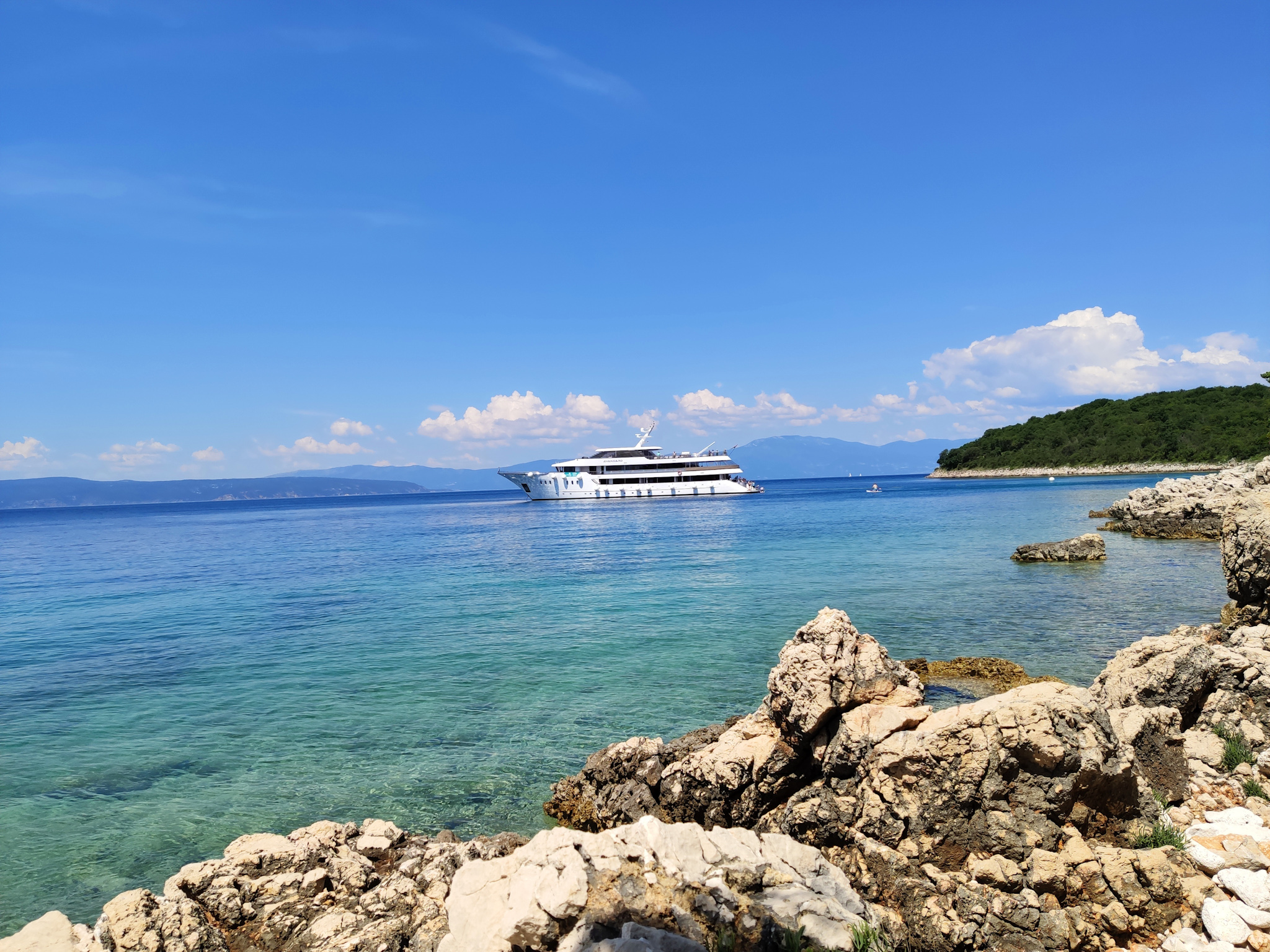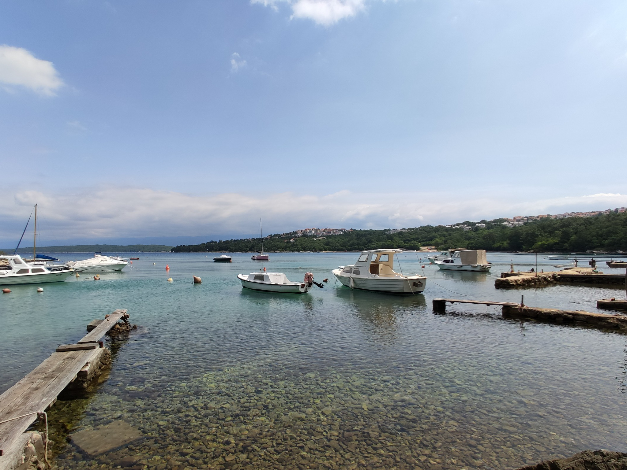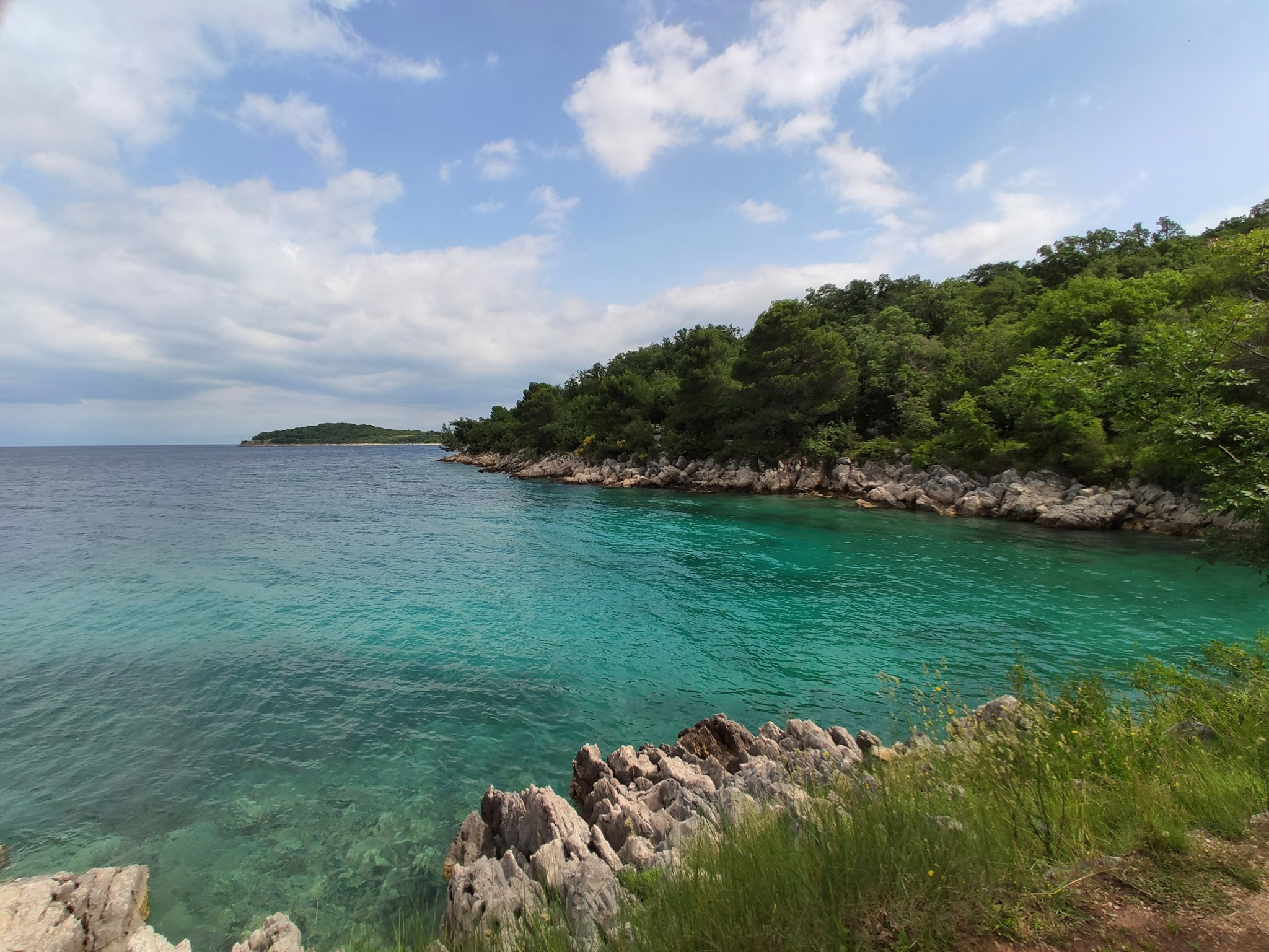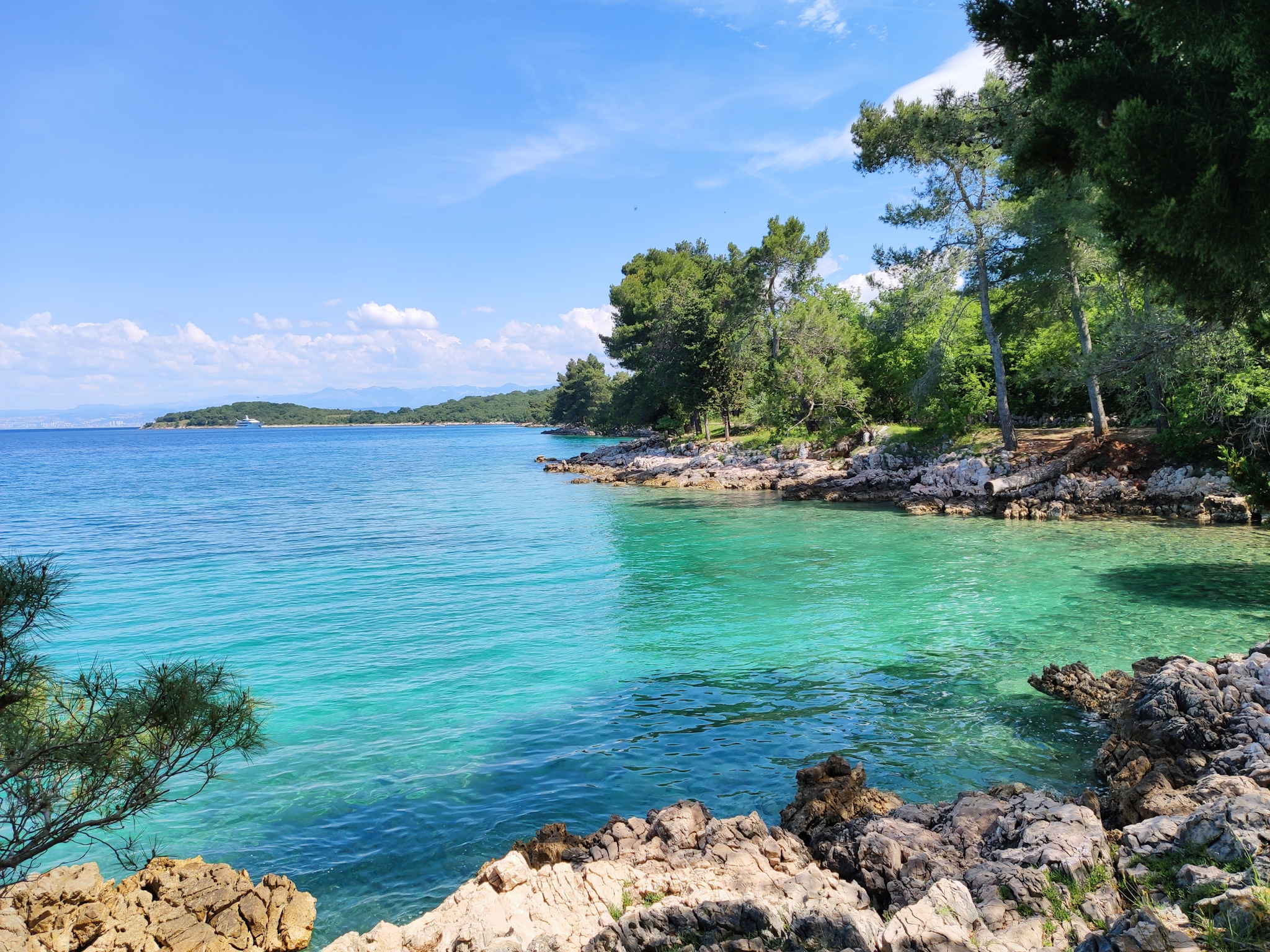 Von der lauschigen Bar Paradajz geht der Paradiesweg dann entlang der felsigen Küste in einem wunderbaren Kiefernwald. Die Ausblicke auf das Wasser und die kleinen Buchten, ein paar steile Badestellen geben ein tolles Stimmungsbild ab. Man fühlt sich tatsächlich wie im Paradies und kann die Begeisterung der paar Skipper verstehen, welche ihre Boote im türkisblauen Wasser ankern, um Schwimmen zu gehen.