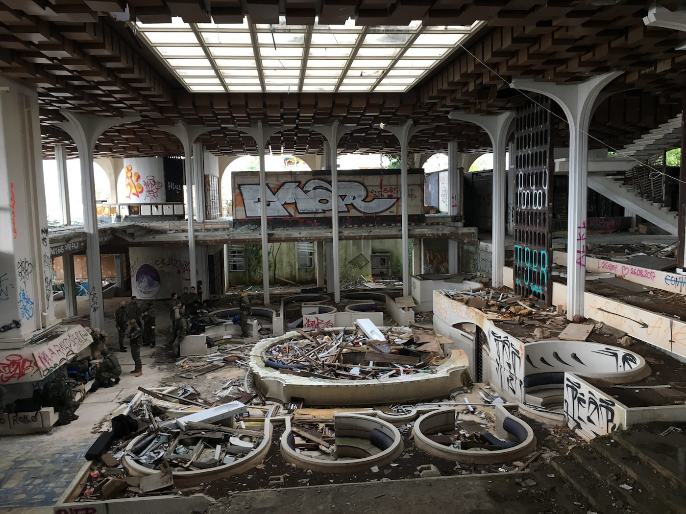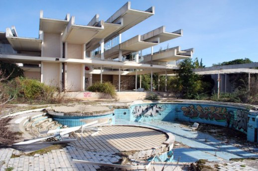 Das Hotel wurde von Bob Guccione (Gründer des Penthouse Magazins) 1972 gebaut. Der Prachtbau diente dem damaligen Jugoslawien als Fenster in die westliche Welt. Hollywood-Grössen, ein paar Penthouse Bunnies und sogar Saddam Hussein genossen die Pools. Das Kasino brummte, die Pools wurden sogar mit Champagner gefüllt… Ende der 90er Jahre war die Pracht dann aber vorbei. Nach dem Krieg gingen wohl die Besucherzahlen zurück, wer weiss. Vielleicht passte auch der Prunk nicht mehr in die Zeit. Jetzt verfällt das Haus seit vielen Jahren und müsste inzwischen wohl einem Neubau weichen.